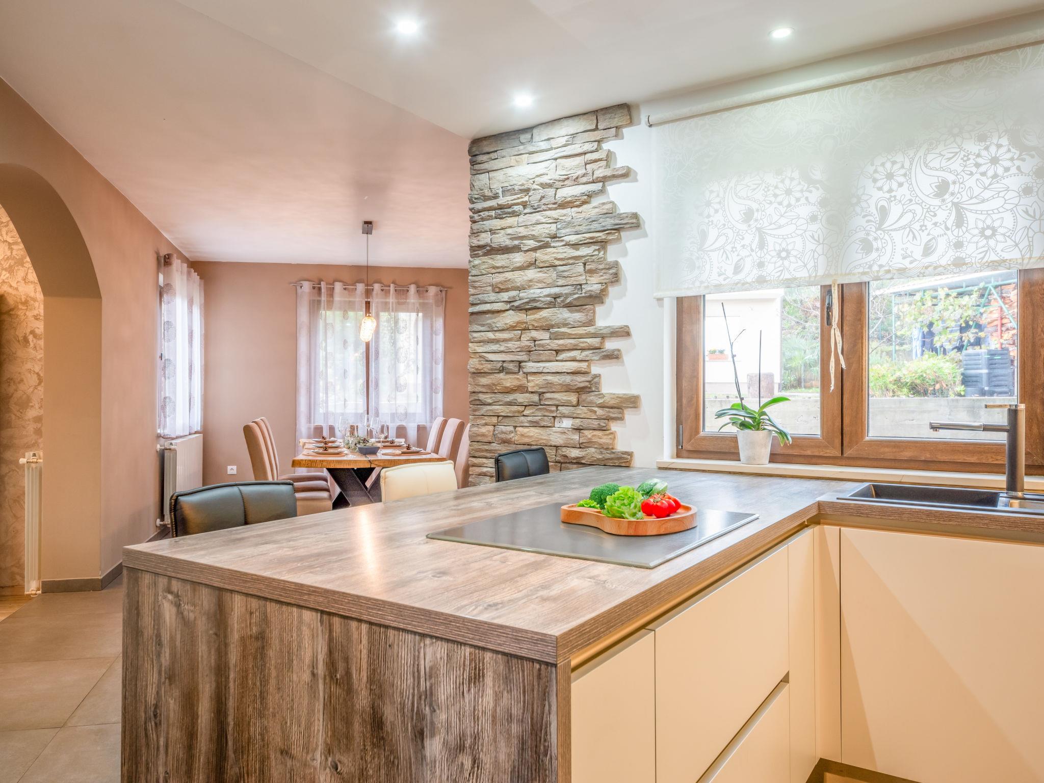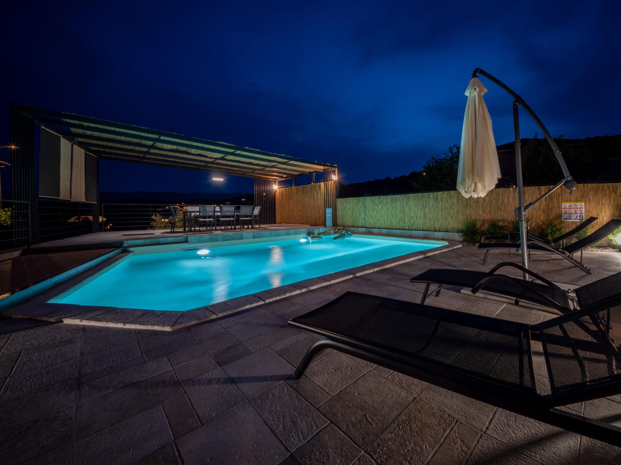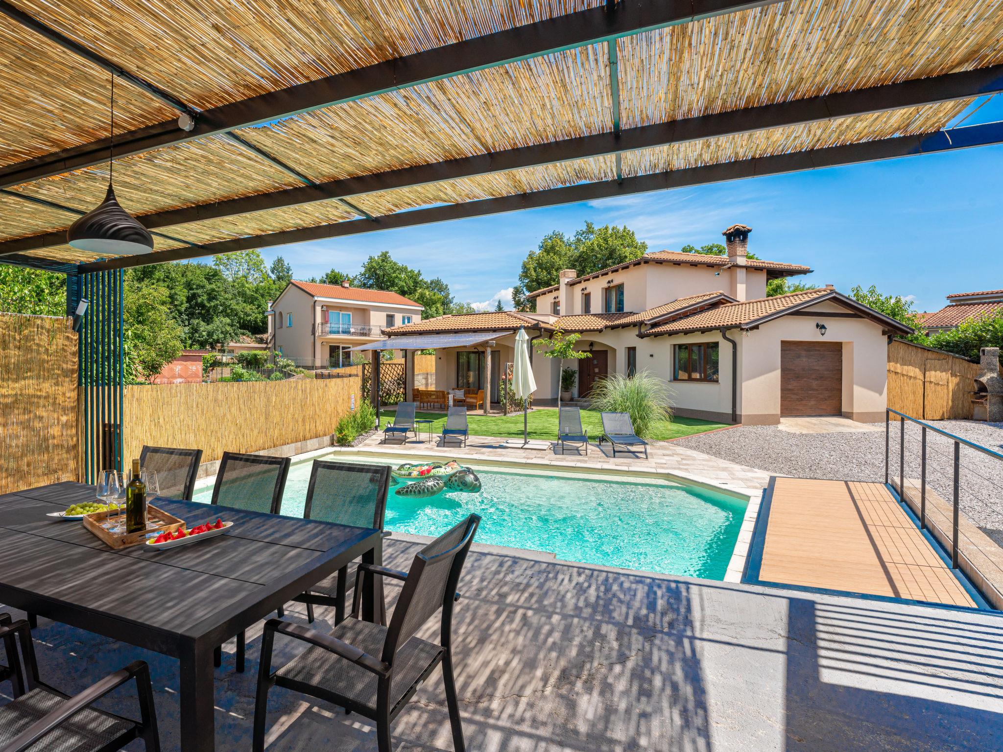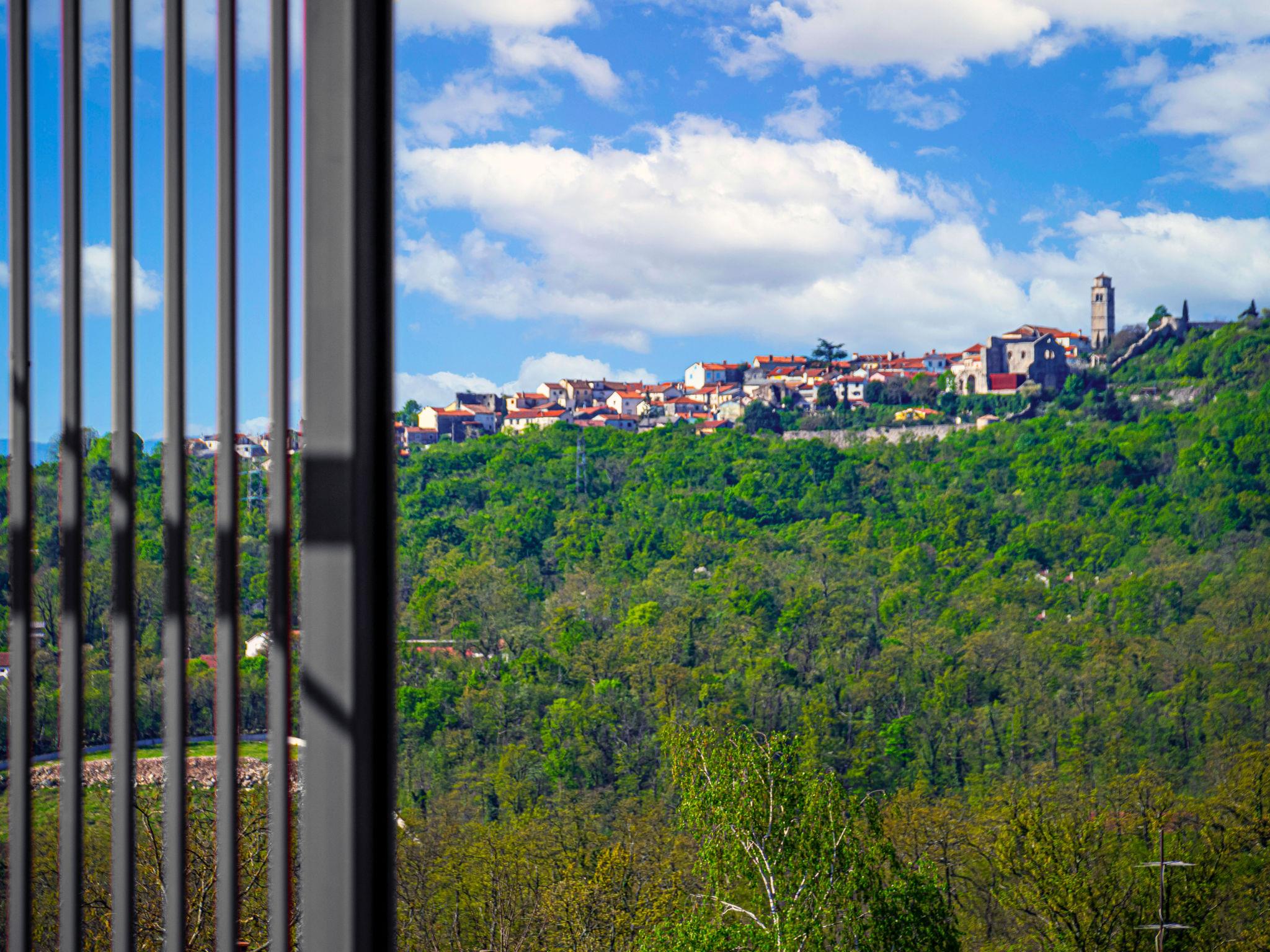 Kastav 6 km from Opatija: Comfortable single-family house "Campanero", 2 storeys, built in 2023. In the hamlet Kudeji 2.4 km from the centre of Viškovo, 3.7 km from the centre of Kastav, 9 km from the centre of Opatija, in a sunny, elevated position, 8 km from the sea, 8 km from the beach, in a cul-de-sac. Private: property 900 m2 (fenced), garden with lawn 300 m2, swimming pool angular (6 x 6 m, depth 140 cm, seasonal availability: 01.Jun. - 30.Sep.). WC in the pool area, outdoor shower, terrace, garden furniture. In the house: internet access. Parking at the house on the premises. Supermarket 2.4 km, shopping centre 2.4 km, restaurant 1.8 km, bakery 2.4 km, café 2.4 km, bus stop 160 m, pebble beach 8 km (small), outdoor swimming pool 10 km, indoor swimming pool 10 km, public bathing area 10 km, concrete beach 8 km. Nearby attractions: Kuca halubajskega zvoncara UNESCO 2 km. Groups of teenagers on request only. Part of the house is closed and unoccupied. The owner runs dry dock marine services. By groups of young people double deposit is requested on arrival.