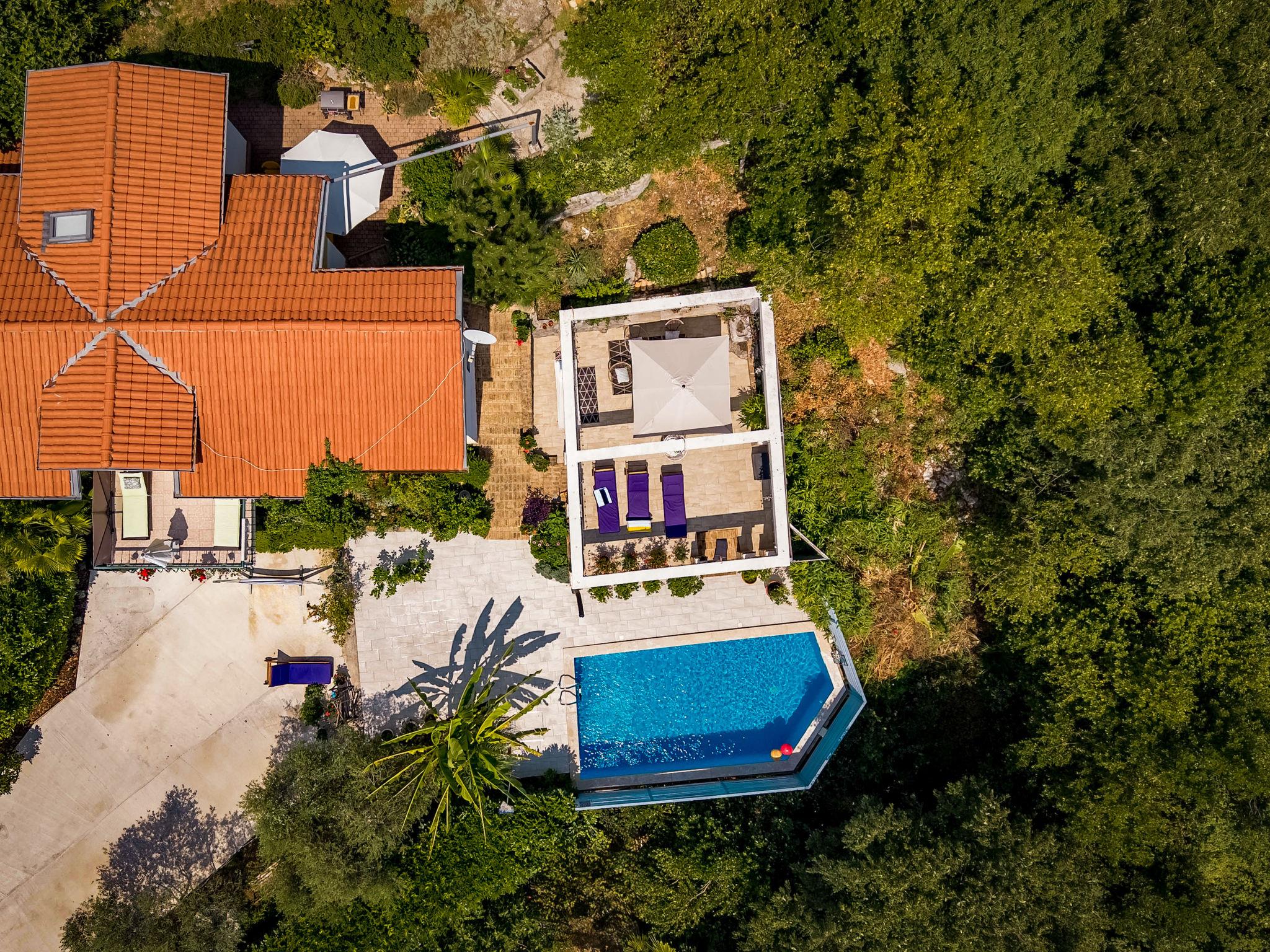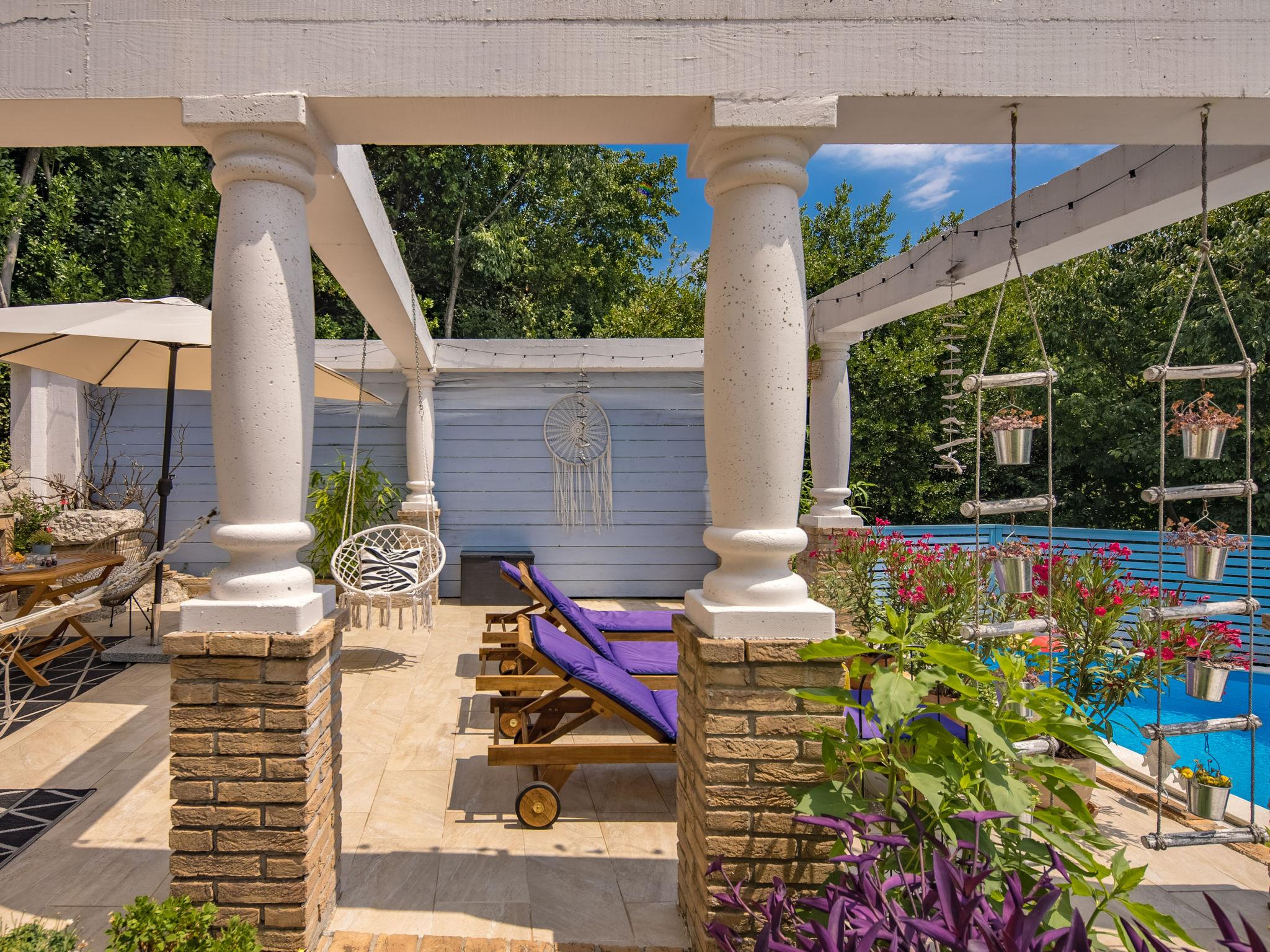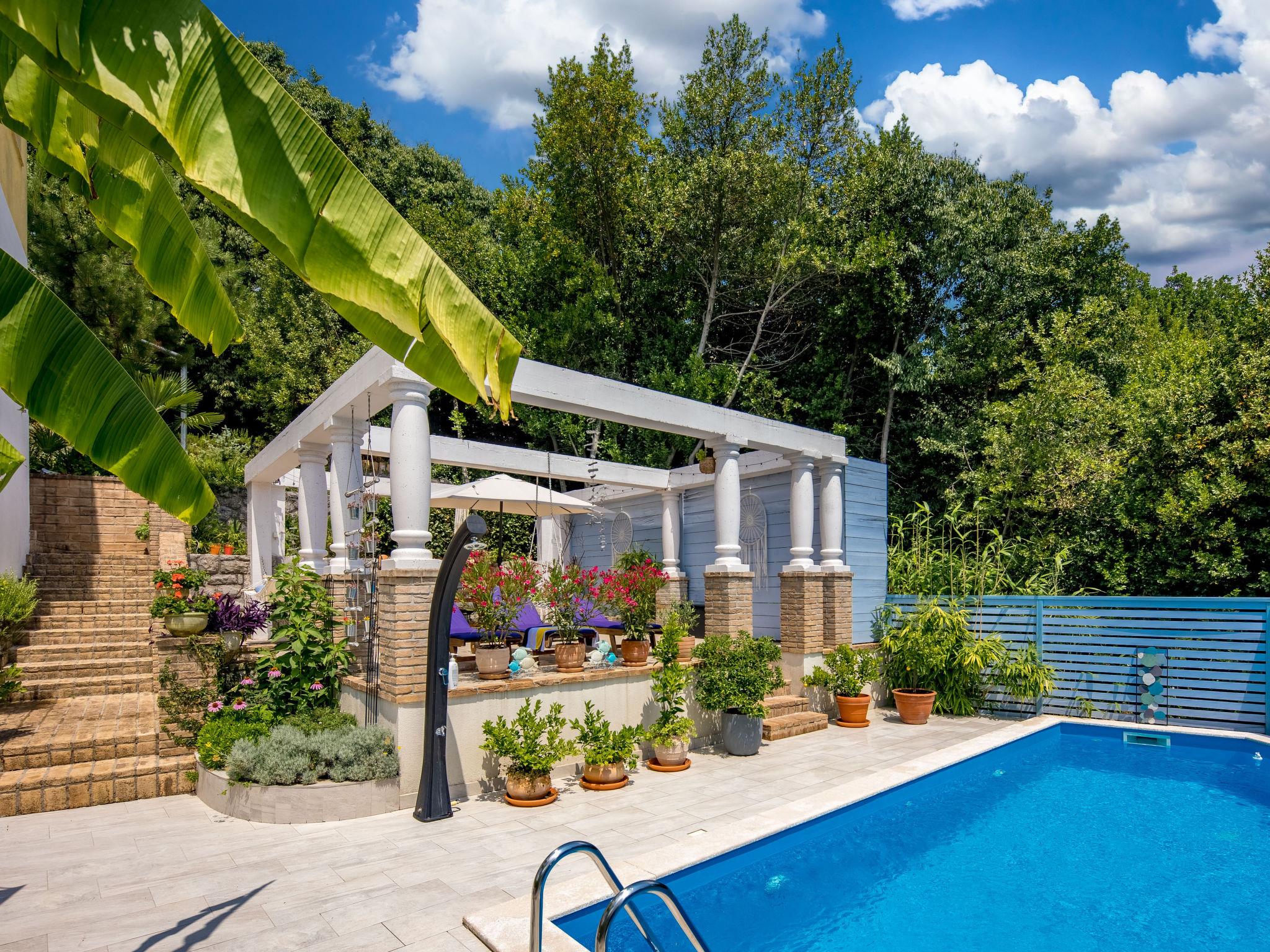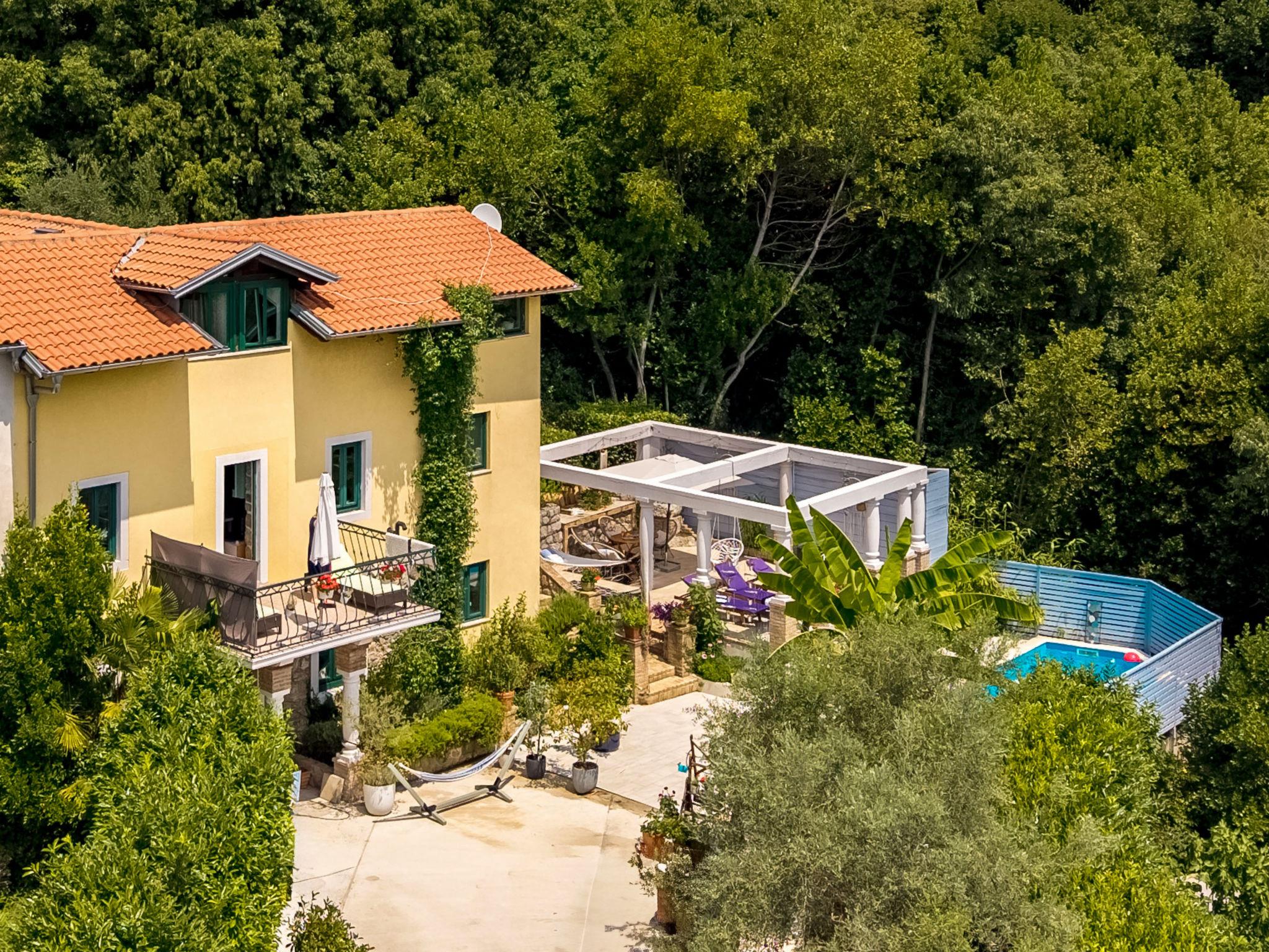 Semi-detached house "Nika", 2 storeys. 5 km from the centre of Opatija, 2 km from the centre of Kastav, 1 km from the centre of Matulji, in a quiet, sunny position, 4 km from the sea, 4 km from the beach, in the countryside. Private: property 950 m2 (fenced) with beautiful garden to relax, swimming pool (7 x 4 m, depth 150 cm, seasonal availability: 01.May. - 01.Oct.) with internal staircase and salt-electrolysis pool-cleaning system. Unconventional pool shape. Outdoor shower, terrace (50 m2), garden furniture, barbecue. In the house: internet access, washing machine, tumble dryer. Parking (for 2 cars) at the house on the premises. Supermarket 600 m, restaurant 500 m, bus stop 650 m, pebble beach 4 km, public bathing area 4 km, concrete beach 4 km. Part of the house is closed and unoccupied.