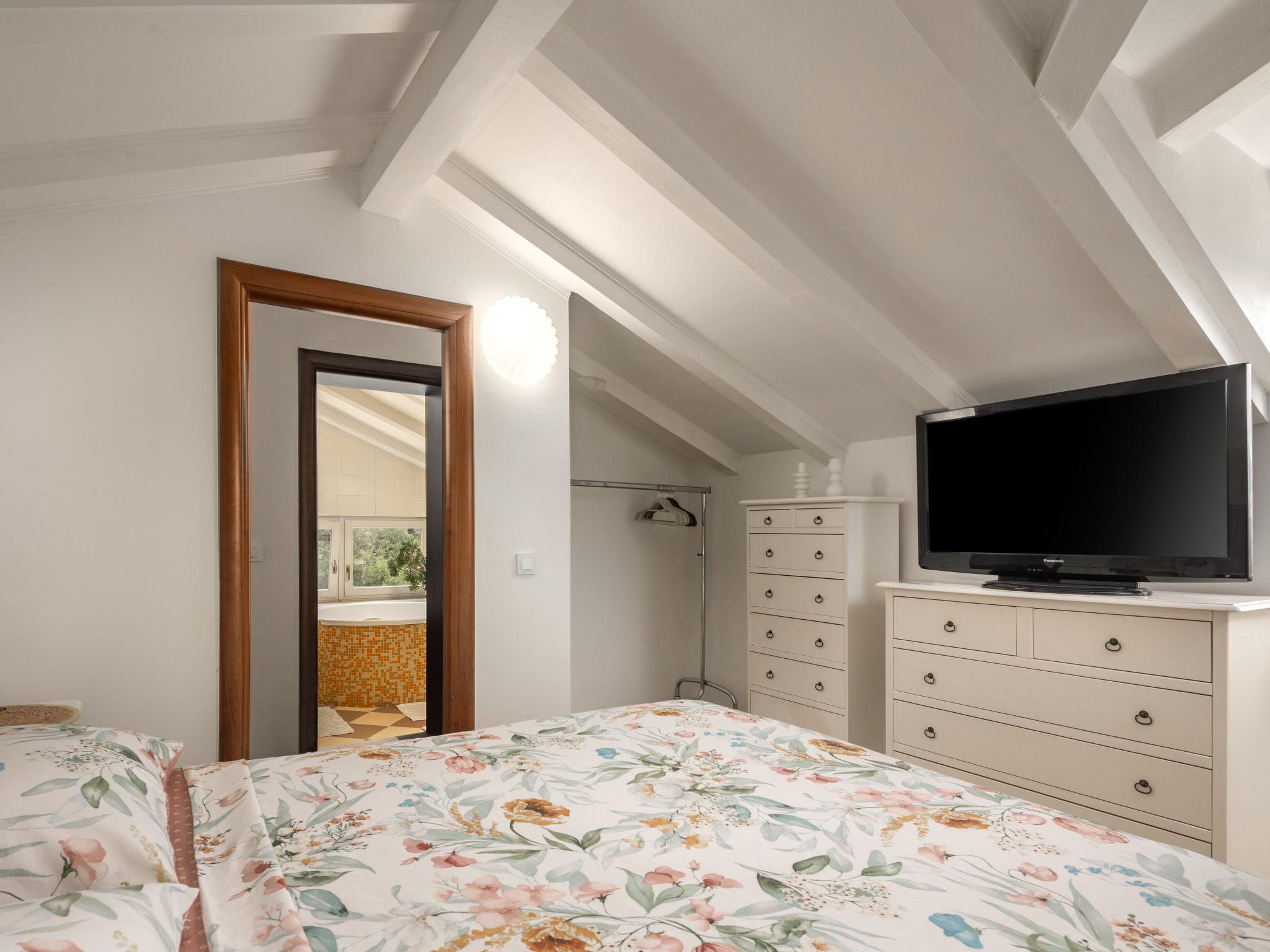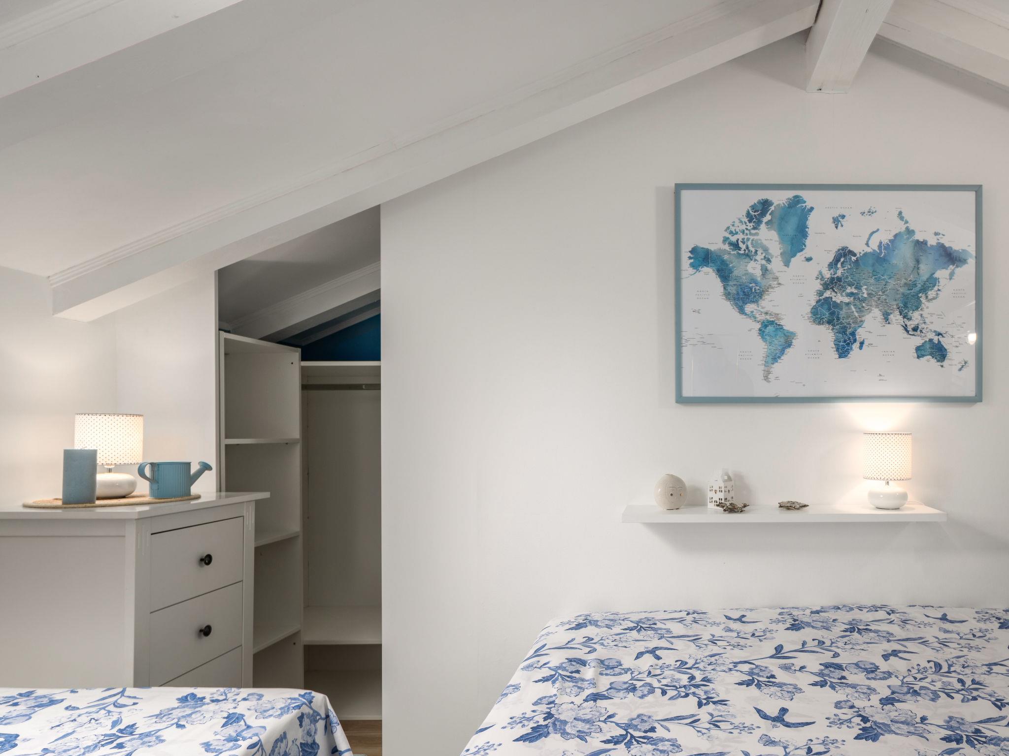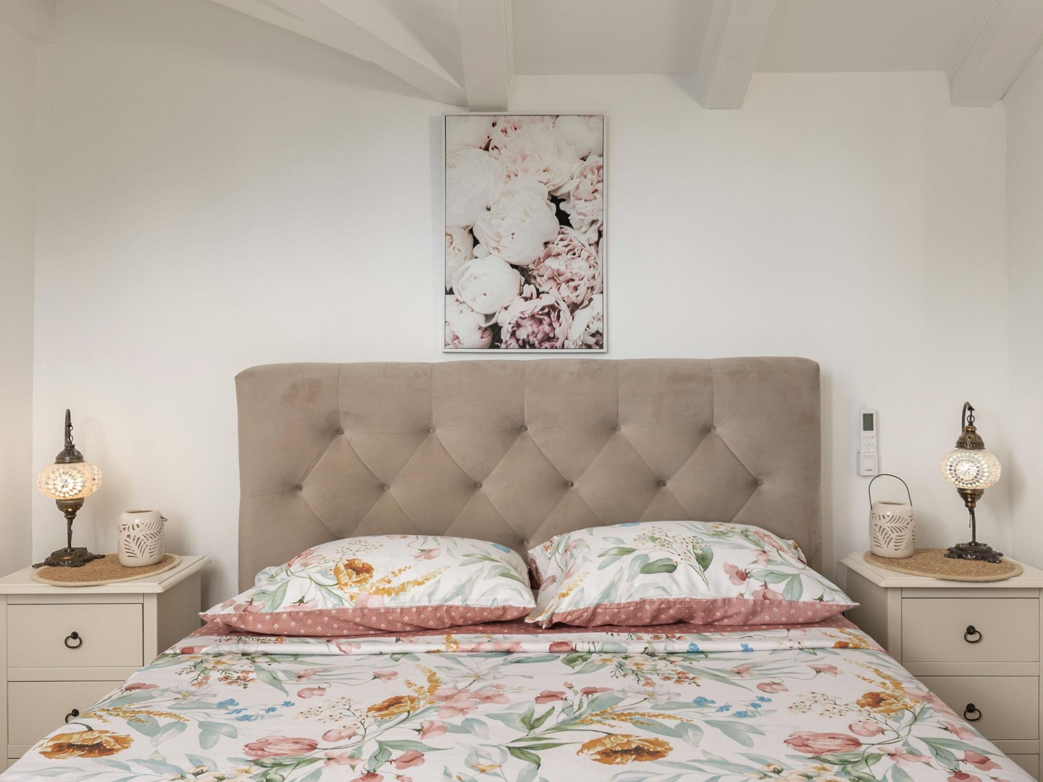 3-room semi-detached house 110 m2 on 2nd floor. Beautiful and tasteful furnishings: living/dining room with satellite TV and air conditioning. Exit to the balcony. Open kitchen (oven, dishwasher, 4 ceramic glass hob hotplates, toaster, freezer, electric coffee machine). Sep. WC. Top floor: entrance hall with sloping ceilings, ceiling height 160 - 240 cm. 1 room with sloping ceilings, ceiling height 160 - 240 cm with 2 beds (90 cm, length 200 cm), air conditioning. 1 room with sloping ceilings, ceiling height 160 - 240 cm with 1 double bed (160 cm, length 200 cm), air conditioning. Bath/WC. No heating option. Balcony 12 m2, terrace 42 m2. Terrace furniture, deck chairs. Partial view of the sea. Facilities: hair dryer. Internet (WiFi, free). Suitable for families. 1 small pet/ dog allowed. 2717/XIV