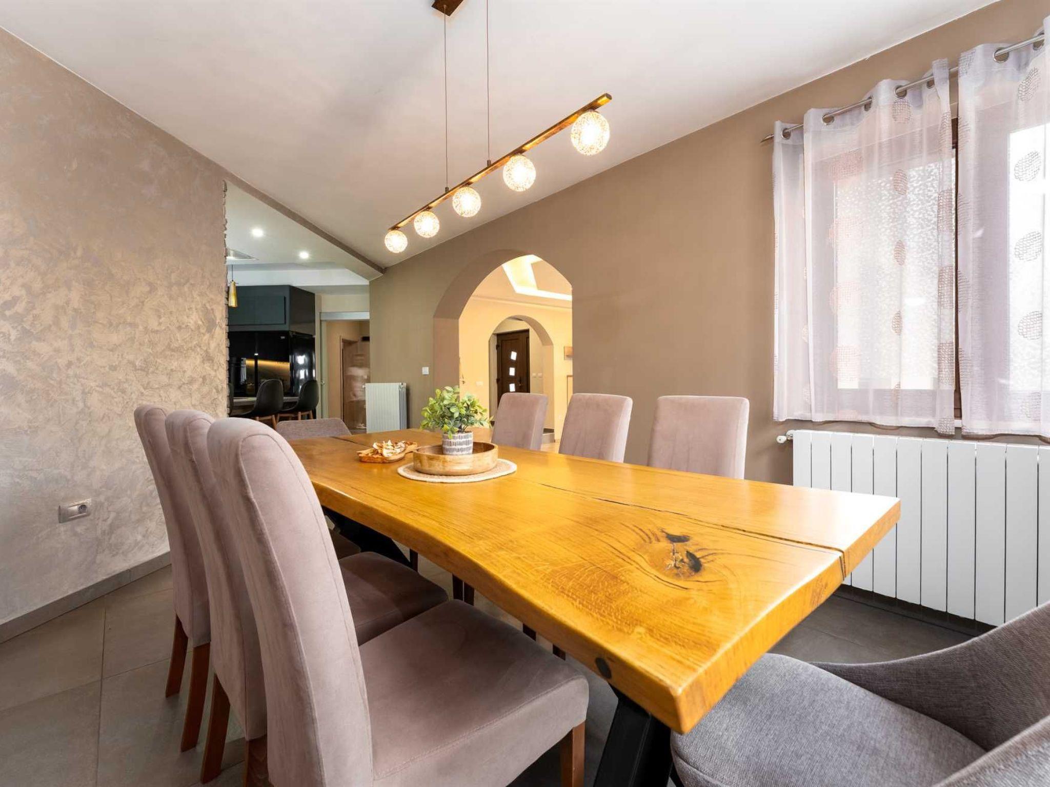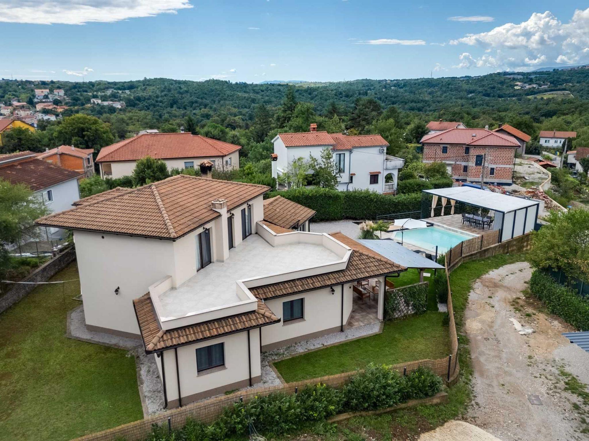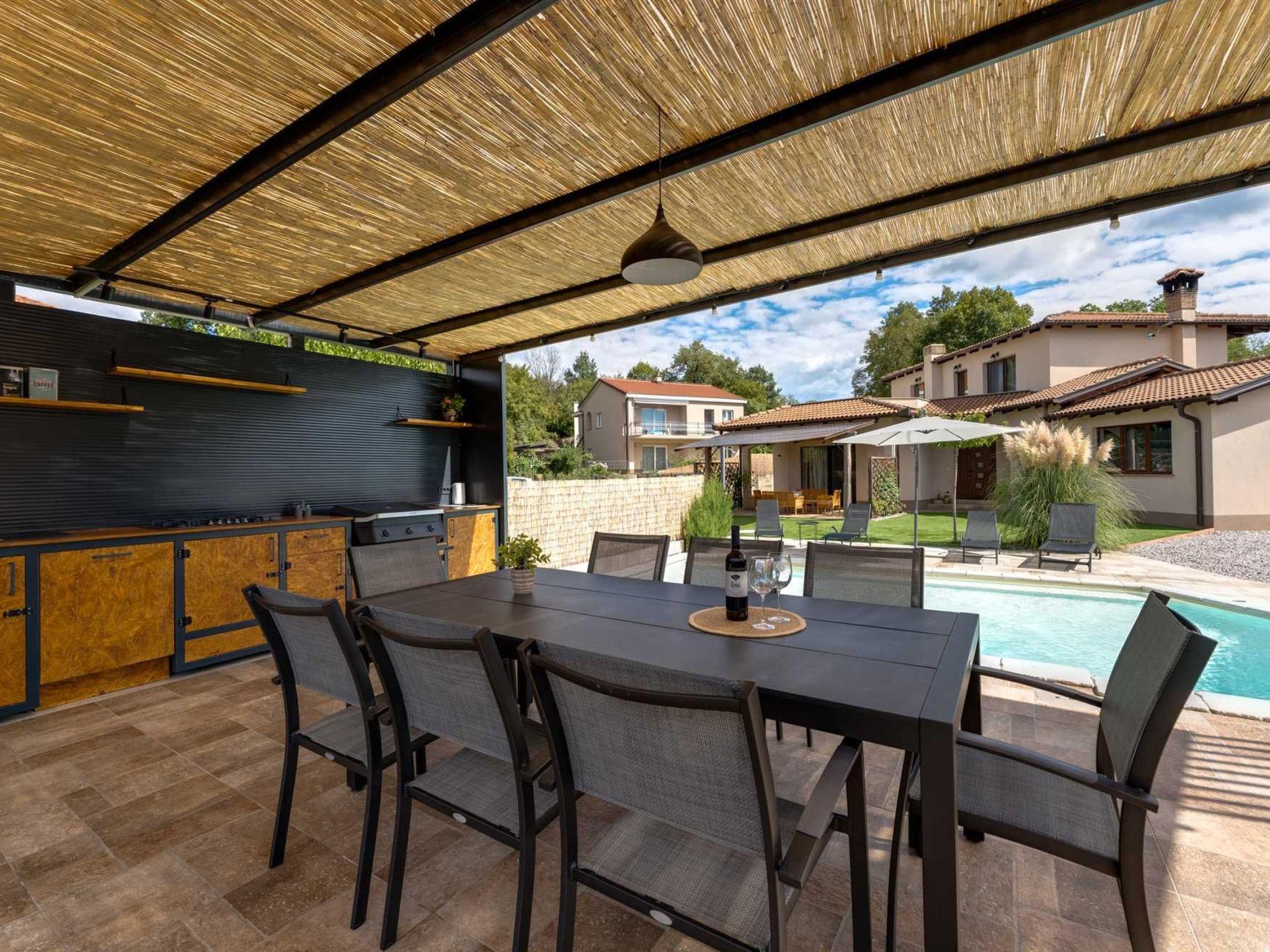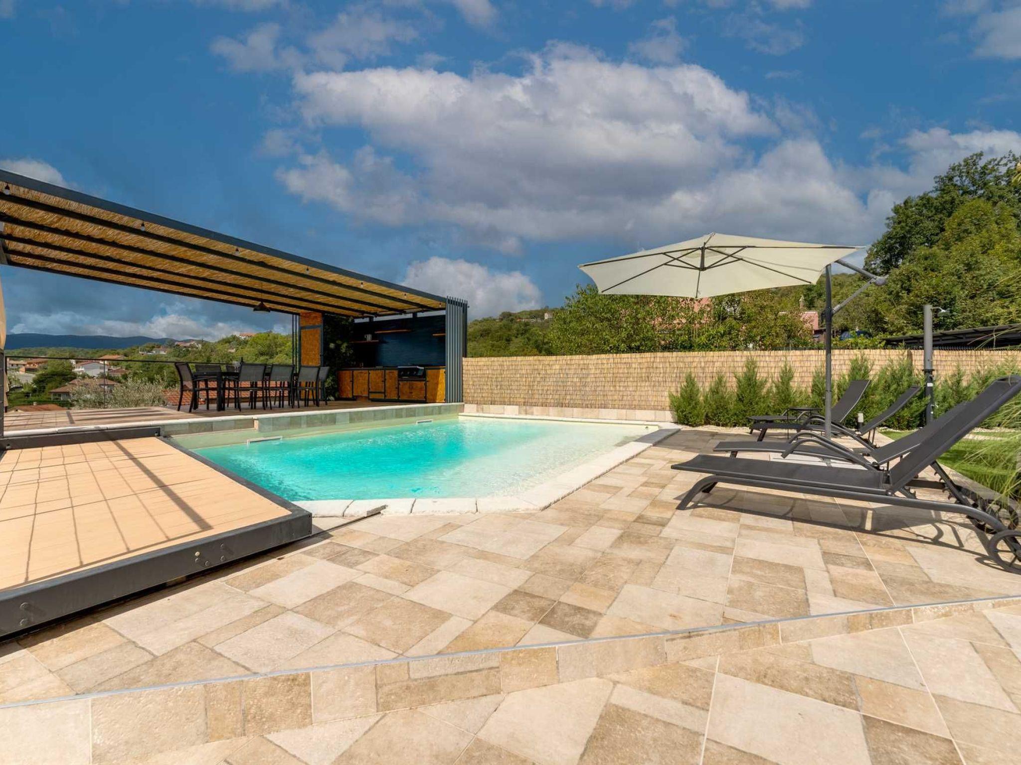 For your next holidays, book this spacious and beautifully decorated 4-bedroom villa with 2 bathrooms, one on each floor. Perfect for family holidays, gatherings with friends, or anyone looking to unwind in style. Whether you're cooking, relaxing, or swimming, this holiday home offers everything you need to make every moment special. Relax on sunbeds under sun umbrellas, enjoy outdoor meals on the shaded terrace with garden furniture, or host unforgettable gatherings in the BBQ house. Another stunning covered terrace of 30 m² with distant views of historic town Kastav. And another huge terrace on the upper floor, accessible from 2 bedrooms and a hallway.