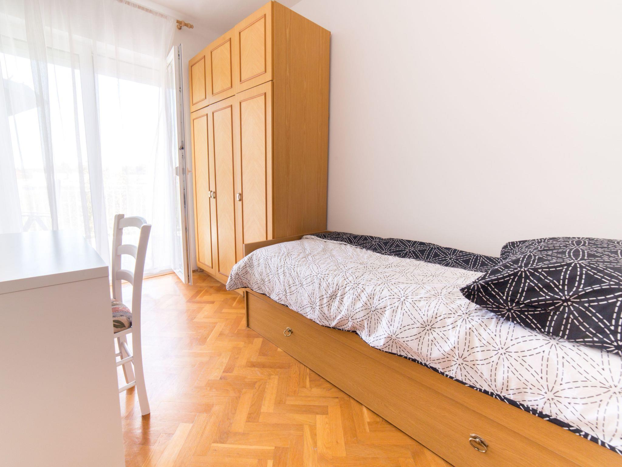 There are a total of seven holiday apartments in the three-storey building. This apartment with a living space of 55m2 is on the first floor. It consists of a spacious kitchen and living room, two bedrooms, a bathroom and a big balcony. The kitchen is fully equipped, the living room consist of a sofa bed (double bed for two persons), satellite TV and air conditioning. One bedroom contains a double bed (180 × 200), wardrobe, work desk and also has air conditioning. The second bedroom has bed for one person, wordrobe and desk. Free WiFi is avialable in whole apartment.