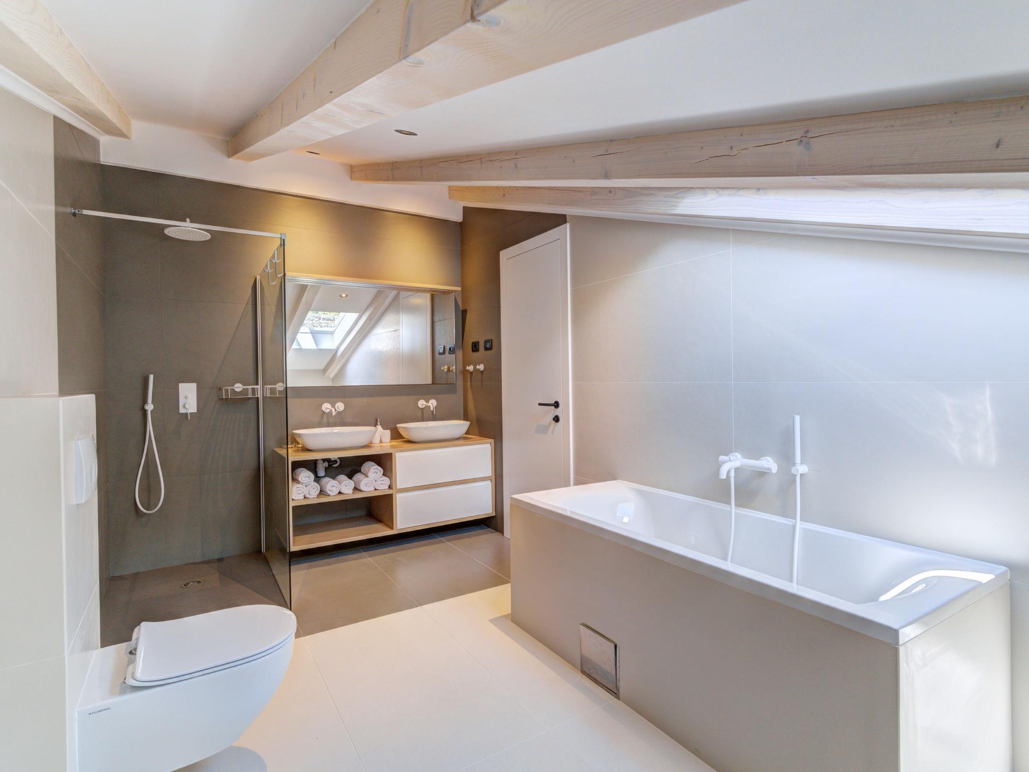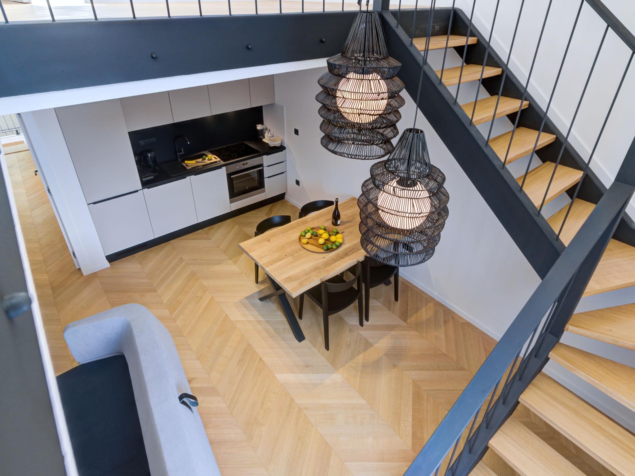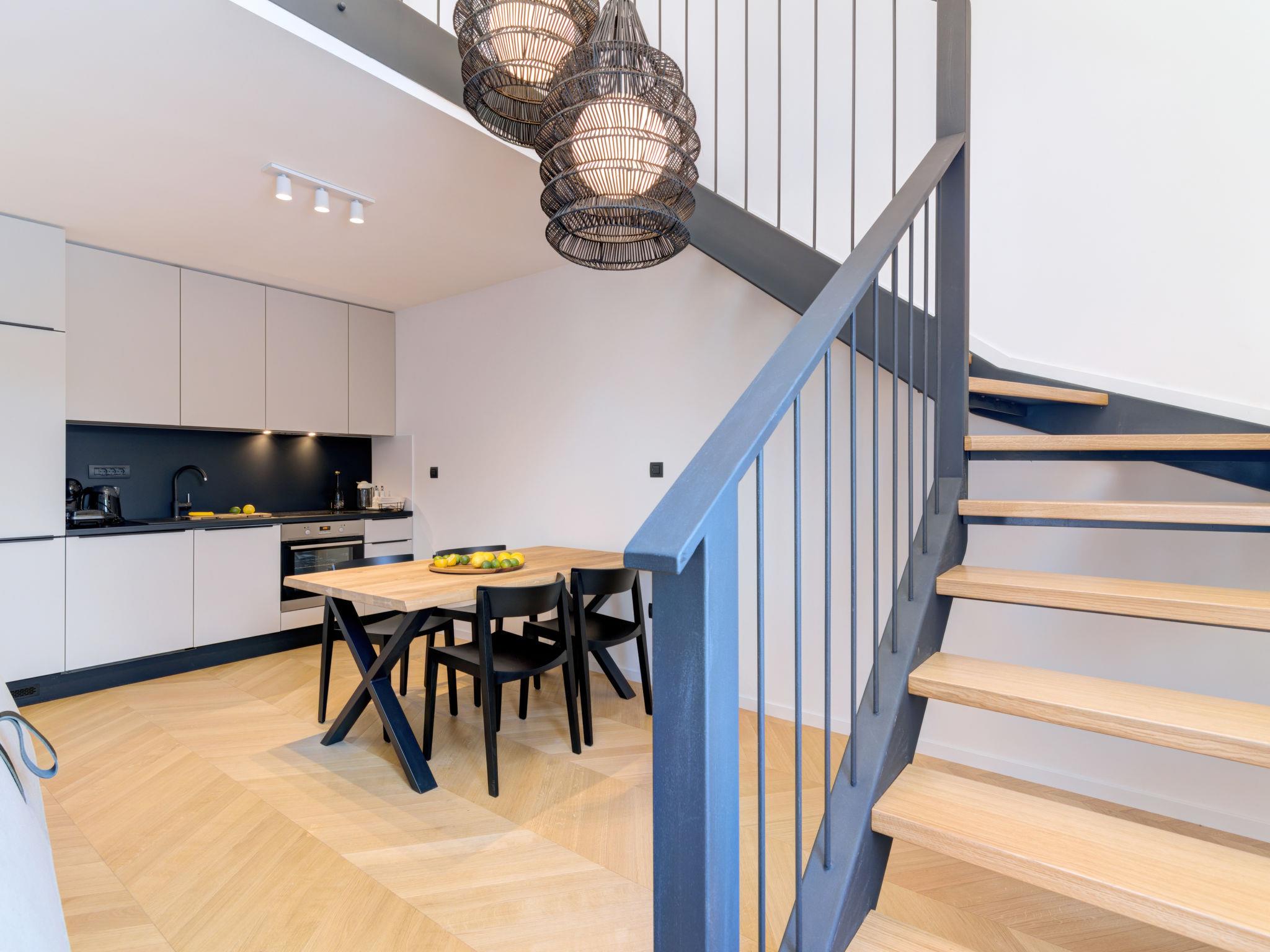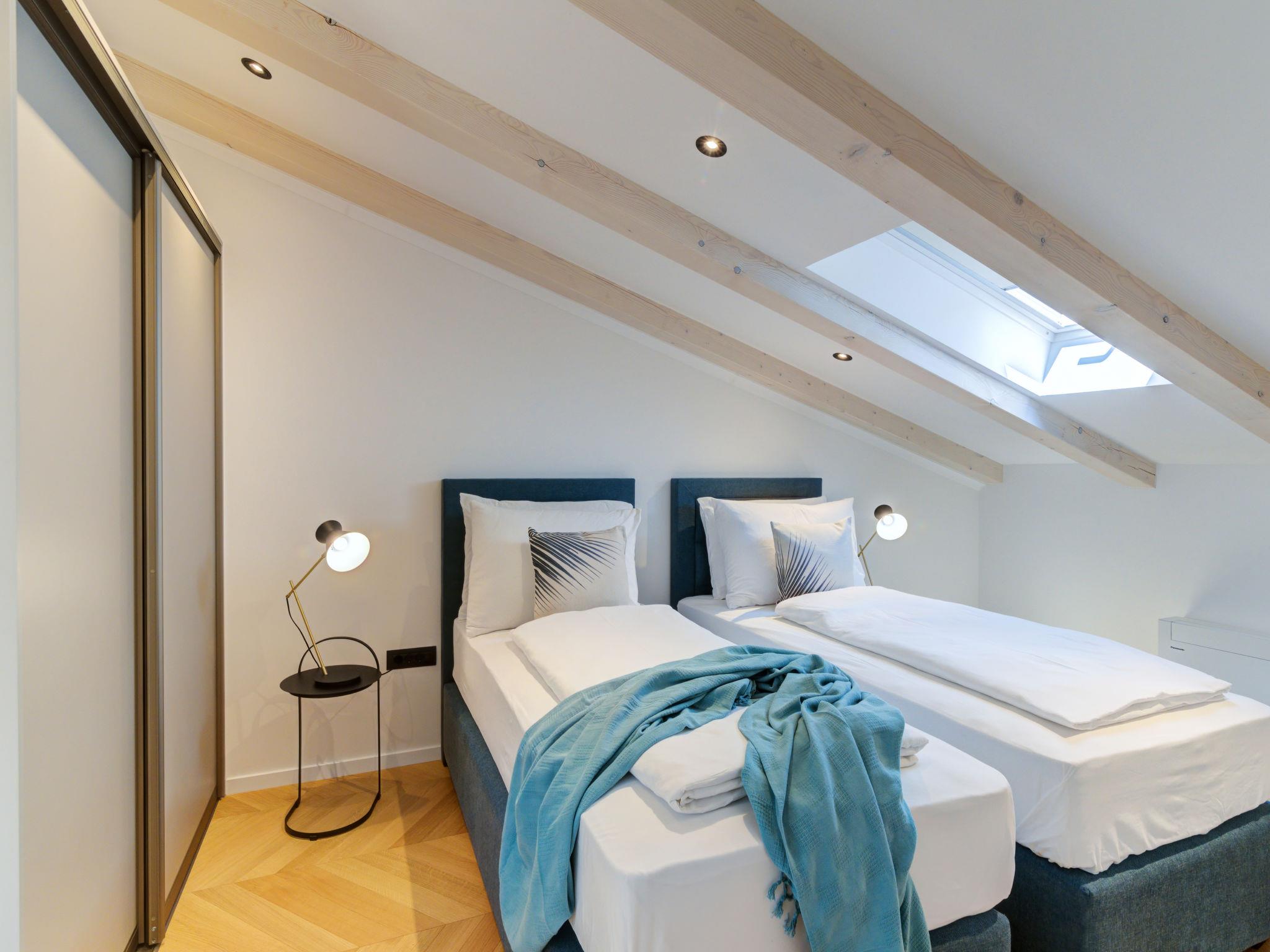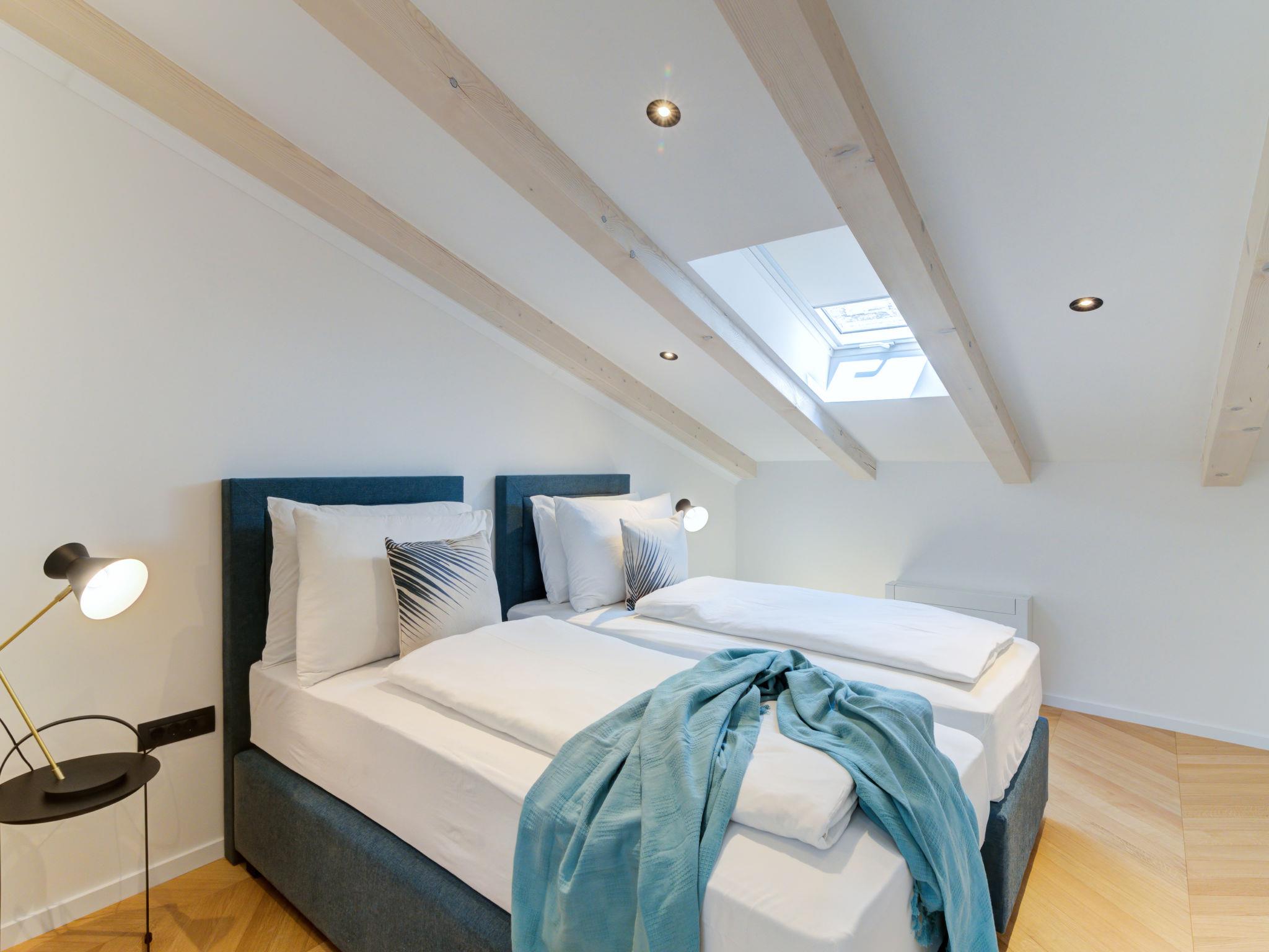 3-room apartment 100 m2, on the top floor. Modern furnishings: living/dining room with 1 double sofabed (160 cm, length 210 cm), satellite TV (flat screen), air conditioning. 1 room with 1 french bed (160 cm, length 200 cm), air conditioning. Open kitchen (oven, dishwasher, 4 induction hot plates, toaster, kettle, microwave, freezer, electric coffee machine). Shower/WC. Top floor: 1 room with sloping ceilings, ceiling height 120 - 230 cm with 2 beds (90 cm, length 200 cm), air conditioning. Bath/shower/WC. Floor heating, forced-air heating. Beautiful view of the sea and the bay. Facilities: safe, iron, hair dryer. Internet (WiFi, free). Please note: non-smoking house. Fire extinguisher.