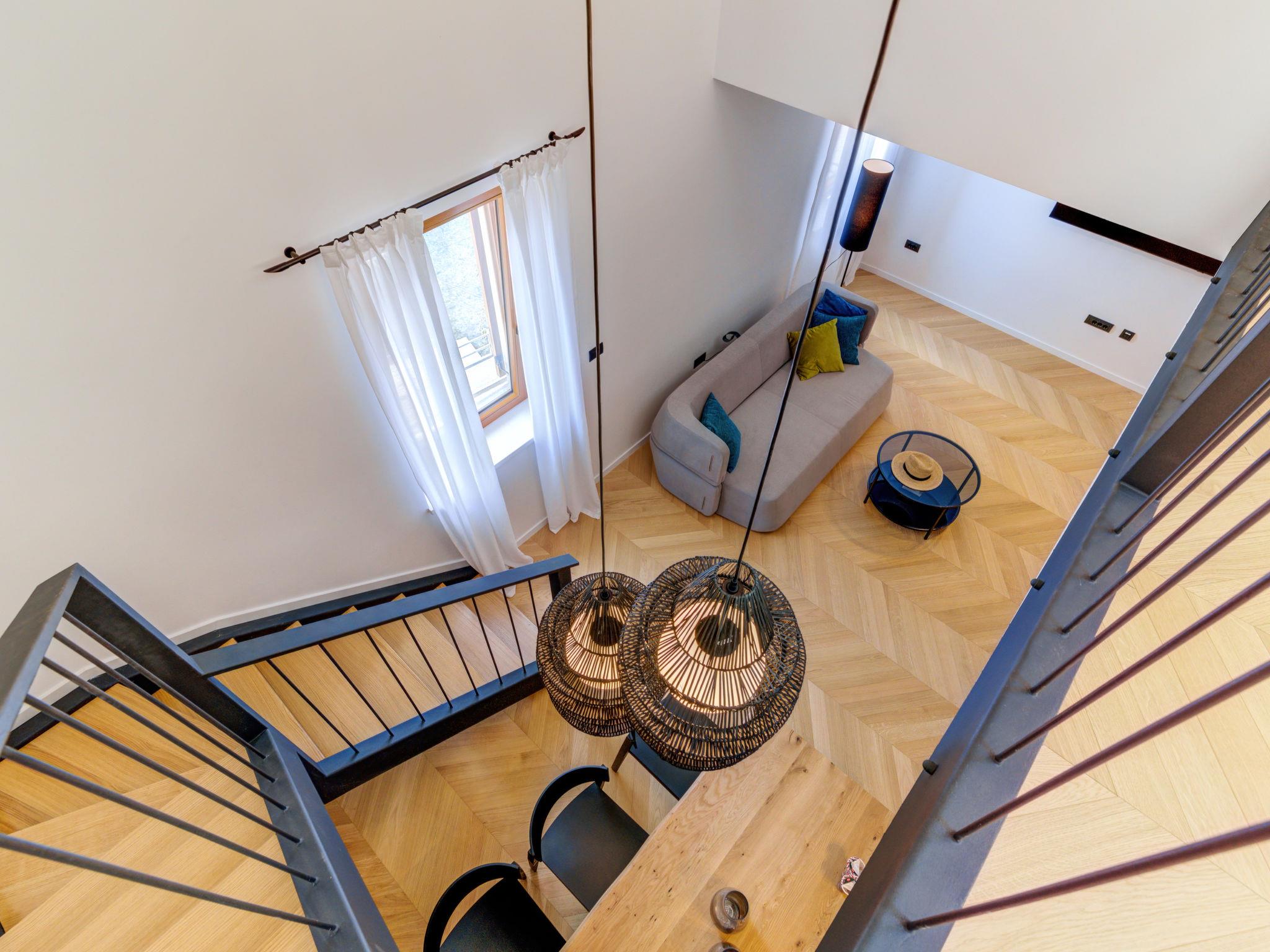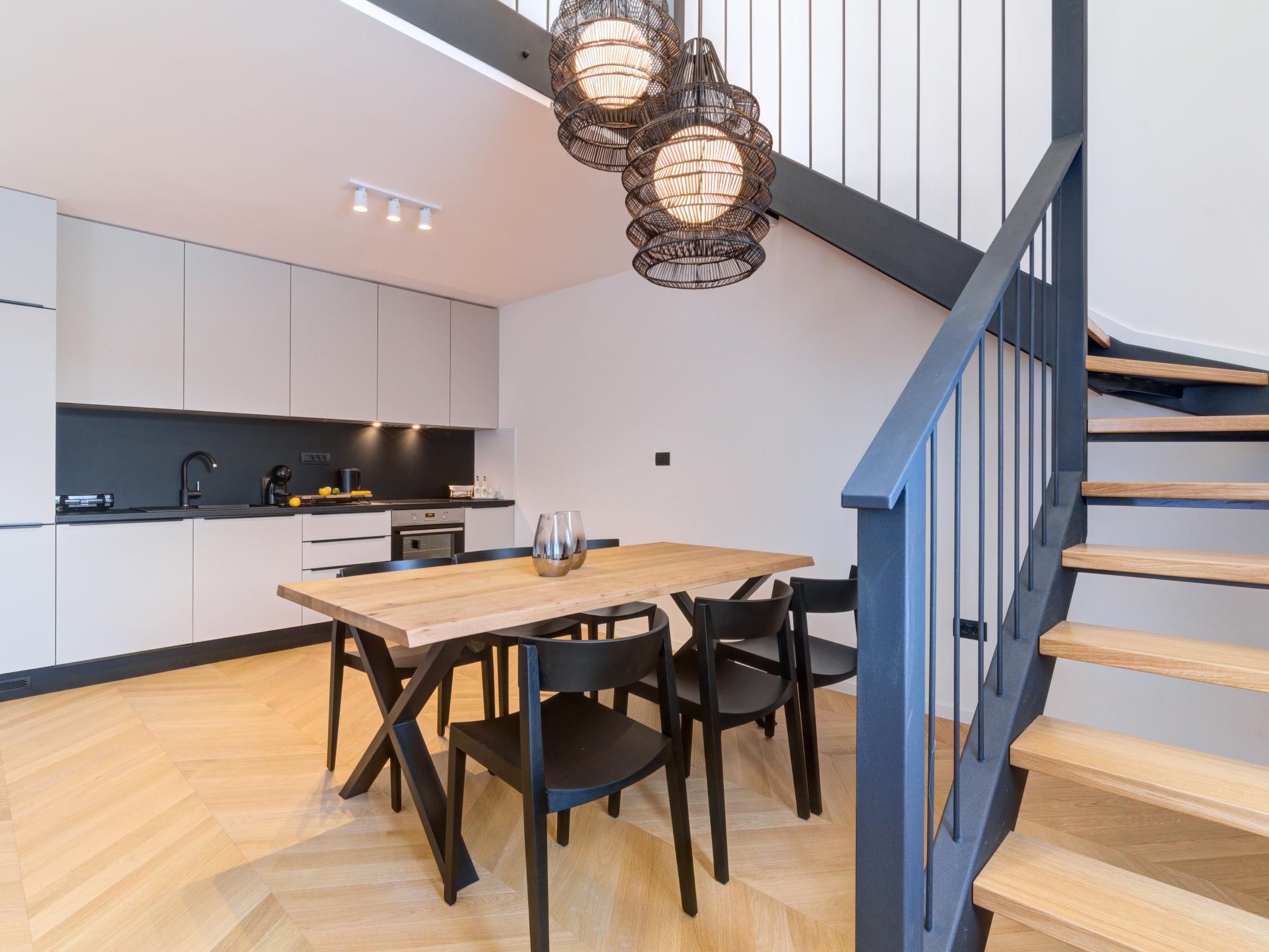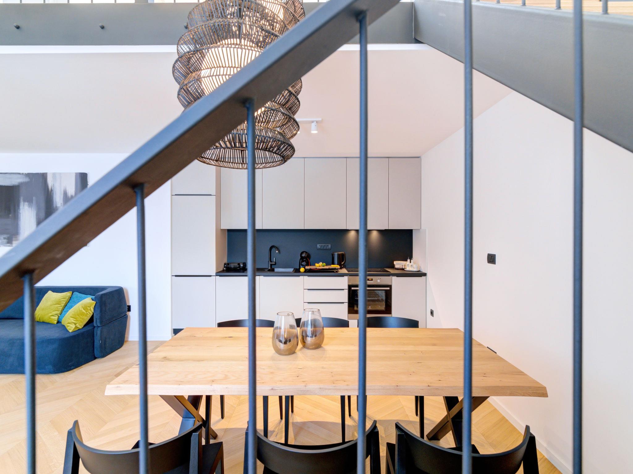 4-room apartment 133 m2, on the top floor. Modern furnishings: living/dining room with 1 double sofabed (160 cm, length 210 cm), satellite TV (flat screen), air conditioning. 1 room with 1 french bed (160 cm, length 200 cm), air conditioning. Open kitchen (oven, dishwasher, 4 induction hot plates, toaster, kettle, microwave, freezer, electric coffee machine). Shower/WC. Top floor: 1 room with sloping ceilings, ceiling height 120 - 230 cm with 2 beds (90 cm, length 200 cm), air conditioning. 1 room with sloping ceilings, ceiling height 120 - 230 cm with 1 french bed (160 cm, length 200 cm), air conditioning. Bath/shower/WC. Floor heating, forced-air heating. Beautiful view of the sea and the bay. Facilities: safe, iron, hair dryer. Internet (WiFi, free). Please note: non-smoking house. Fire extinguisher.