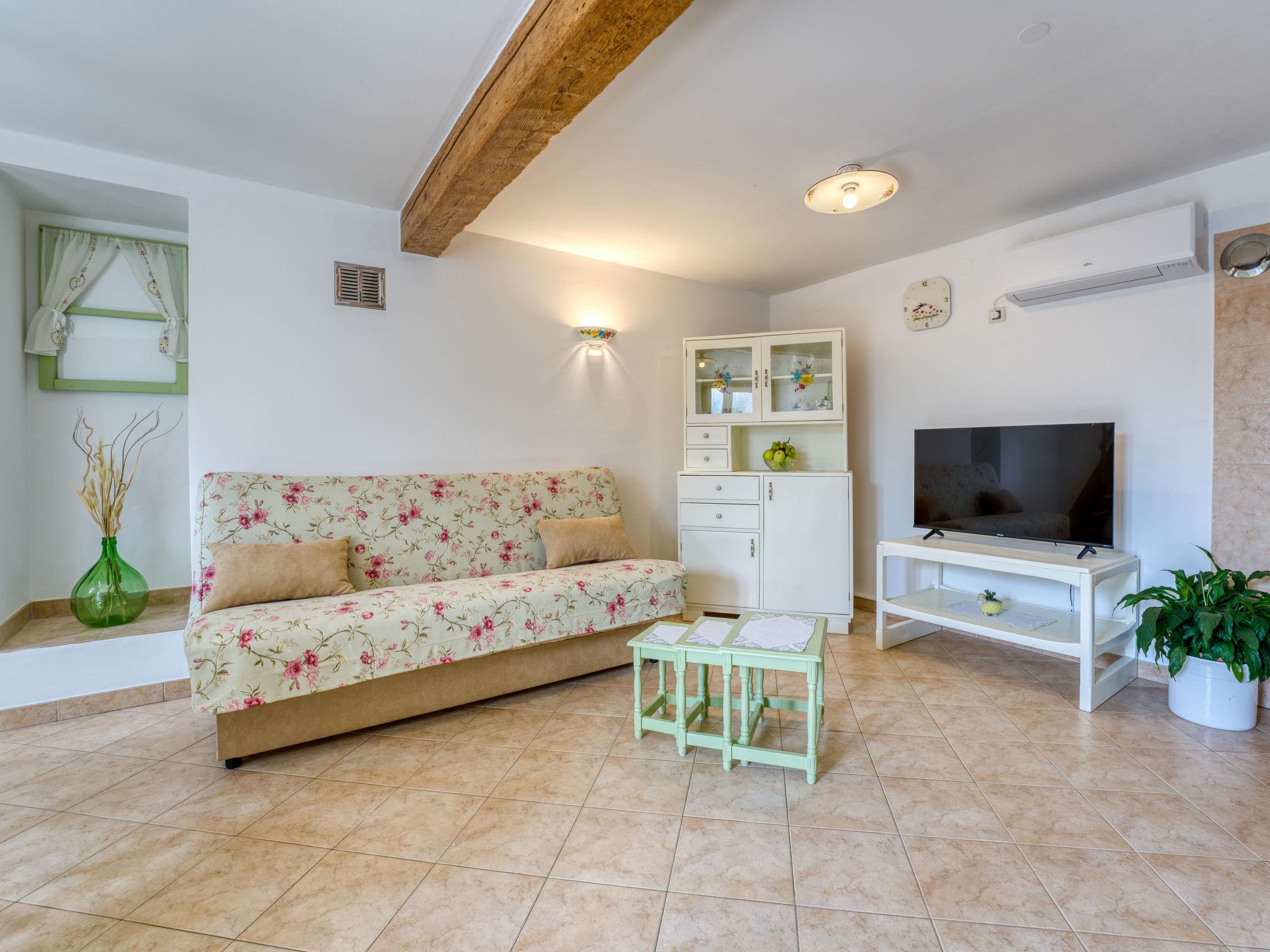 2-room apartment 36 m2 on 2 levels, on the ground floor. Rustic furnishings: living/dining room with 1 sofabed (100 cm, length 190 cm), satellite TV and air conditioning. Open kitchen (oven, 4 ceramic glass hob hotplates, kettle, electric coffee machine). Bath/WC. Forced-air heating (extra). Upper floor: (ladder), 1 open room with 1 double bed (2 x 90 cm, length 200 cm). Facilities: washing machine. Internet (WiFi, free). Please note: private entrance. Instead of an enclosed bedroom, some sleeping areas are located in an open-plan area (gallery, alcove, etc.). URBROJ: 2170-08-02/25-23-3