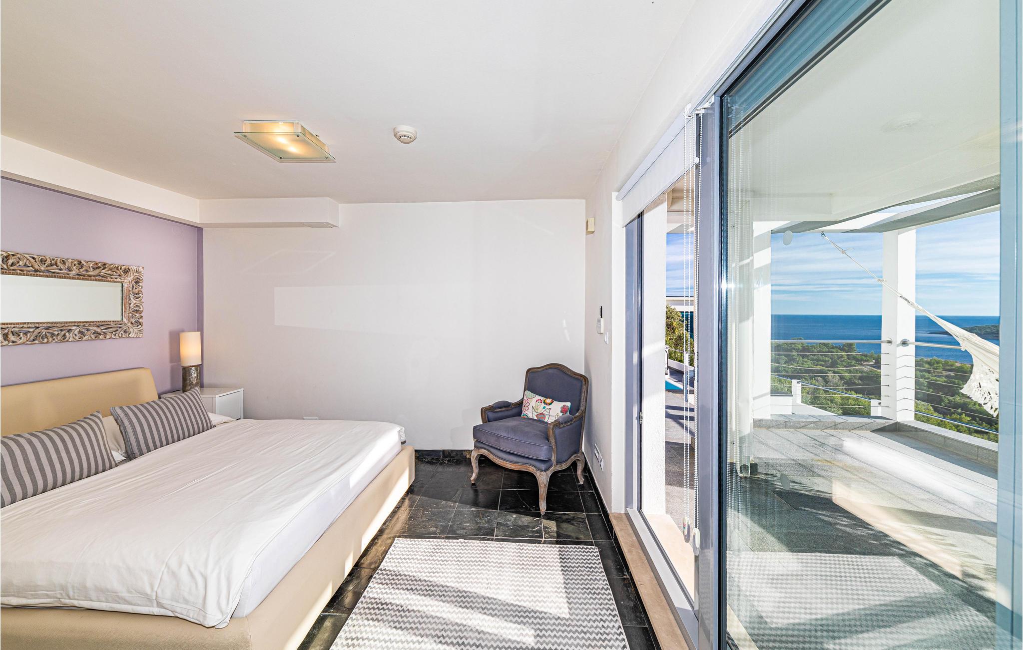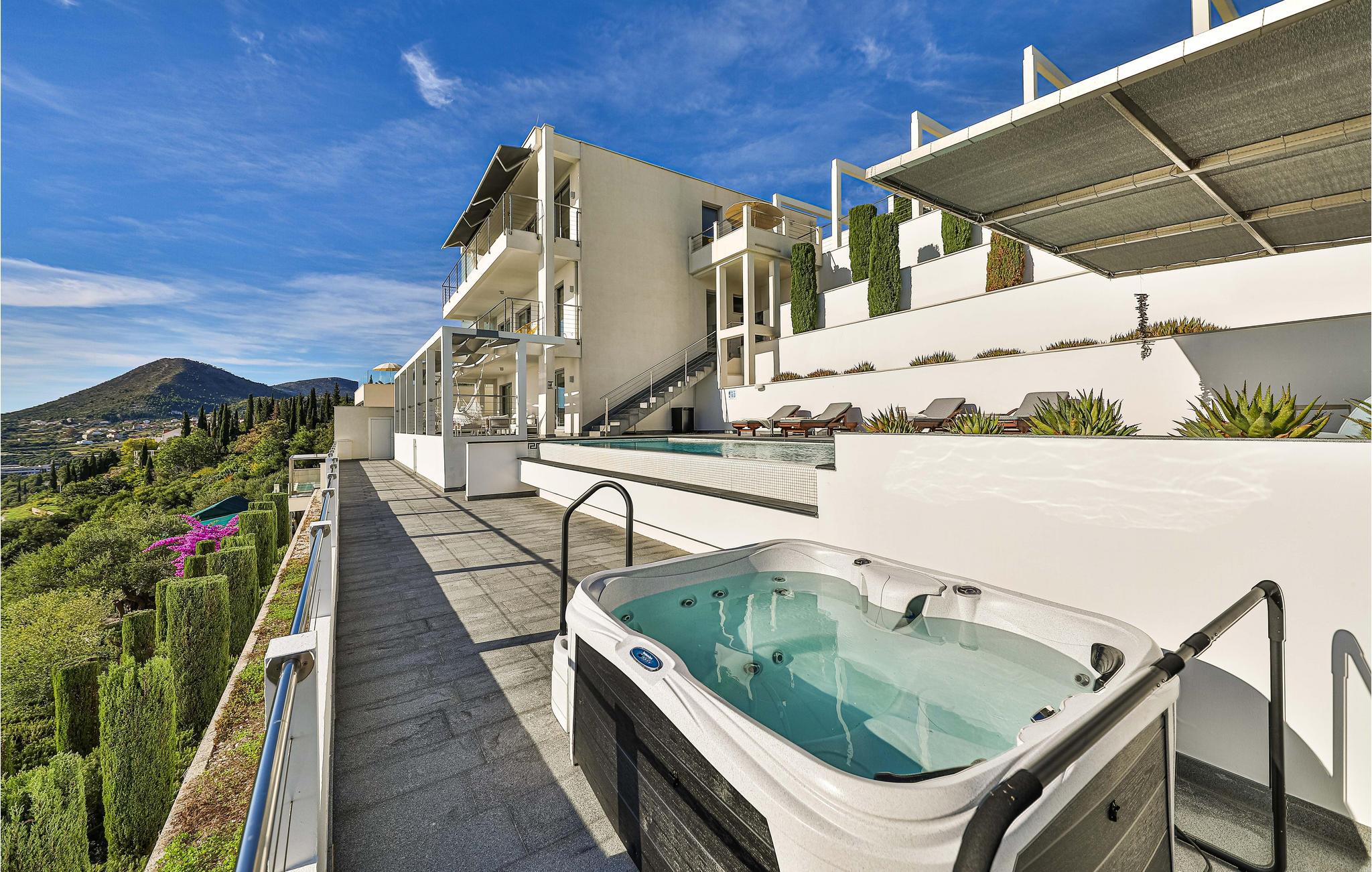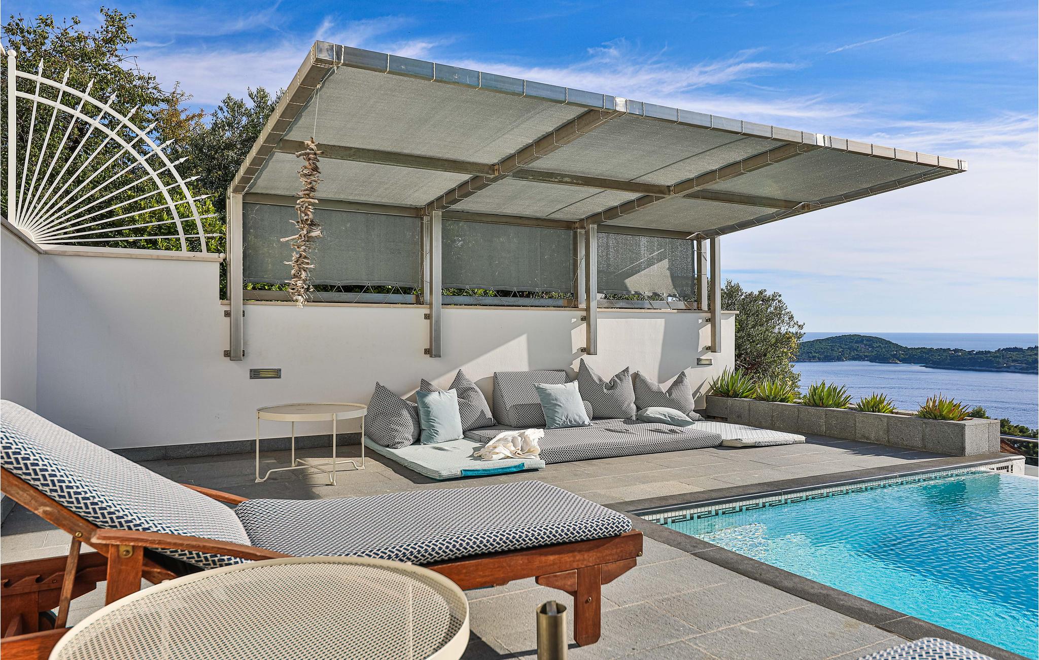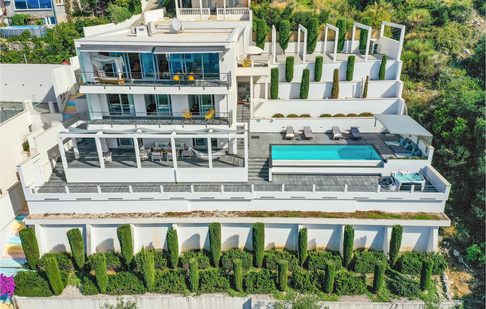 Den treetagers villa og grunden er anlagt i terrasser. Der er god plads til, at alle feriegæster kan nyde privatliv. I har adgang til en terrasse med opvarmet pool, hvorfra du kan nyde en smuk havudsigt. Alt her udstråler en særlig, næsten luksuriøs charme, så glæd jer til at tilbringe ferien sammen her.