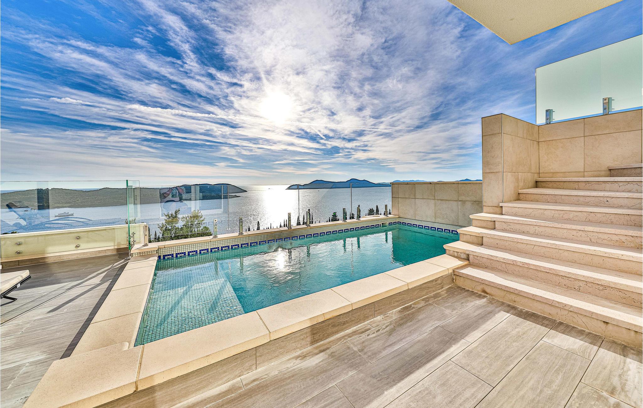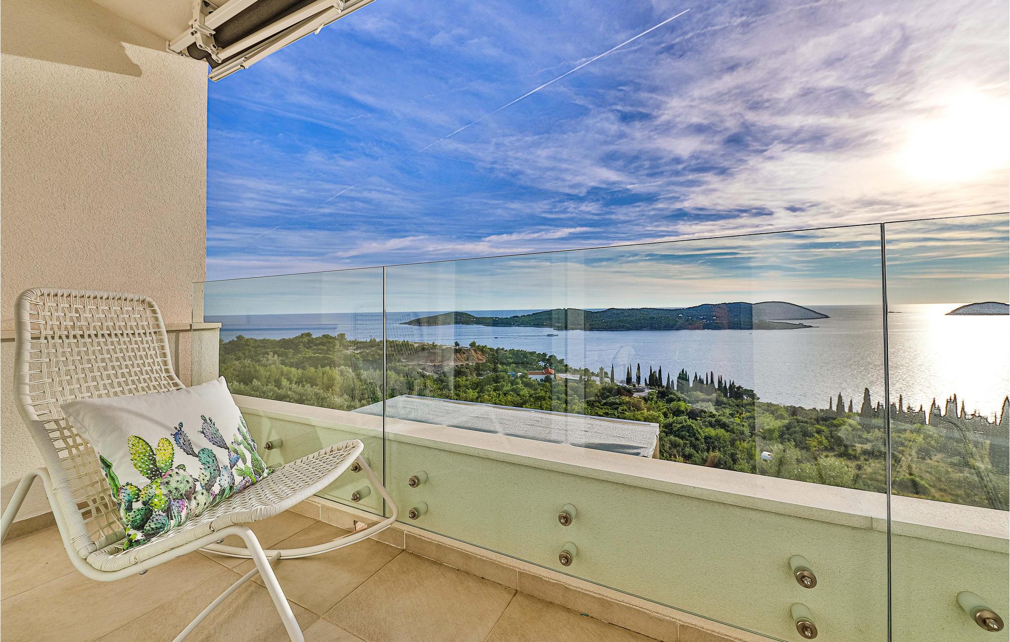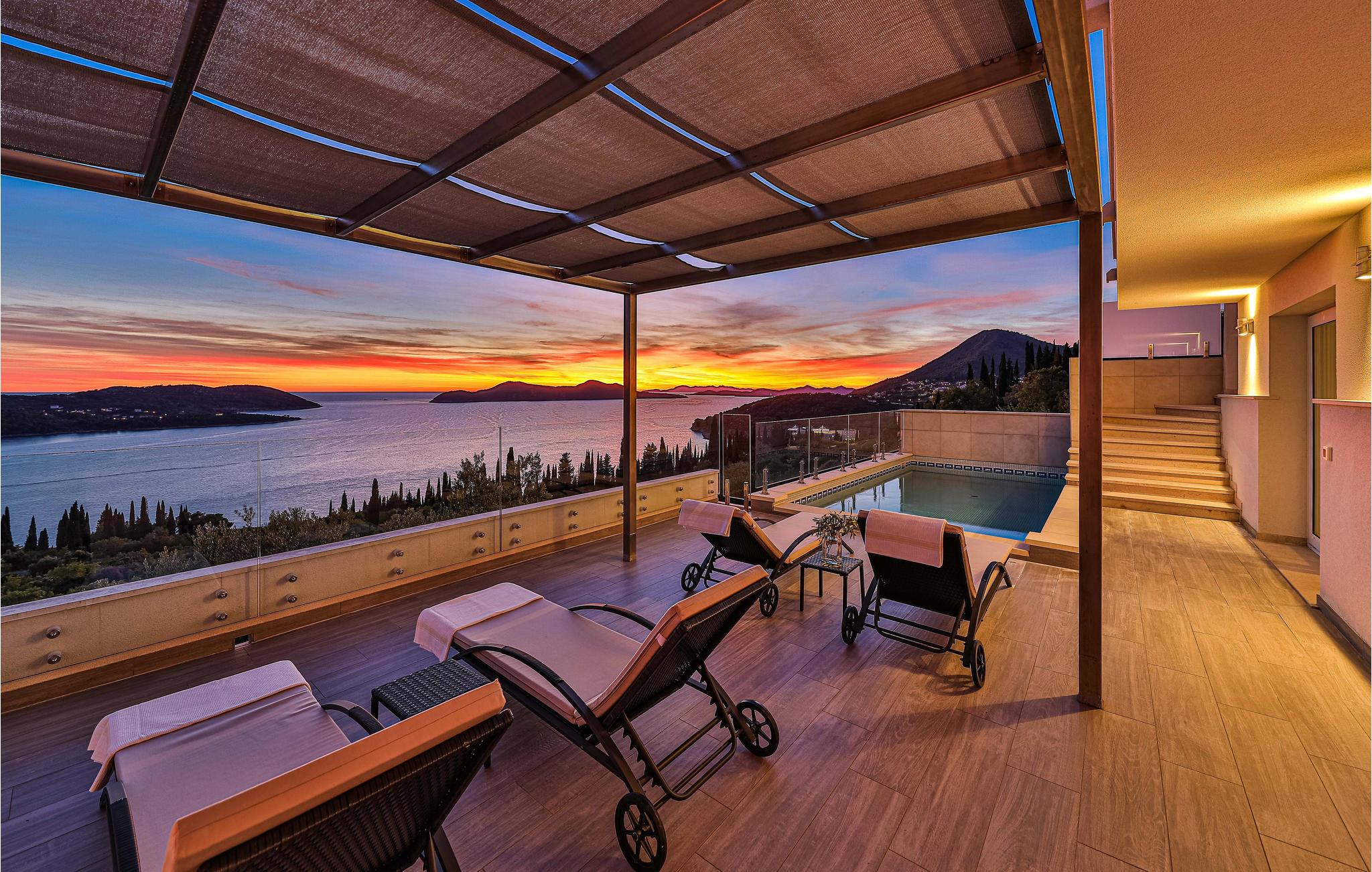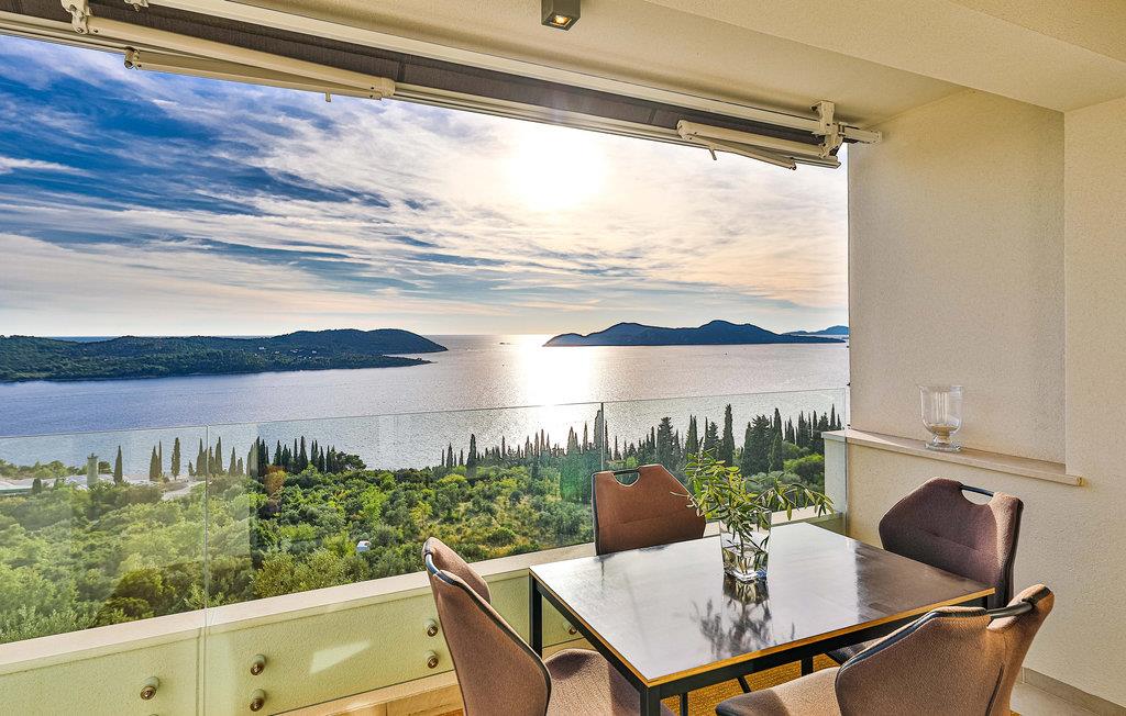 Villaen i to etager har fine soveværelser og en solrig tagterrasse, hvor I kan slappe af og komme ned i gear. Fra den rummelige terrasse kan I nyde en smuk panoramaudsigt over havet. I har også egen swimmingpool, og øen Kolocep ligger også tæt på.