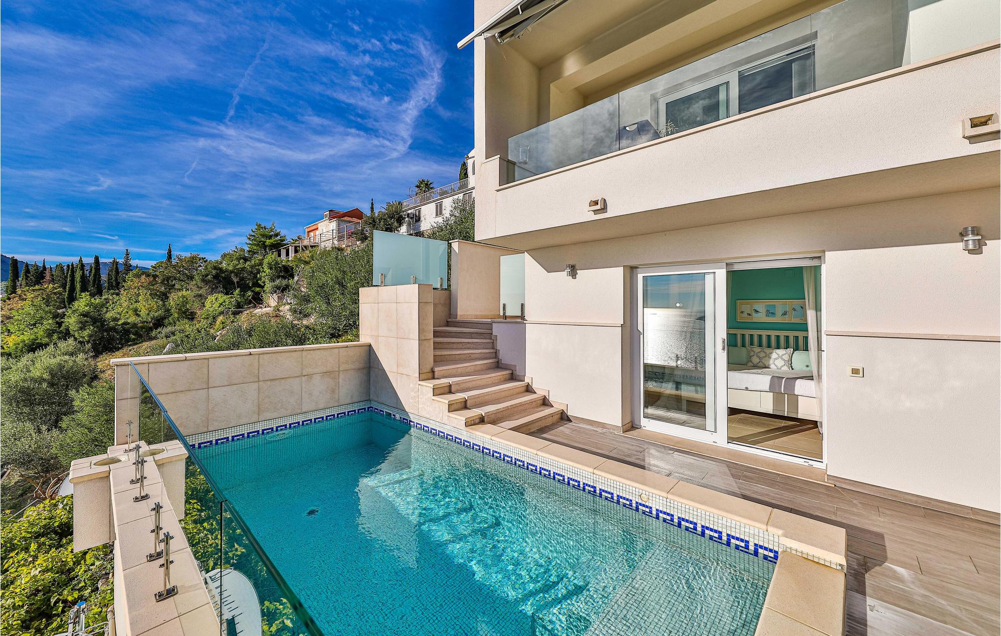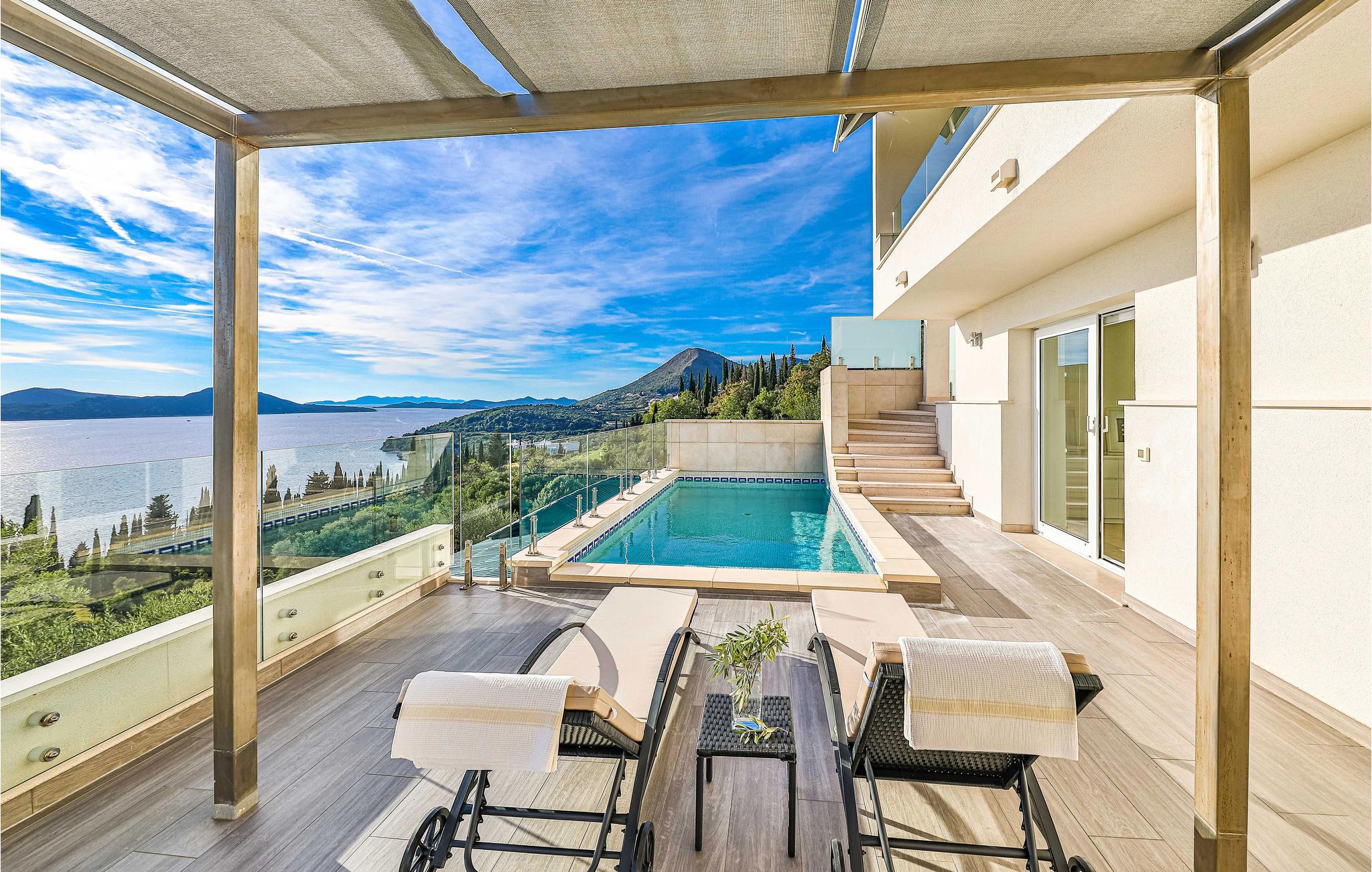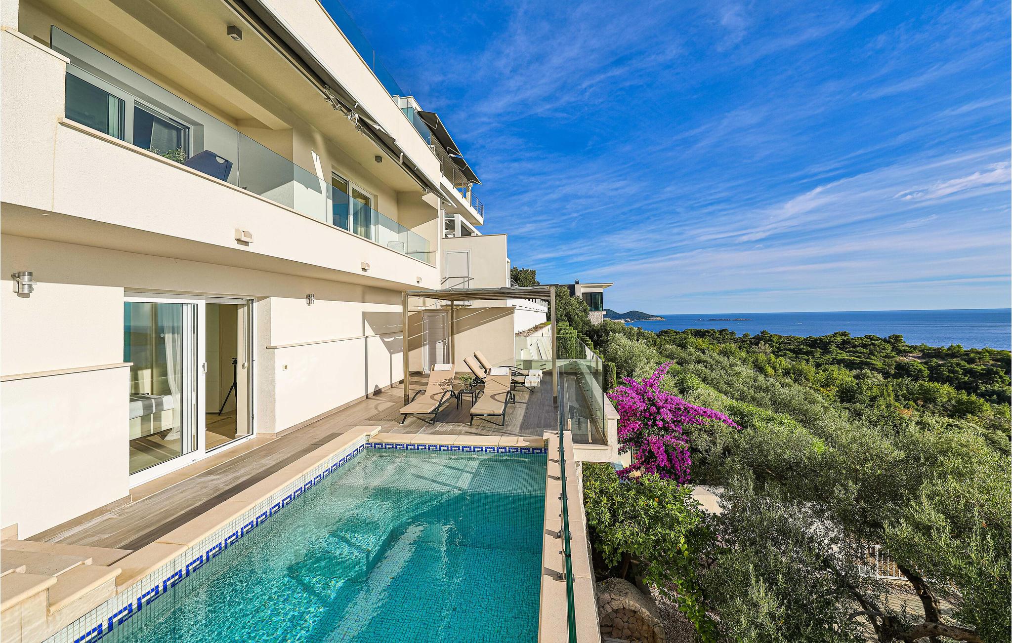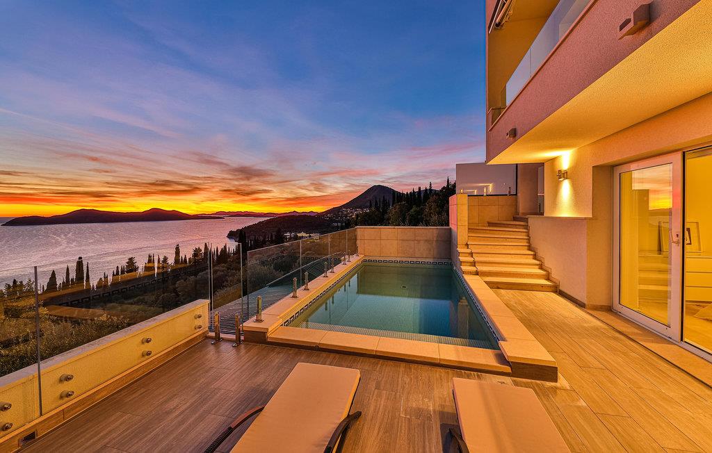 Villaen i to etager har fine soveværelser og en solrig tagterrasse, hvor I kan slappe af og komme ned i gear. Fra den rummelige terrasse kan I nyde en smuk panoramaudsigt over havet. I har også egen swimmingpool, og øen Kolocep ligger også tæt på.