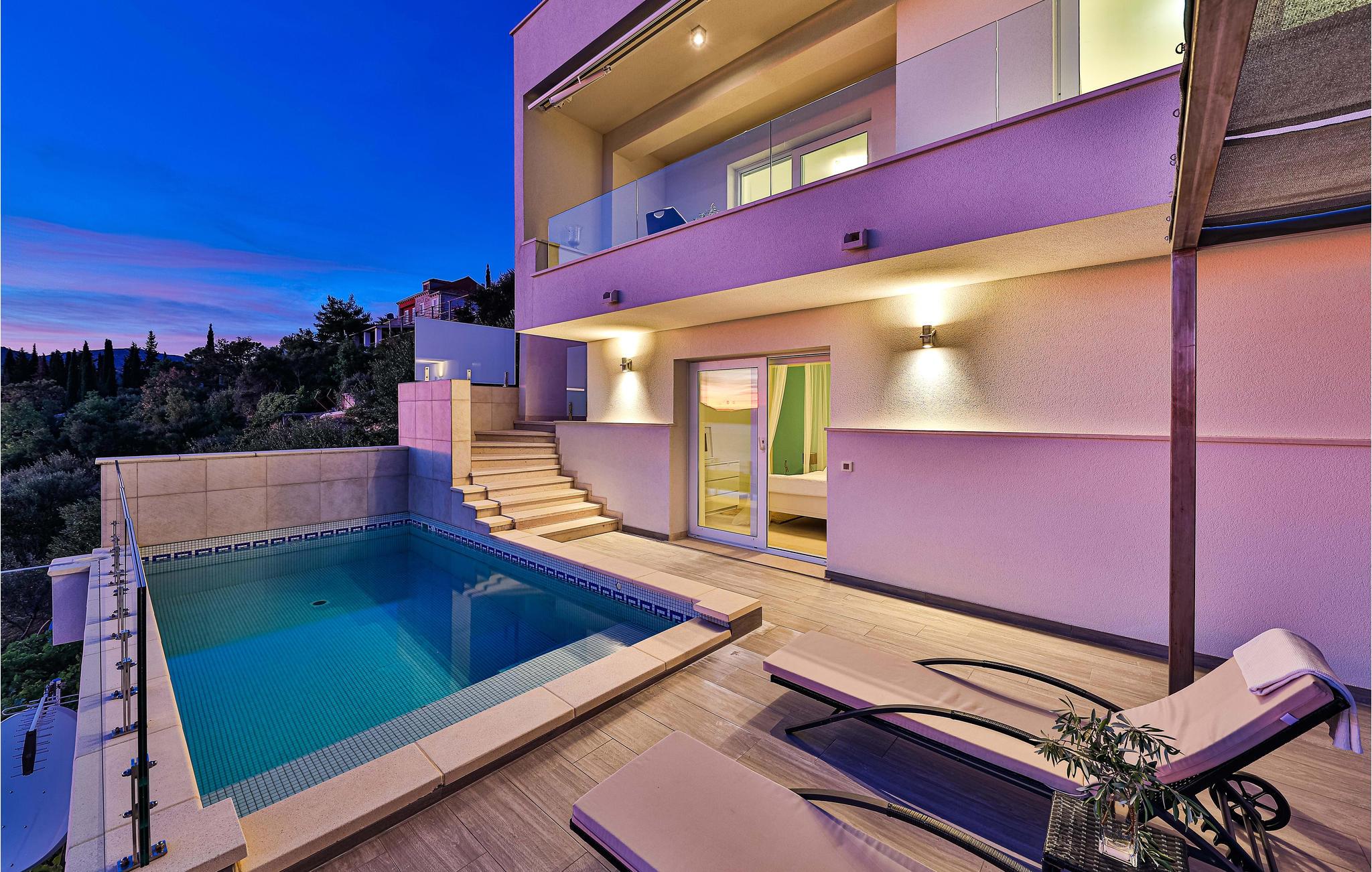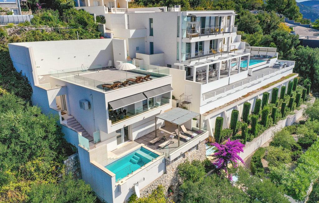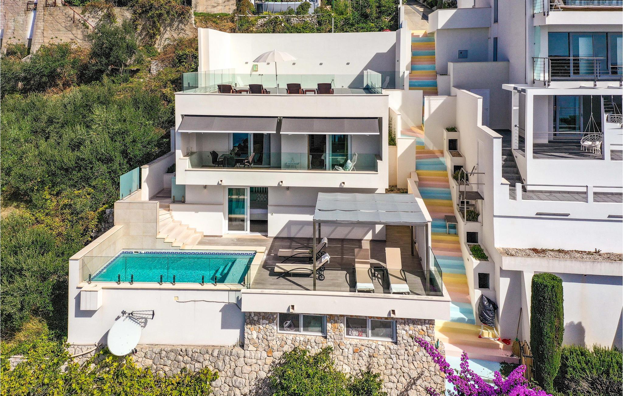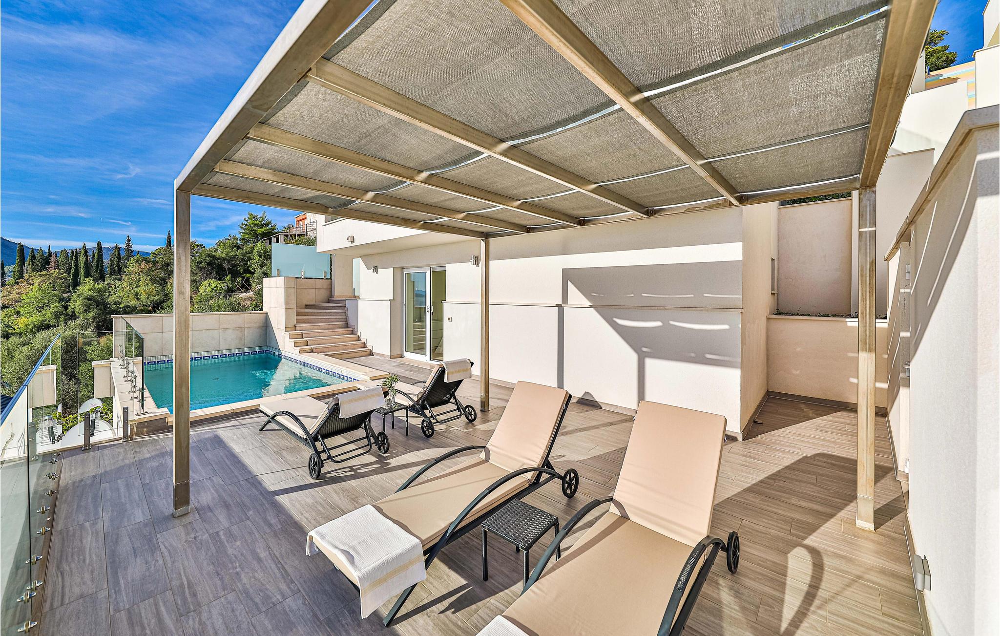 Villaen i to etager har fine soveværelser og en solrig tagterrasse, hvor I kan slappe af og komme ned i gear. Fra den rummelige terrasse kan I nyde en smuk panoramaudsigt over havet. I har også egen swimmingpool, og øen Kolocep ligger også tæt på.