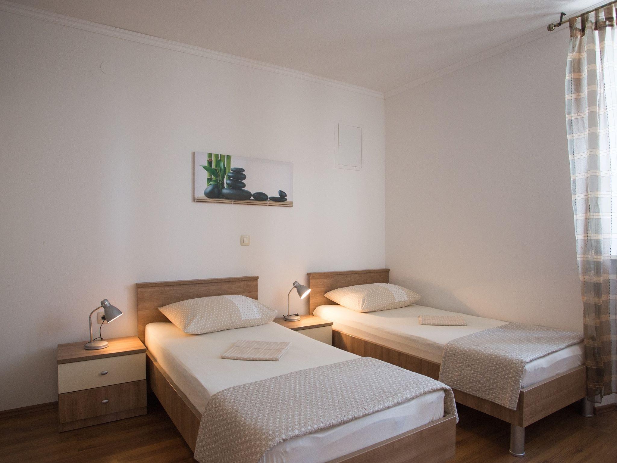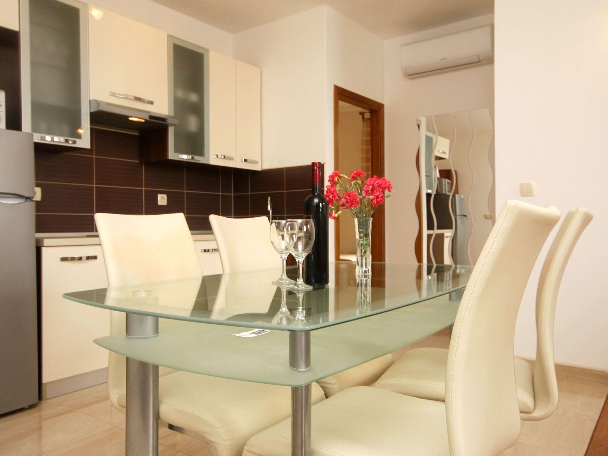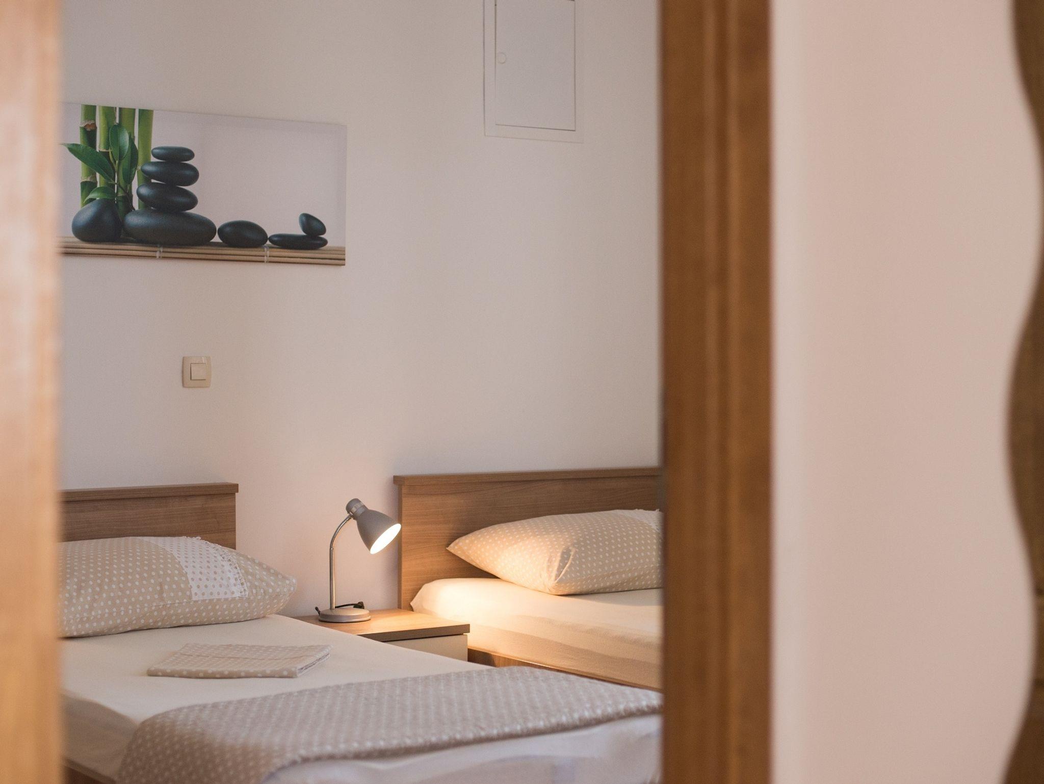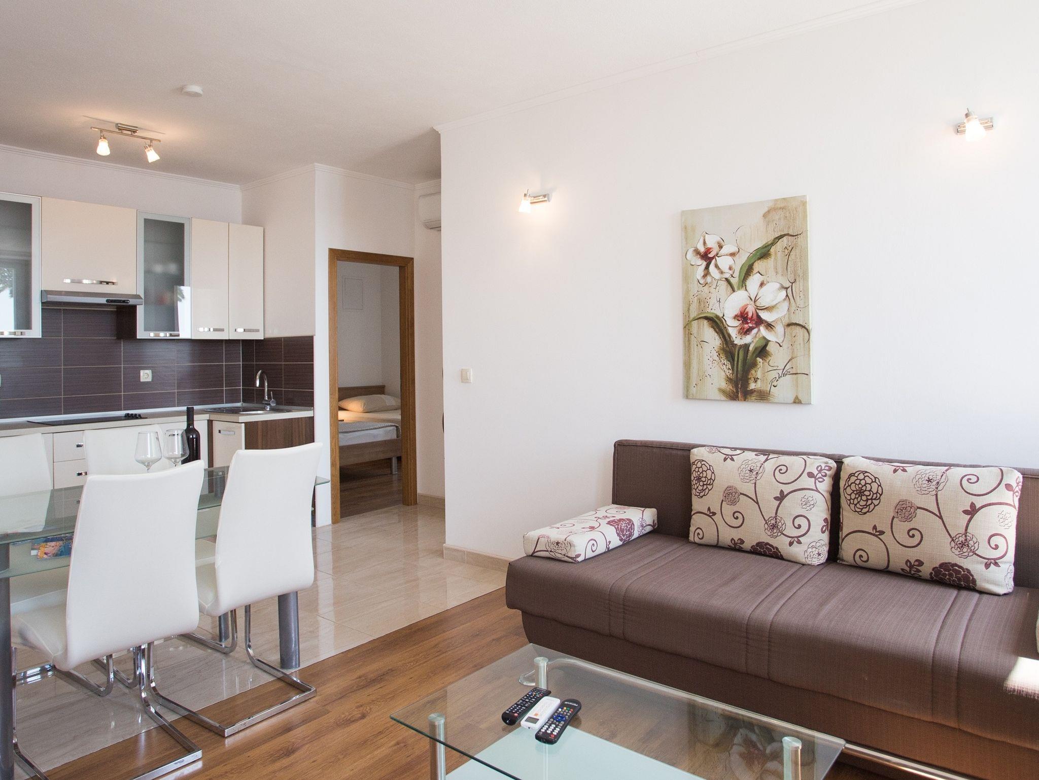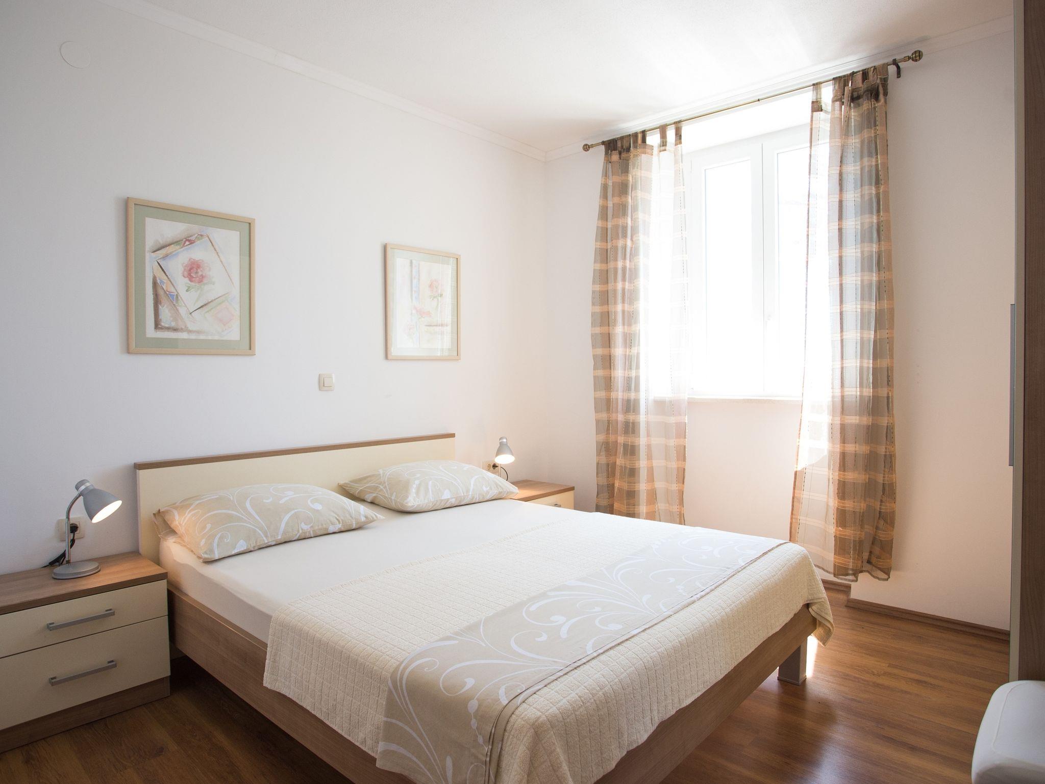 Ferienwohnung bietet Platz für 6 Gäste. Die Betten sind in Schlafzimmern, die es 2 gibt, und in Wohnzimmer, innerhalb einer Gesamtfläche von 62m2, angeordnet. Die Gäste haben eine eigene Terrasse zur Verfügung, auf der sie in warmen Sommernächten genießen können. Das Apartment bietet Meerblick. Es ist erlaubt, Speisen auf dem Gemeinschafts-Grill vorzubereiten. Durch die Terrasse der gebuchten Unterkunftseinheit gehen auch andere Gäste oder Vermieter. Unterkunftseinheit hat Räume, die von dem Rest der Einheit abgetrennt werden. IM PREIS INBEGRIFFEN: Kurtaxe, Endreinigung, Klimatisierung, Parkplatz, Internet, Kinderbett, Bügeleisen, Bügelbrett, Föhn. Die Verfügbarkeit zusätzlicher Dienstleistungen in Ihrem reservierten Termin und die Preise derselben (falls nicht aufgeführt) müssen im Voraus überprüft werden. Zusätzliche Dienstleistungen die in der Zahlungsaufforderung nicht aufgeführt sind werden direkt beim Vermieter bezahlt, angenommen der Gast nutzt auch diese.