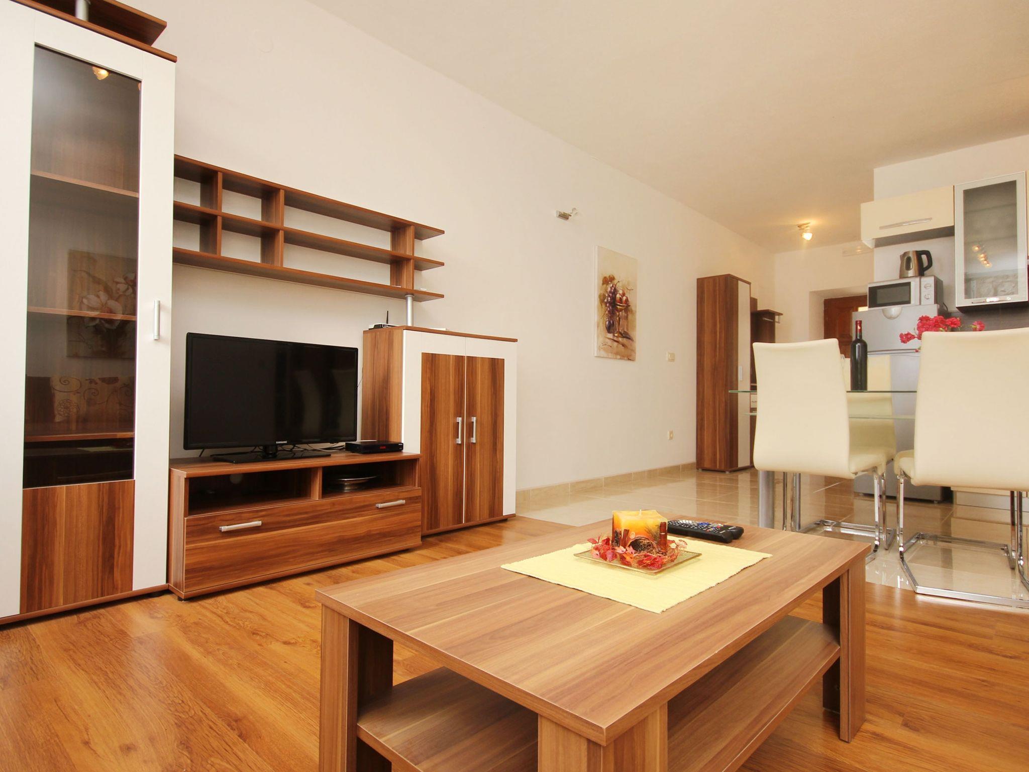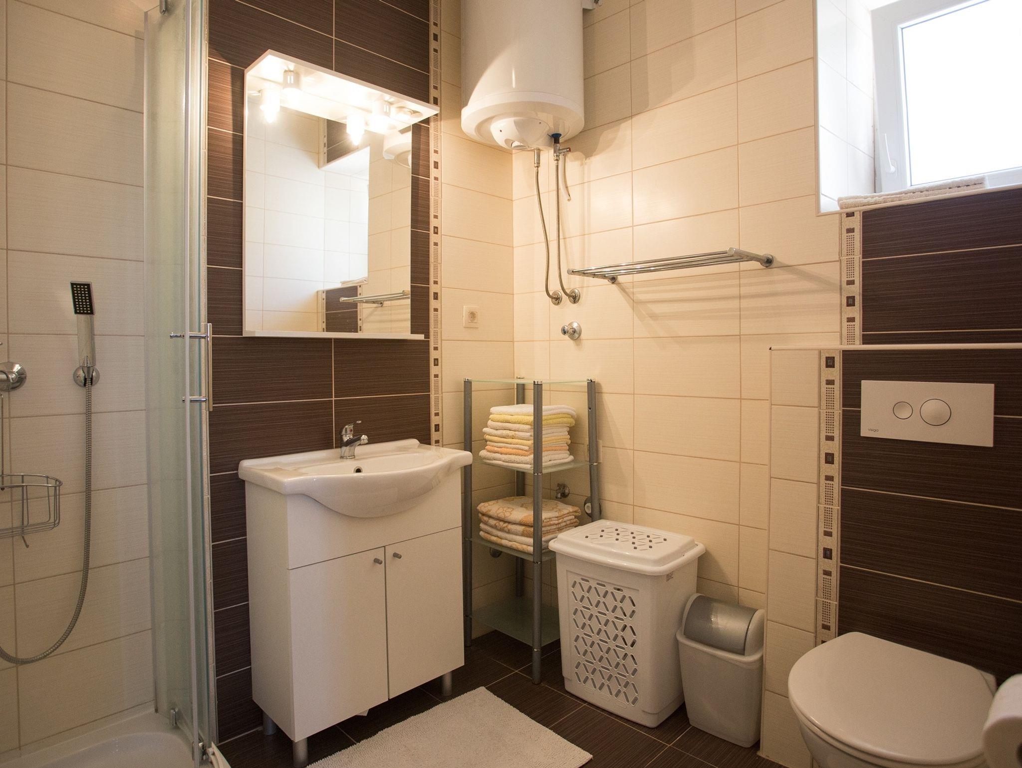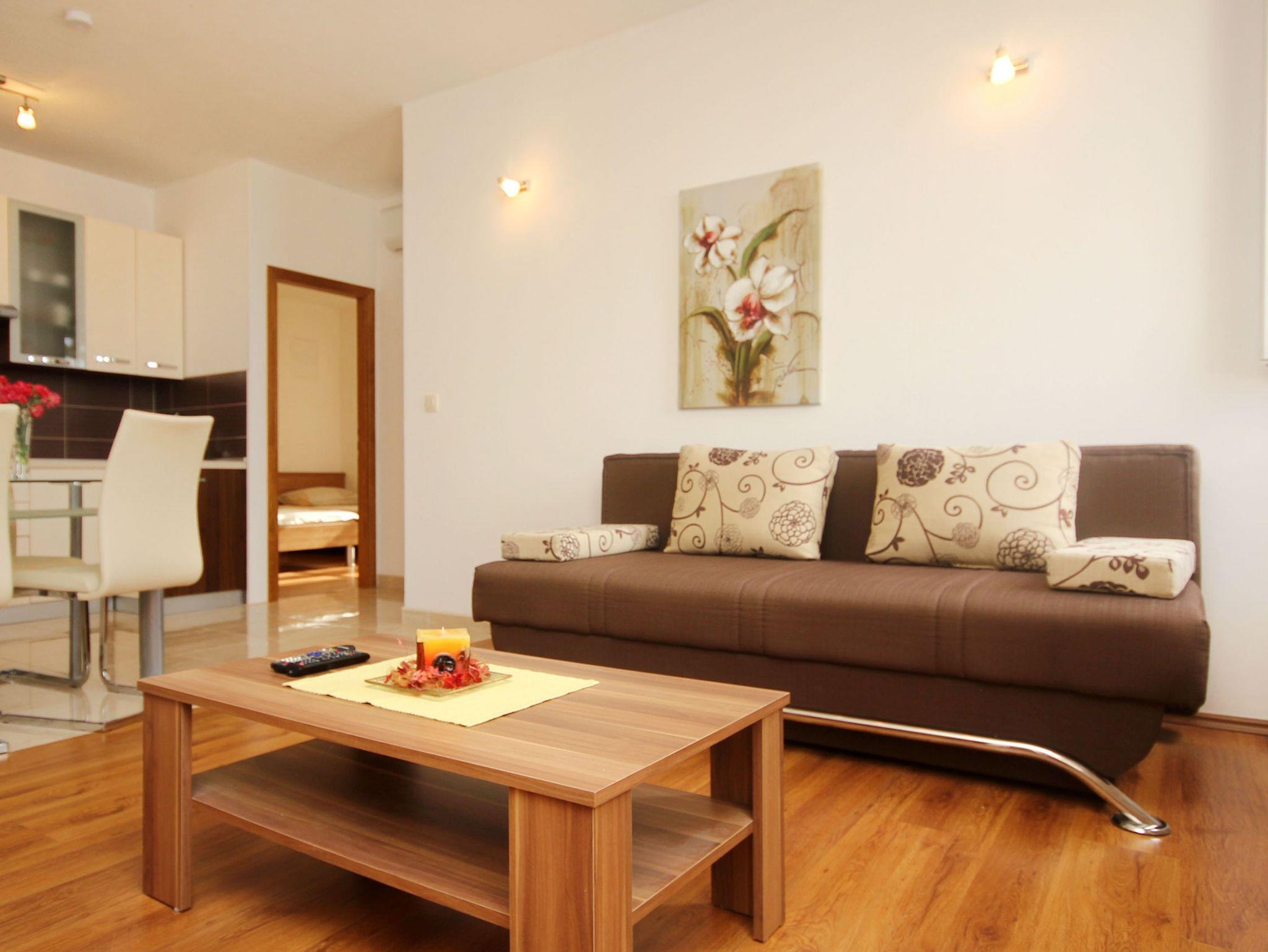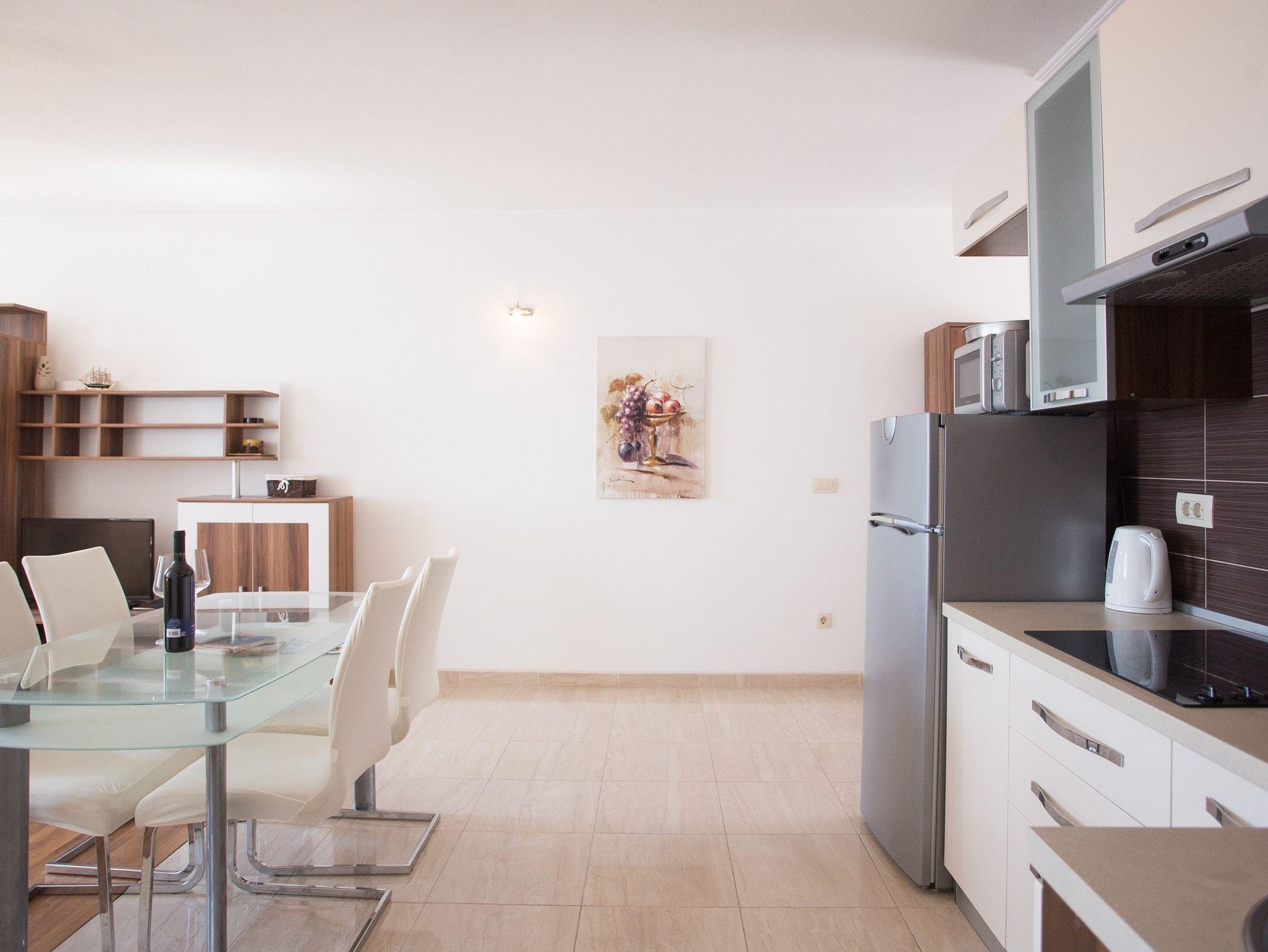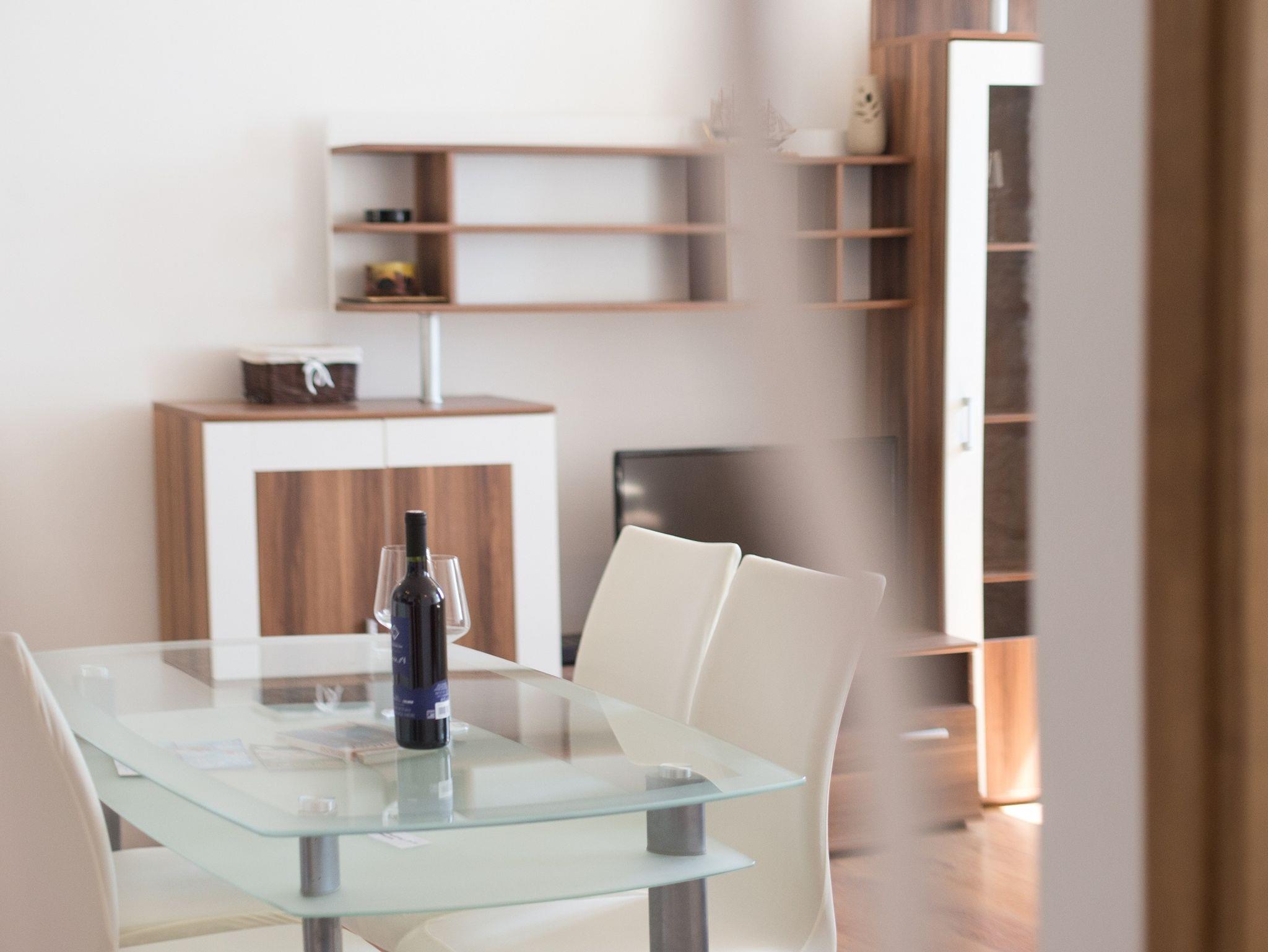 Ferienwohnung bietet Platz für 6 Gäste. Die Betten sind in Schlafzimmern, die es 2 gibt, und in Wohnzimmer, innerhalb einer Gesamtfläche von 62m2, angeordnet. Die Gäste haben eine eigene Terrasse zur Verfügung, auf der sie in warmen Sommernächten genießen können. Das Apartment bietet Meerblick. Es ist erlaubt, Speisen auf dem Gemeinschafts-Grill vorzubereiten. Durch die Terrasse der gebuchten Unterkunftseinheit gehen auch andere Gäste oder Vermieter. Unterkunftseinheit hat Räume, die von dem Rest der Einheit abgetrennt werden. IM PREIS INBEGRIFFEN: Kurtaxe, Endreinigung, Klimatisierung, Parkplatz, Internet, Kinderbett, Bügeleisen, Bügelbrett, Föhn. Die Verfügbarkeit zusätzlicher Dienstleistungen in Ihrem reservierten Termin und die Preise derselben (falls nicht aufgeführt) müssen im Voraus überprüft werden. Zusätzliche Dienstleistungen die in der Zahlungsaufforderung nicht aufgeführt sind werden direkt beim Vermieter bezahlt, angenommen der Gast nutzt auch diese.