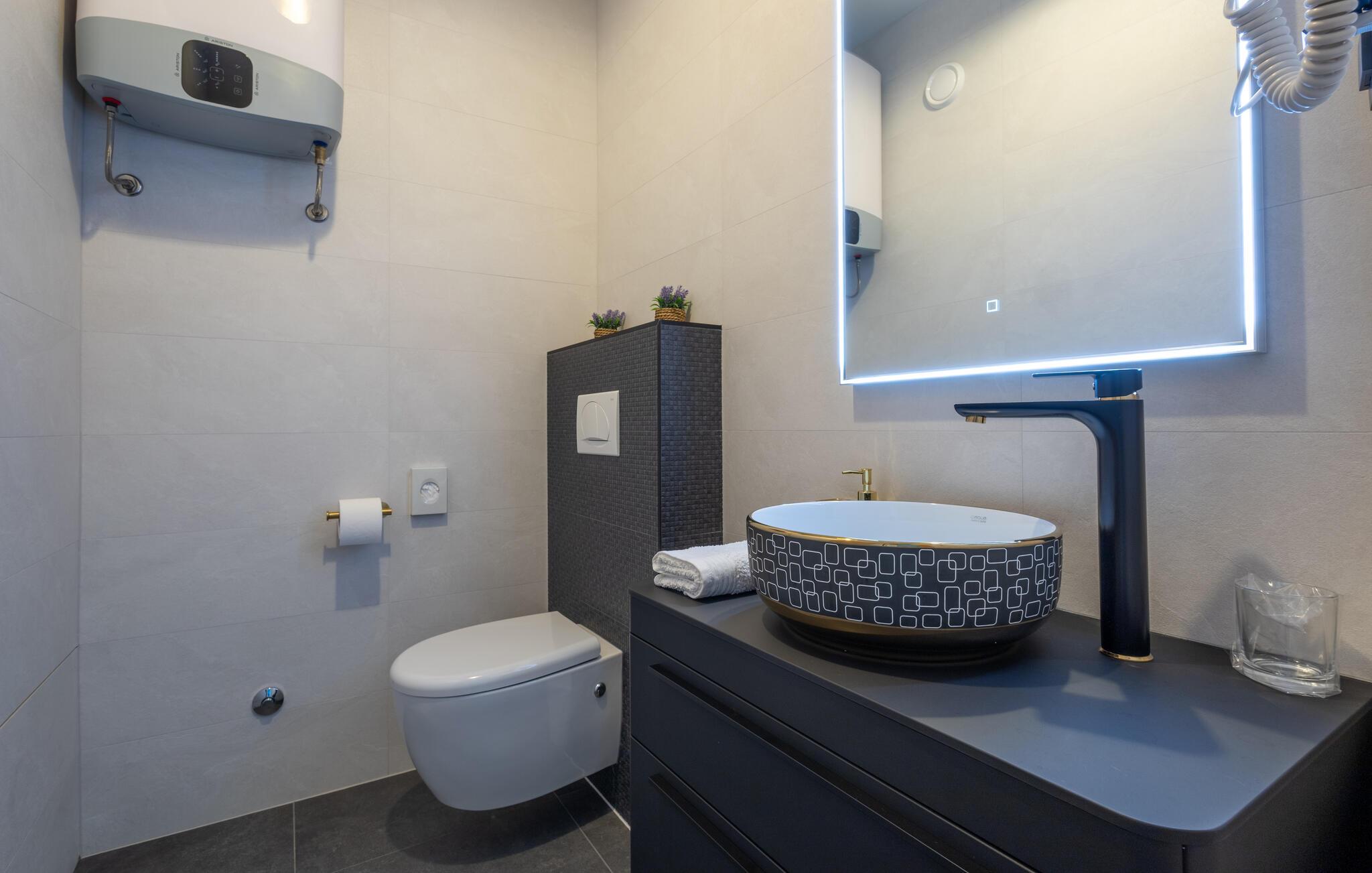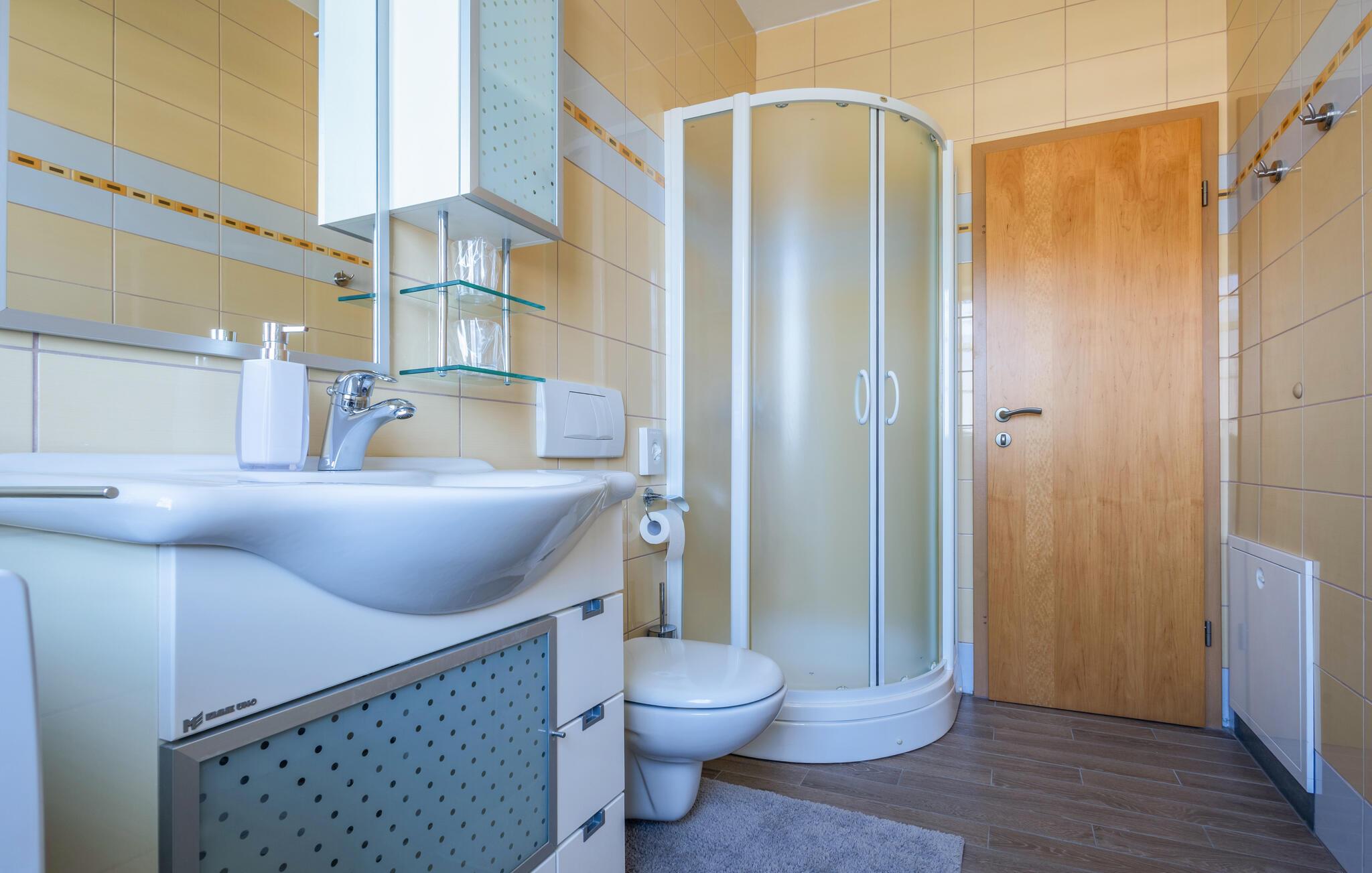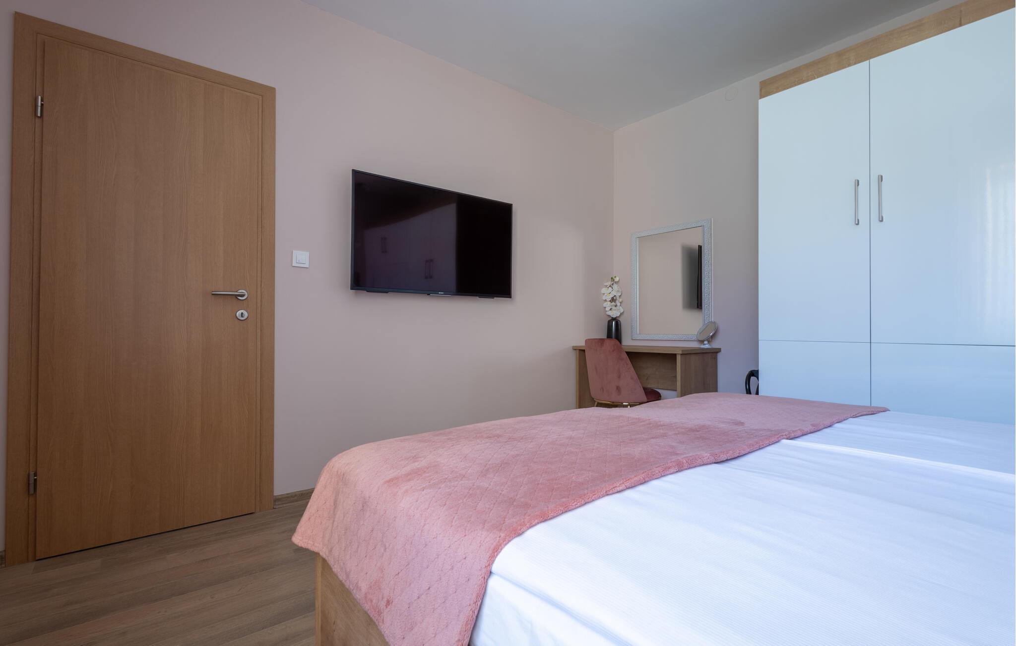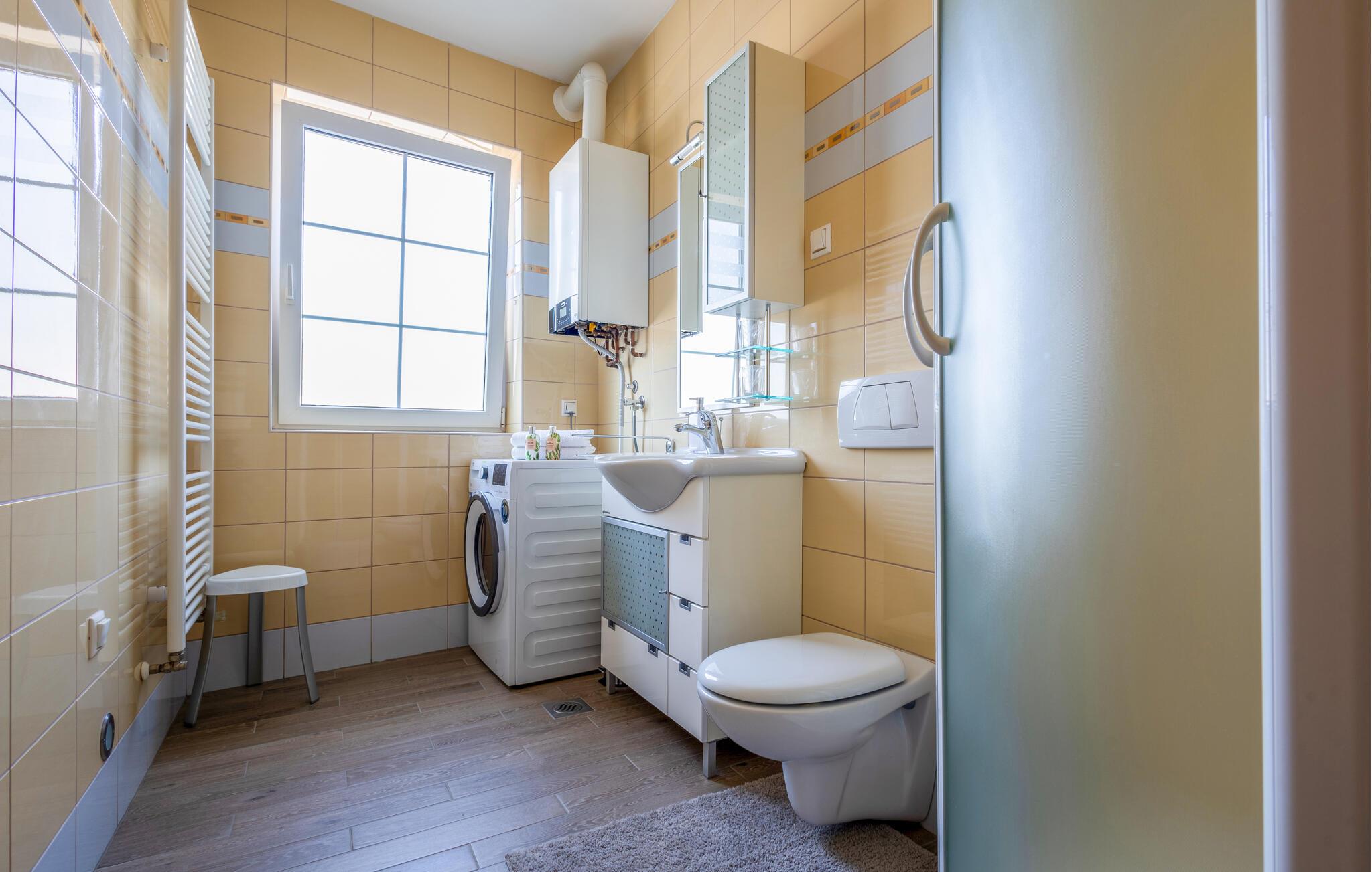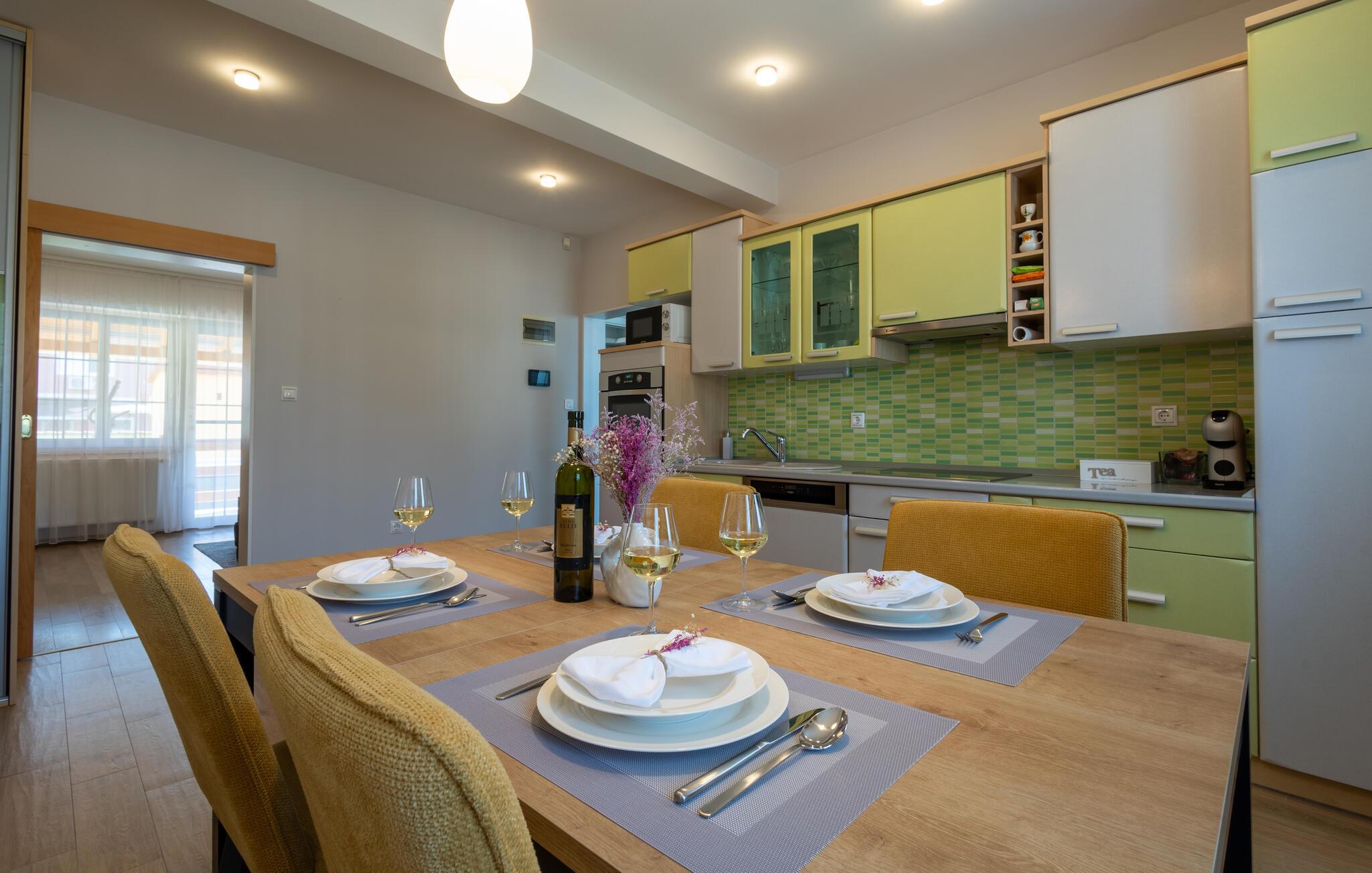 Denne lejlighed byder jer velkommen med en behagelig atmosfære, hvor komfort og hygge forenes på harmonisk vis. Lyse rum, en rummelig sofagruppe og et charmerende køkken sørger for, at I straks føler jer hjemme. Tilbered velsmagende måltider sammen, og server dem med et glas kroatisk vin. Bagefter inviterer saunaen til ro og afslapning.