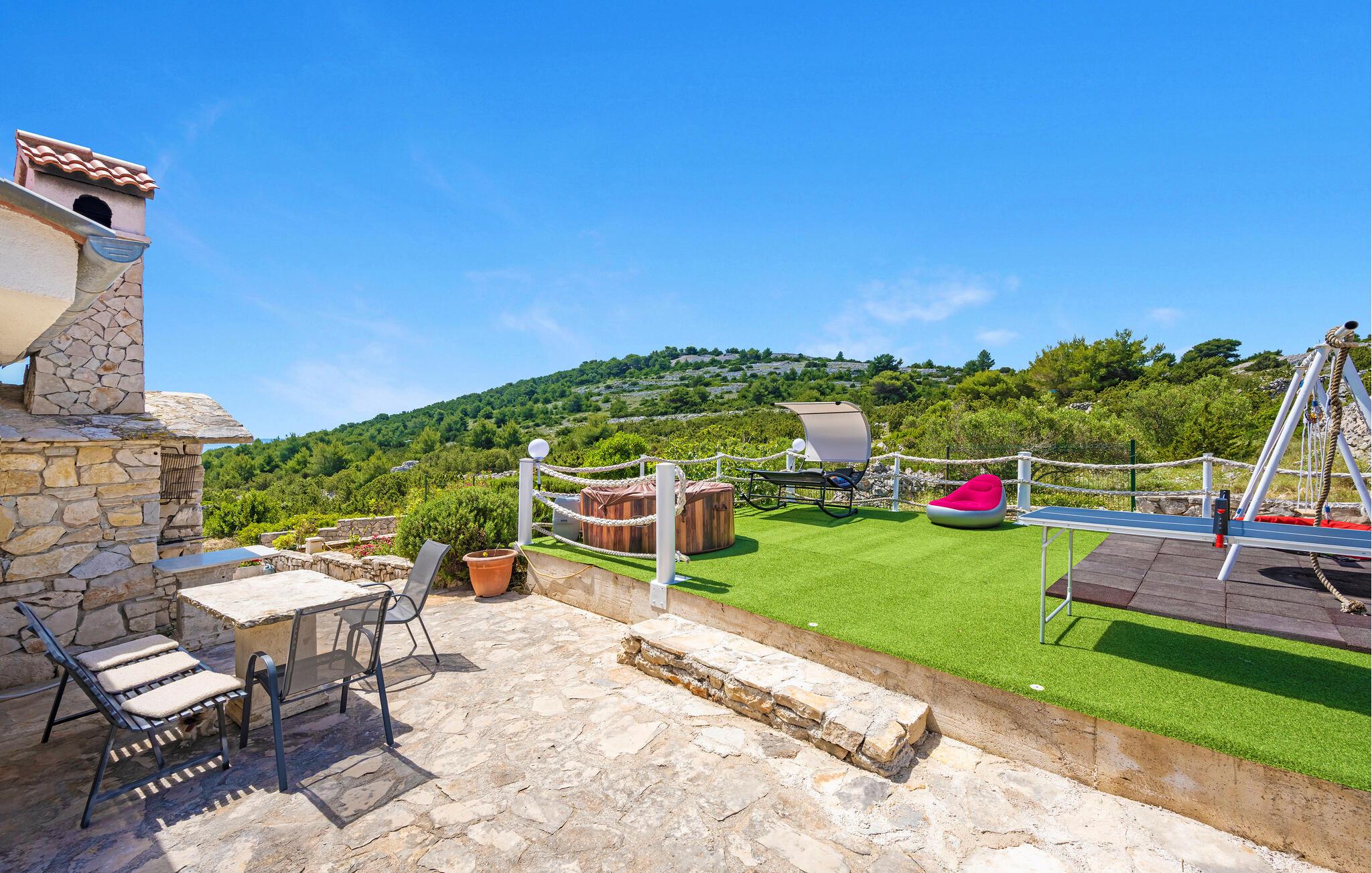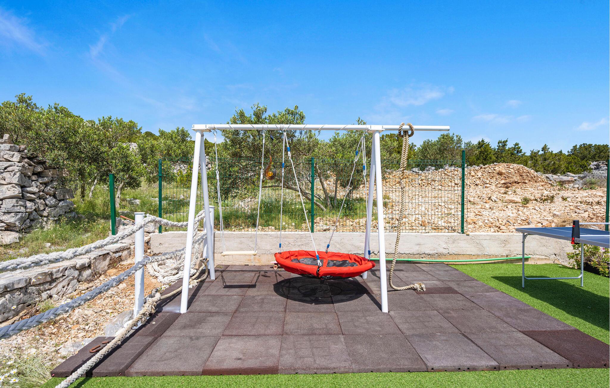 Takket være den afsondrede beliggenhed langt fra travlheden kan I også nyde absolut fred og privatliv i det alsidige udendørsområde. Forkæl jer selv med afslapning i spabadet, mens børnene boltrer sig på legepladsen, spiller bordtennis, lader batterierne op på liggestolen og nyder den fredelige atmosfære under stemningsfulde grillmiddage i stearinlysets skær.