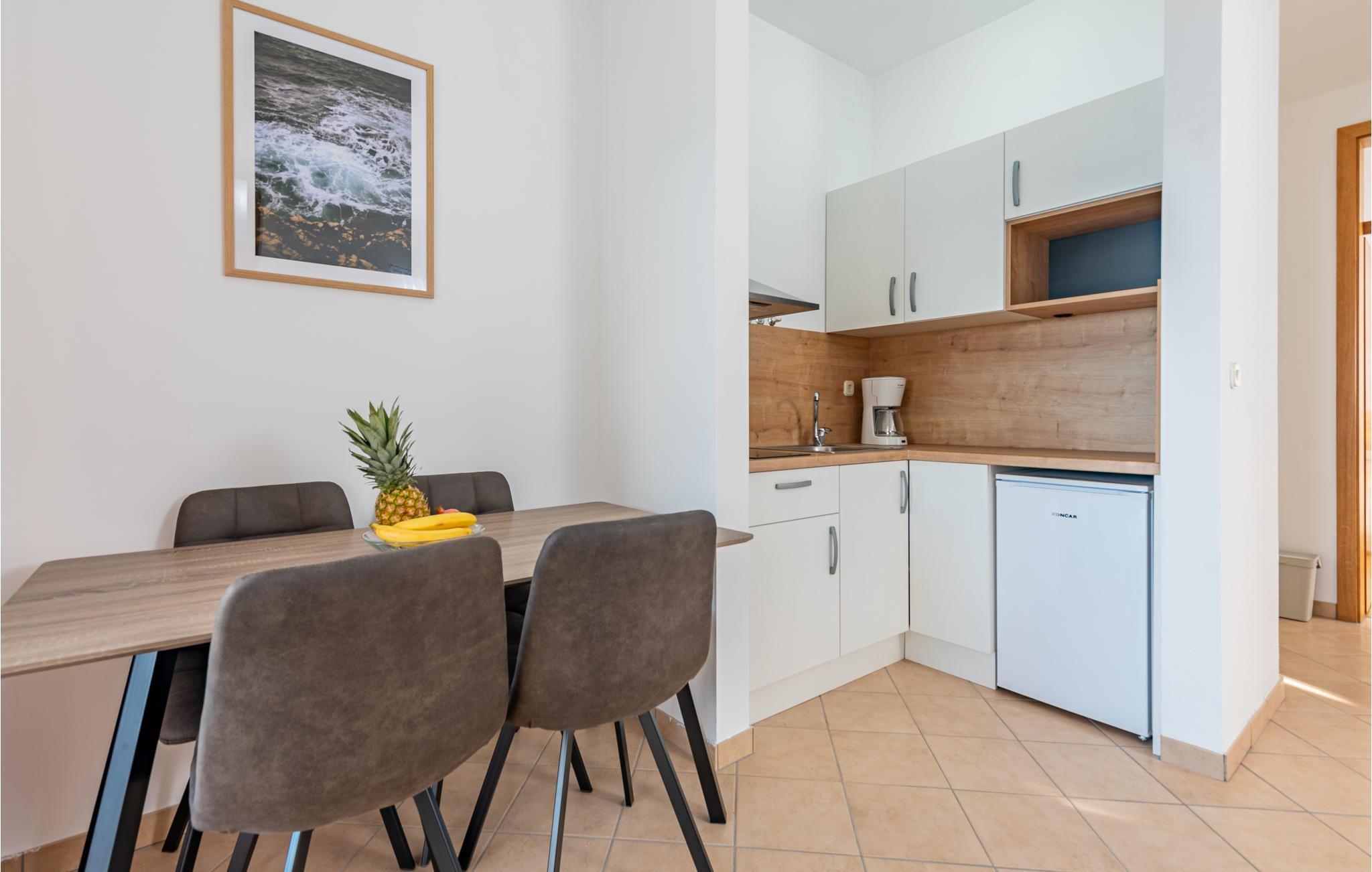Denne skønne ferielejlighed er placeret i en moderne etageejendom. Her rykker I ind i en bolig, som emmer af stilfuld minimalisme og giver jer optimale rammer til at slappe af efter jeres ture rundt på øen Pag. I kan tilbringe aftenerne på den skyggefulde balkon og se de smukke solnedgange over havet. Her er der alt det, I skal bruge for at slappe af og have det rart, og I har desuden adgang til et fælles, lukket lokale, som I deler med husets øvrige gæster til socialt samvær og grillaftener.