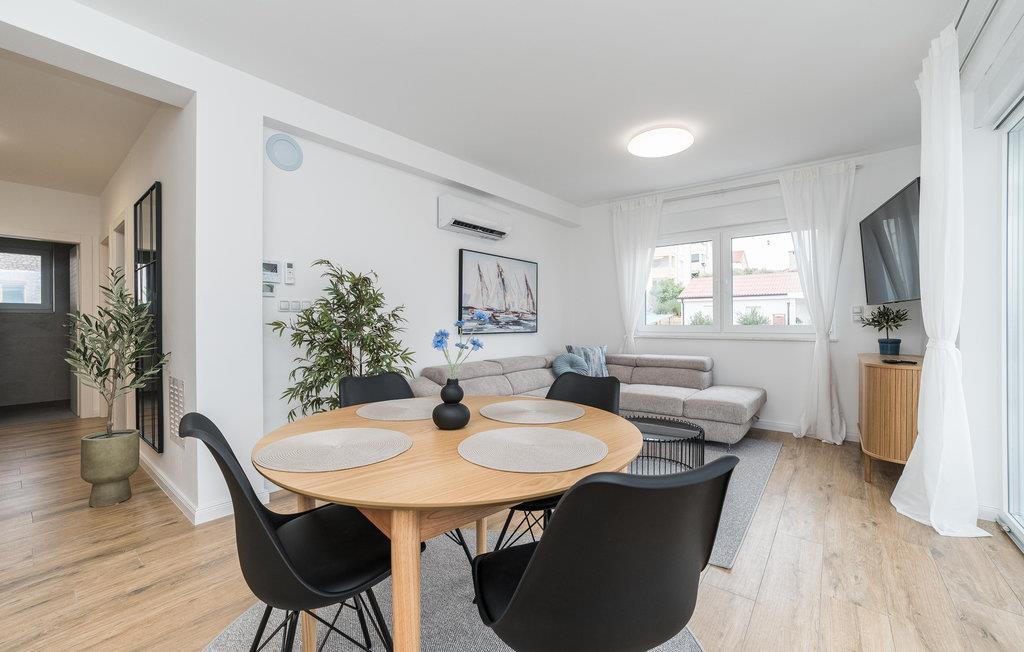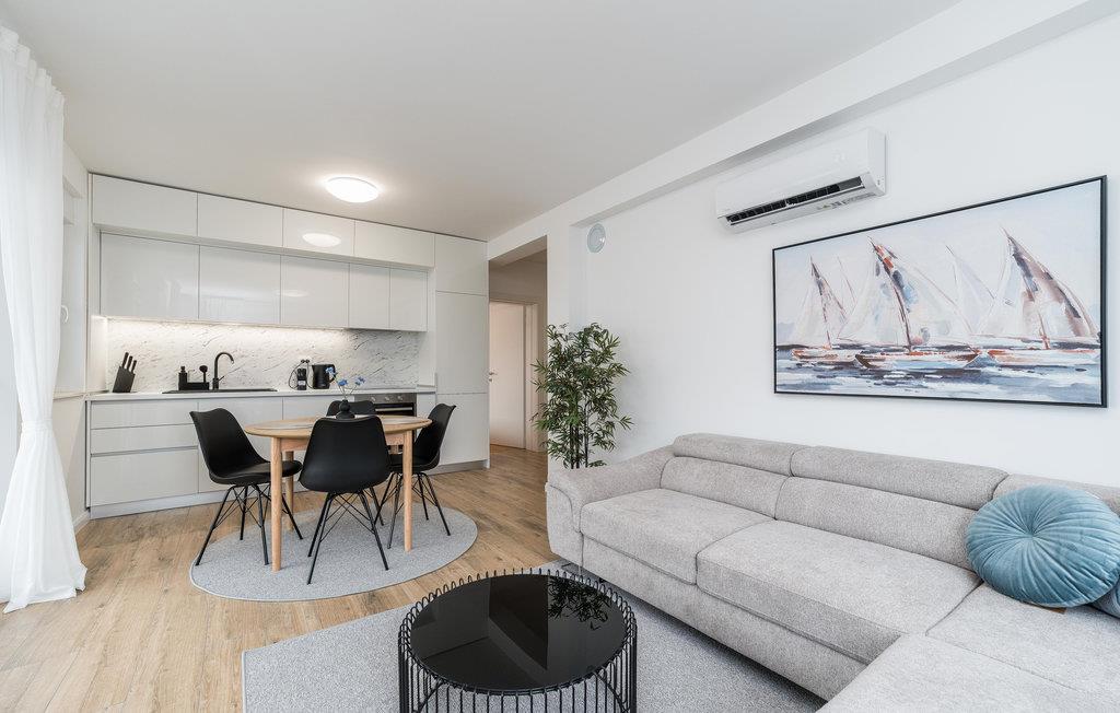 Denne lejlighed består af lyse rum og moderne indretningsløsninger, så her får I det optimale sted til en ferie, hvor I kun bor et stenkast fra stranden. Begynd dagene med en solid morgenmad, inden I skal ud på eventyr. Sofaen i stuen lægger op til hyggelige aftener med spil, samtaler eller en god film.