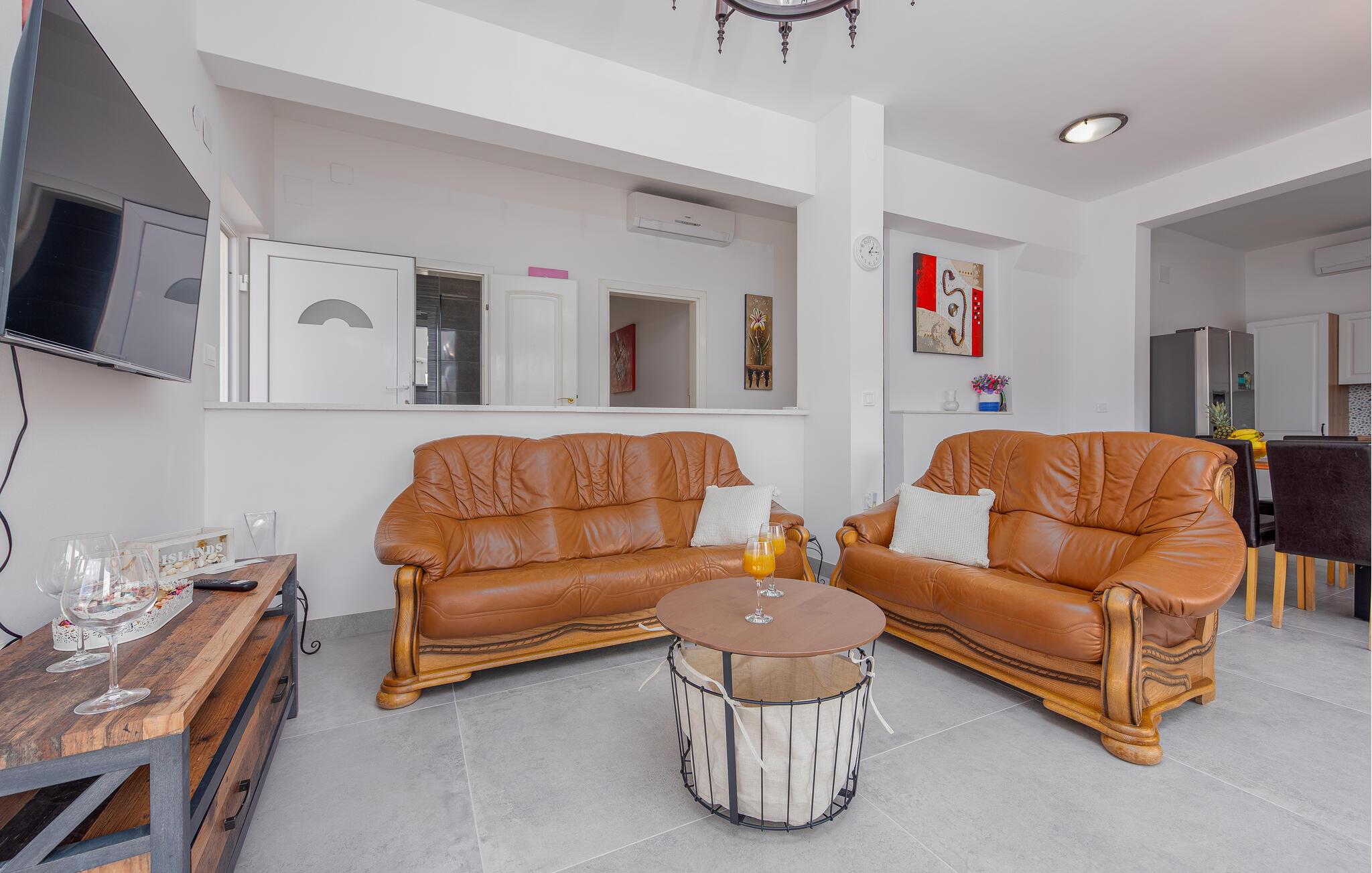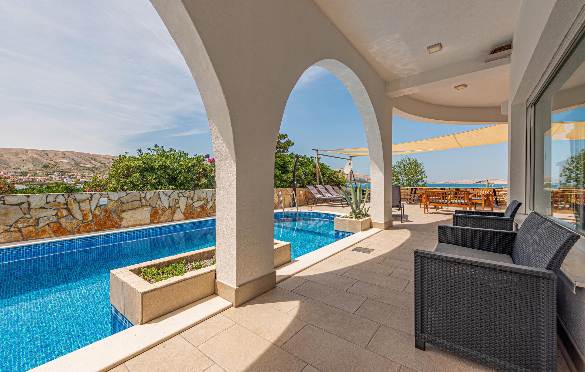 Dette moderne indrettede feriehus med pool ligger lige i nærheden af stranden.