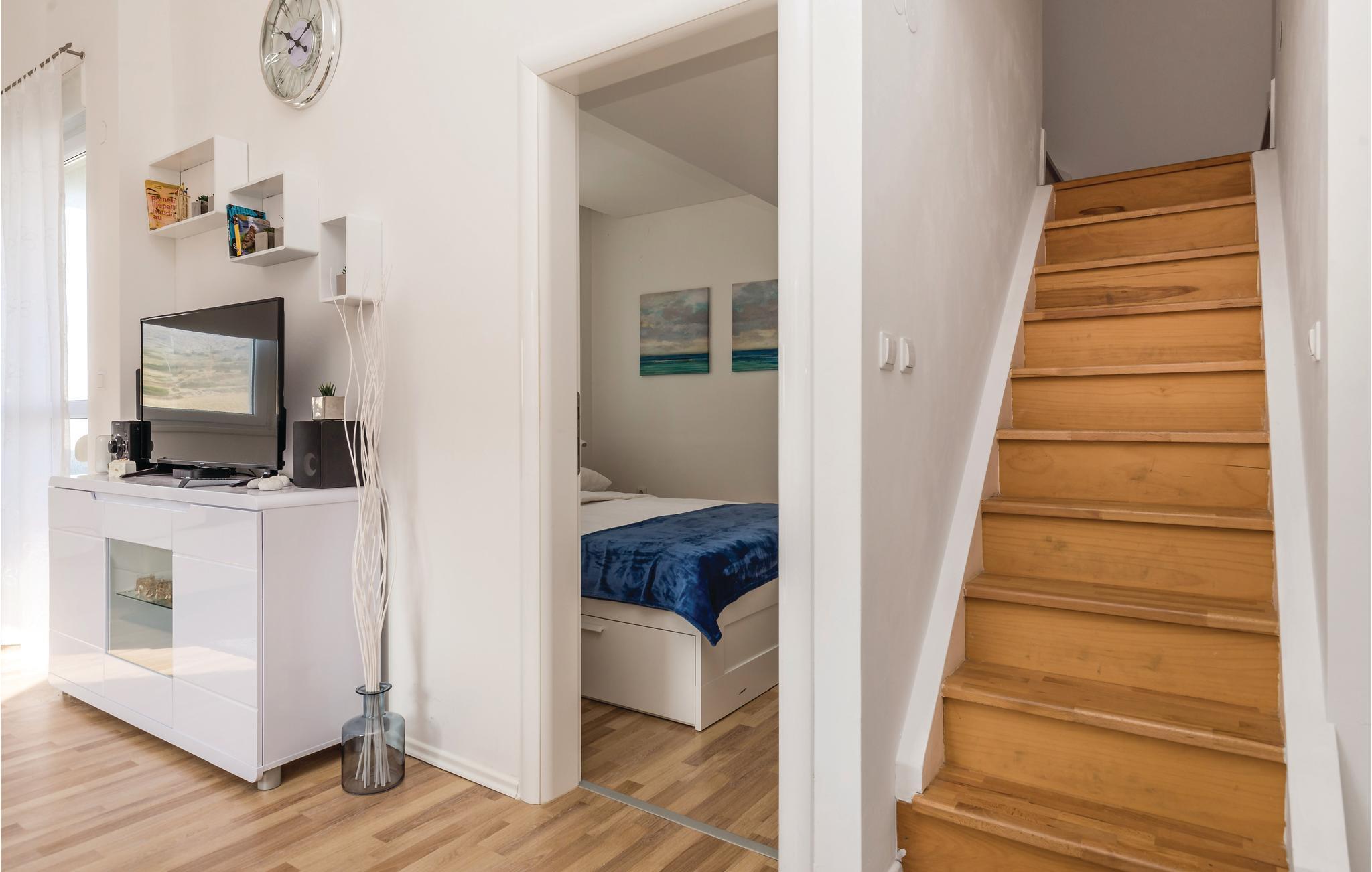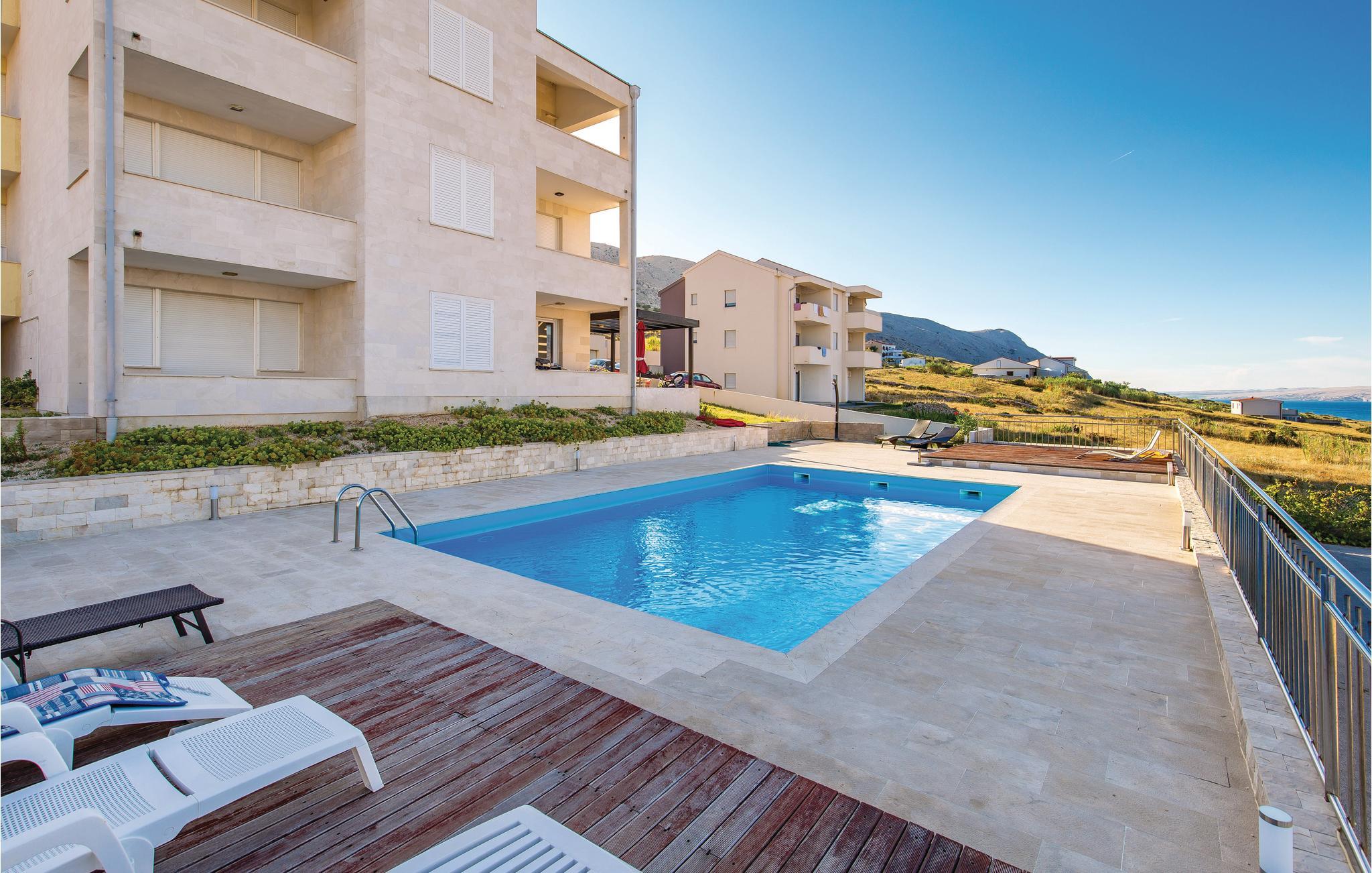 På en af de skønneste kroatiske øer, der er praktisk forbundet til fastlandet med bro, ligger denne ferielejlighed i to plan. Den er moderne indrettet og fra balkonen er der en betagende udsigt over havet. På øverste etage er der et soveværelse med en laveste loftshøjde på 160 cm. Alle beboere i huset har adgang til poolen i haven. Nyd at bo tæt ved havet og besøg den interessante by Pag, med skønne badestrande og et godt udvalg af restauranter at vælge mellem. Se også CKP625.