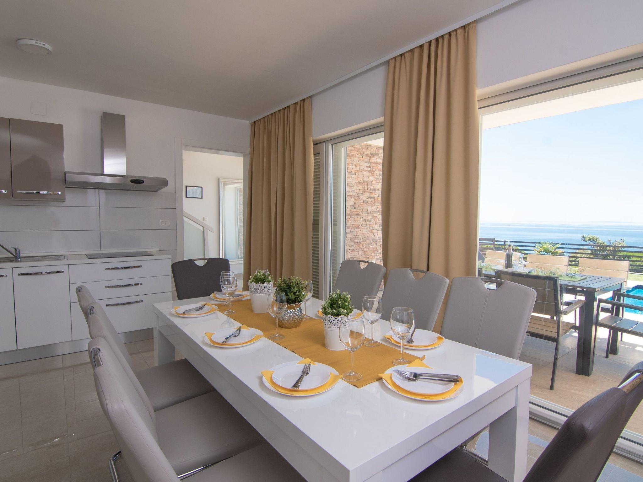 The villa has 4 spacious, fully air-conditioned bedrooms with balconies. Two are equipped with a double bed and two with two single beds that can be joined if needed. The villa has a total of four en-suite bathrooms, all equipped with showers. Living room connected with fully equipped kitchen, dining room and direct access to a spacious terrace with dining area and barbecue. There is a spacious sun deck with a sun lounger, parasols, and a swimming pool. Pool towels are provided on-site