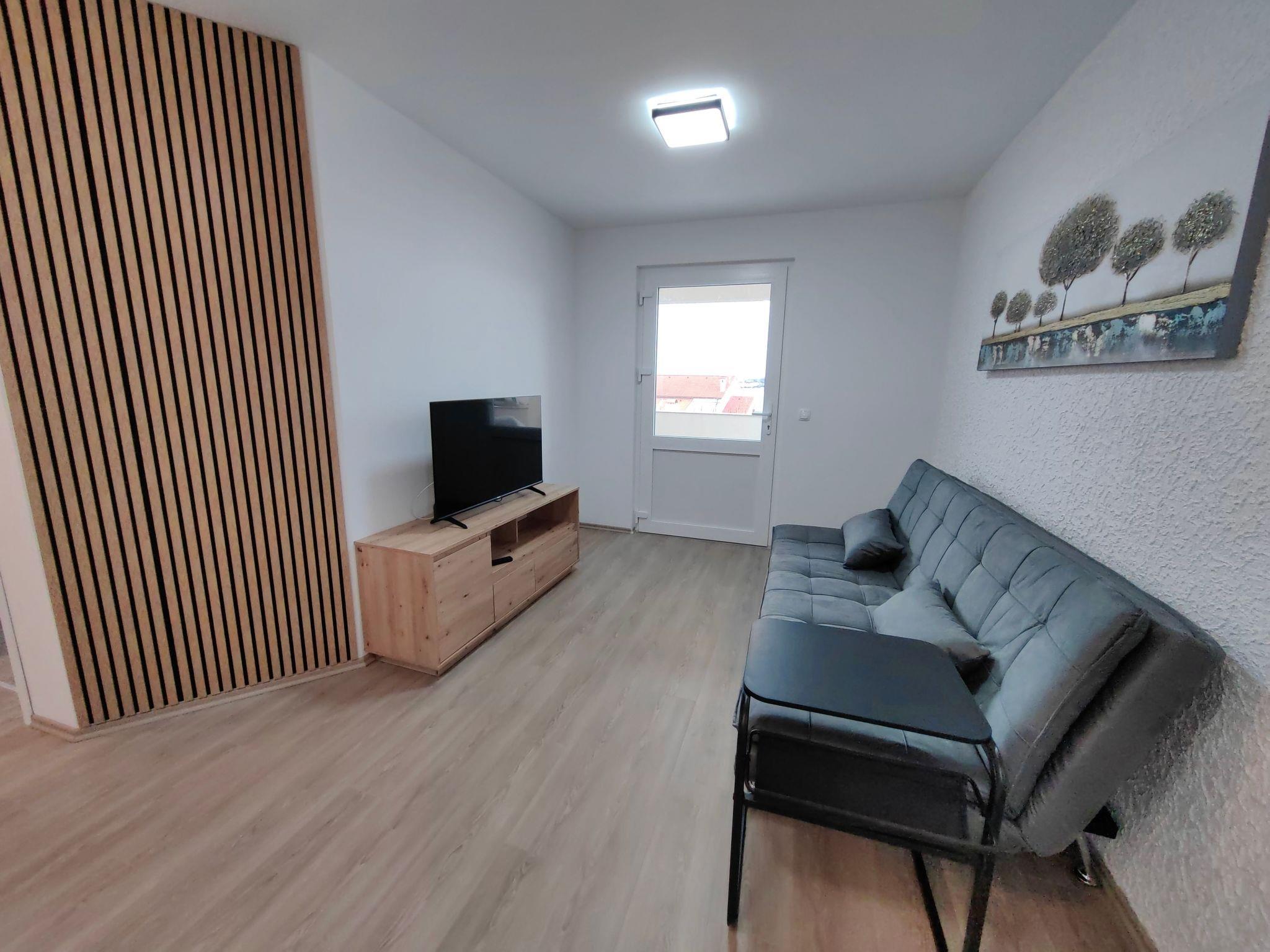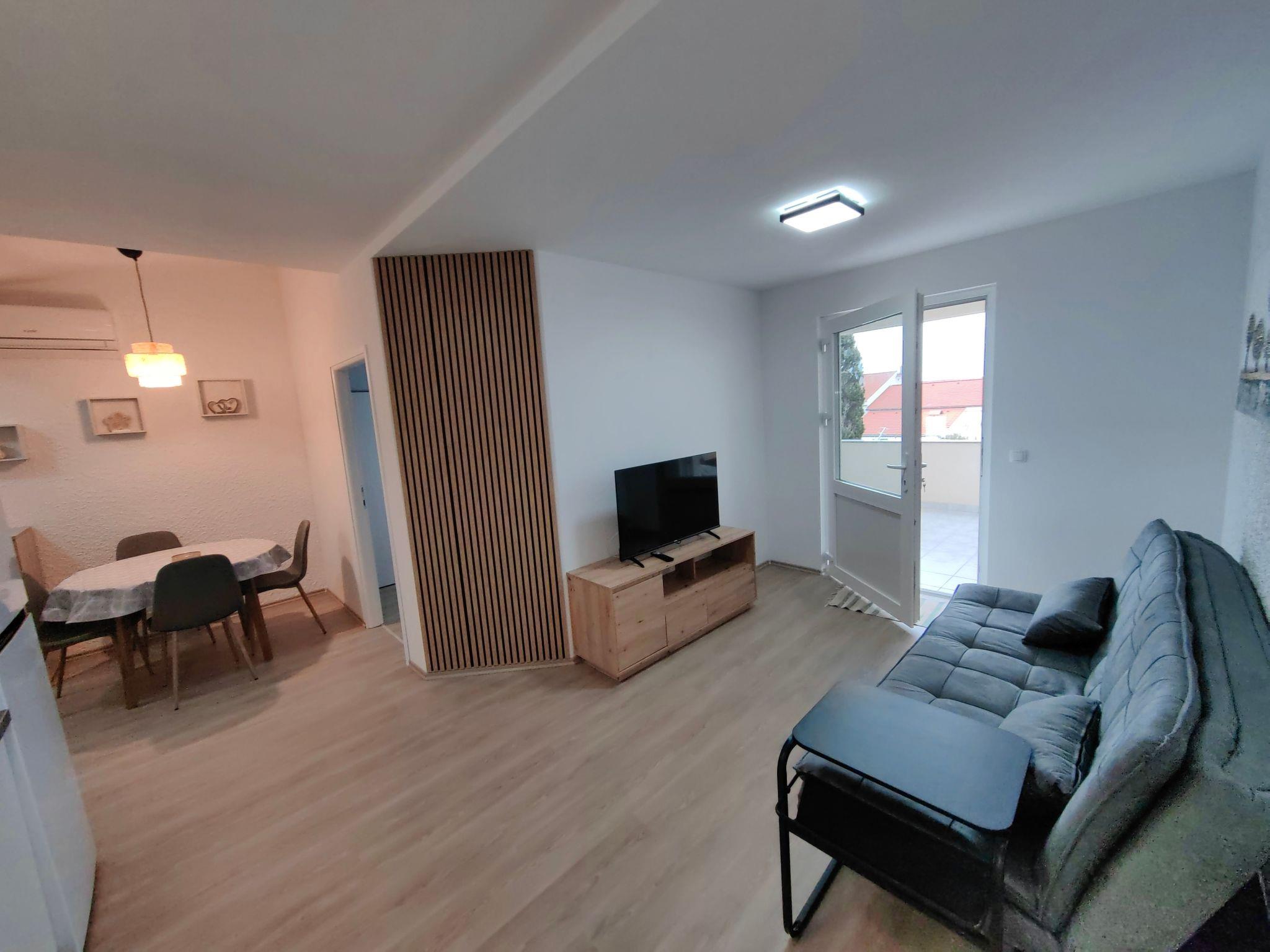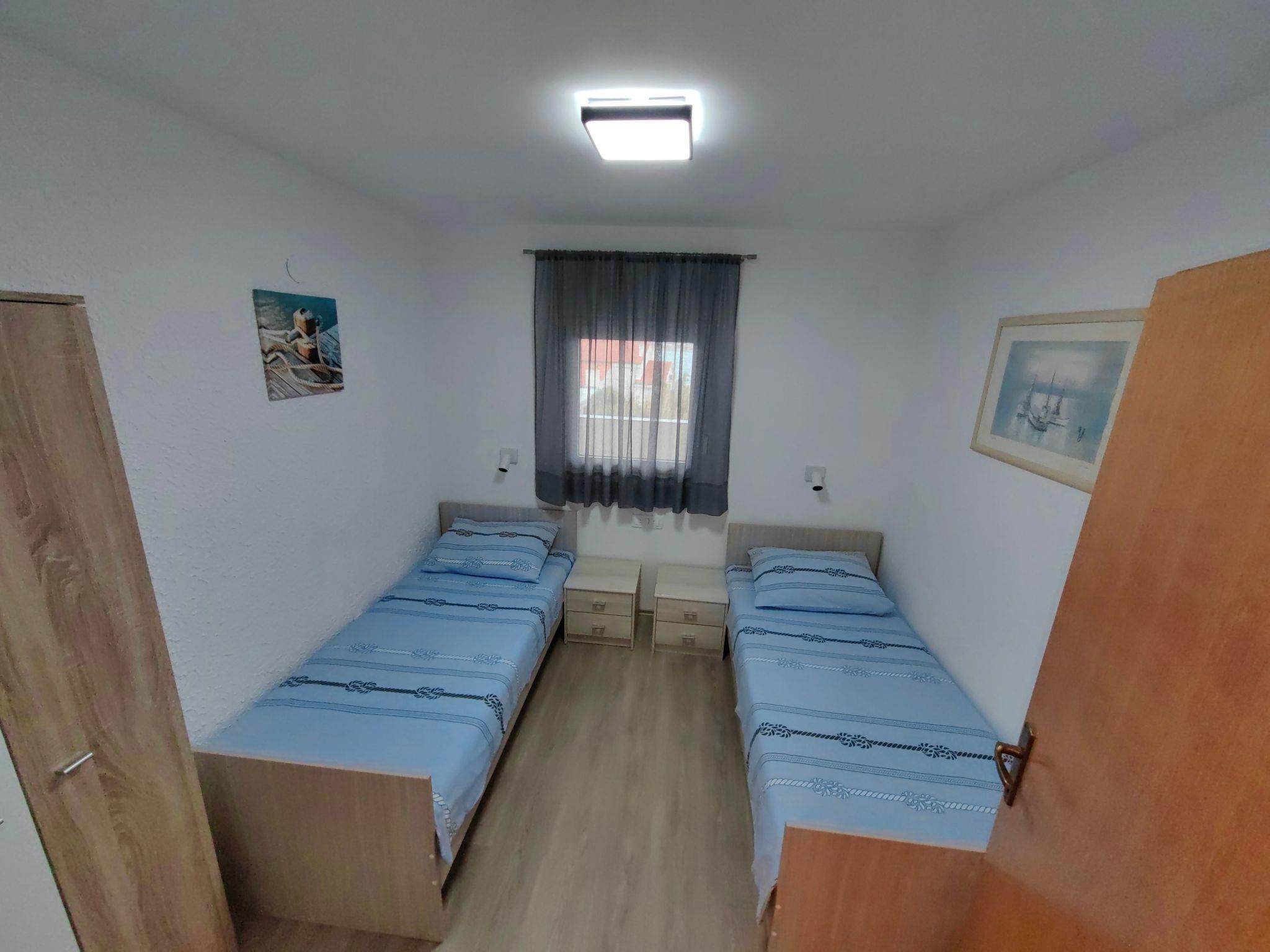 Inside, the apartment is thoughtfully equipped to cater to your every need. It features two well-appointed bedrooms, ensuring a restful night's sleep for all guests. One bedroom is furnished with a double bed, while the other offers two single beds, accommodating a variety of group dynamics. The heart of the apartment, a kitchen, comes fully equipped, ready for you to whip up delicious meals with ease. Adjacent to the kitchen, the dining room provides a comfortable space for sharing meals and moments, complete with a table and five chairs, alongside modern amenities like television, internet, and efficient air conditioning for those warm Dalmatian days.
