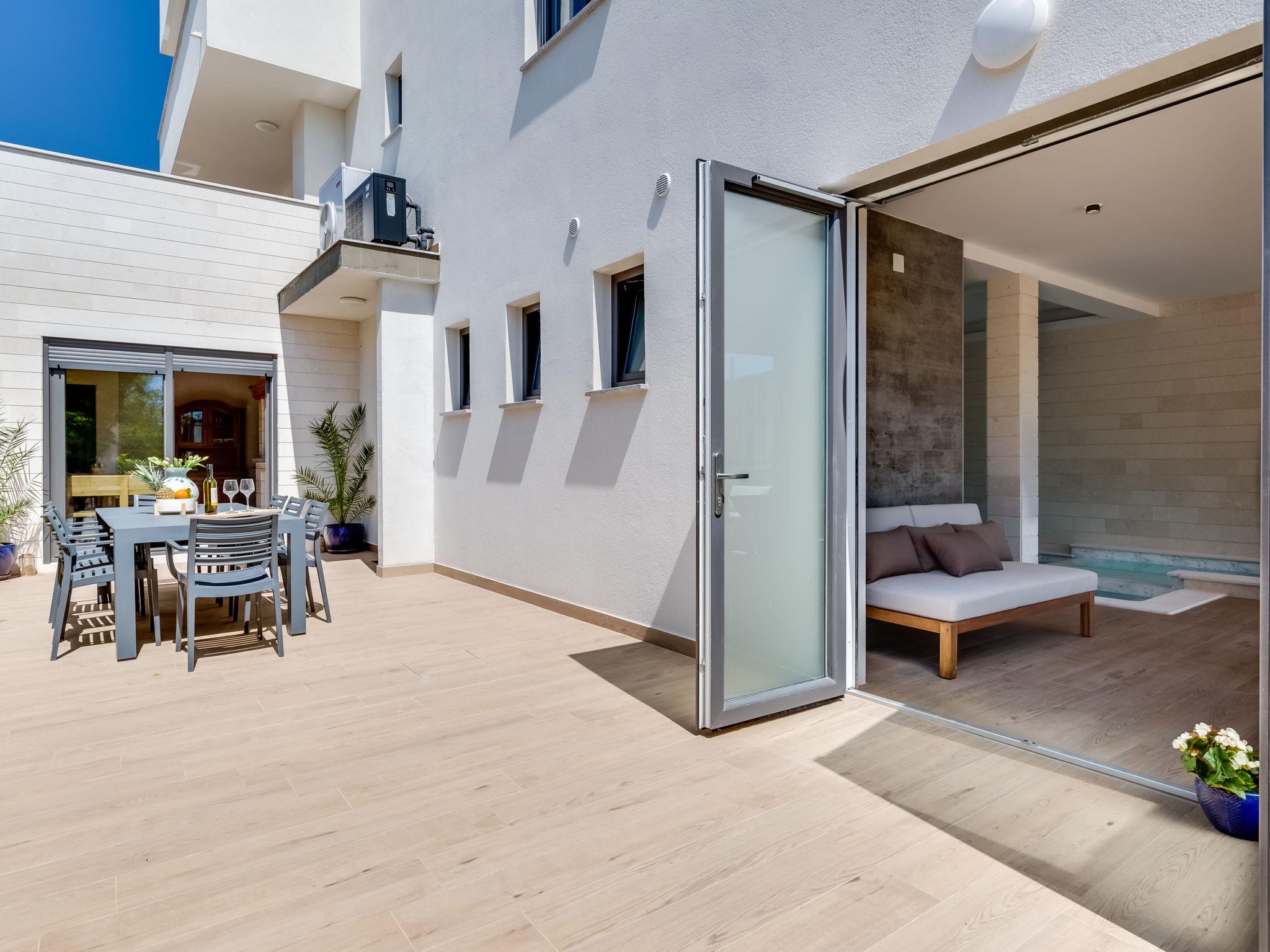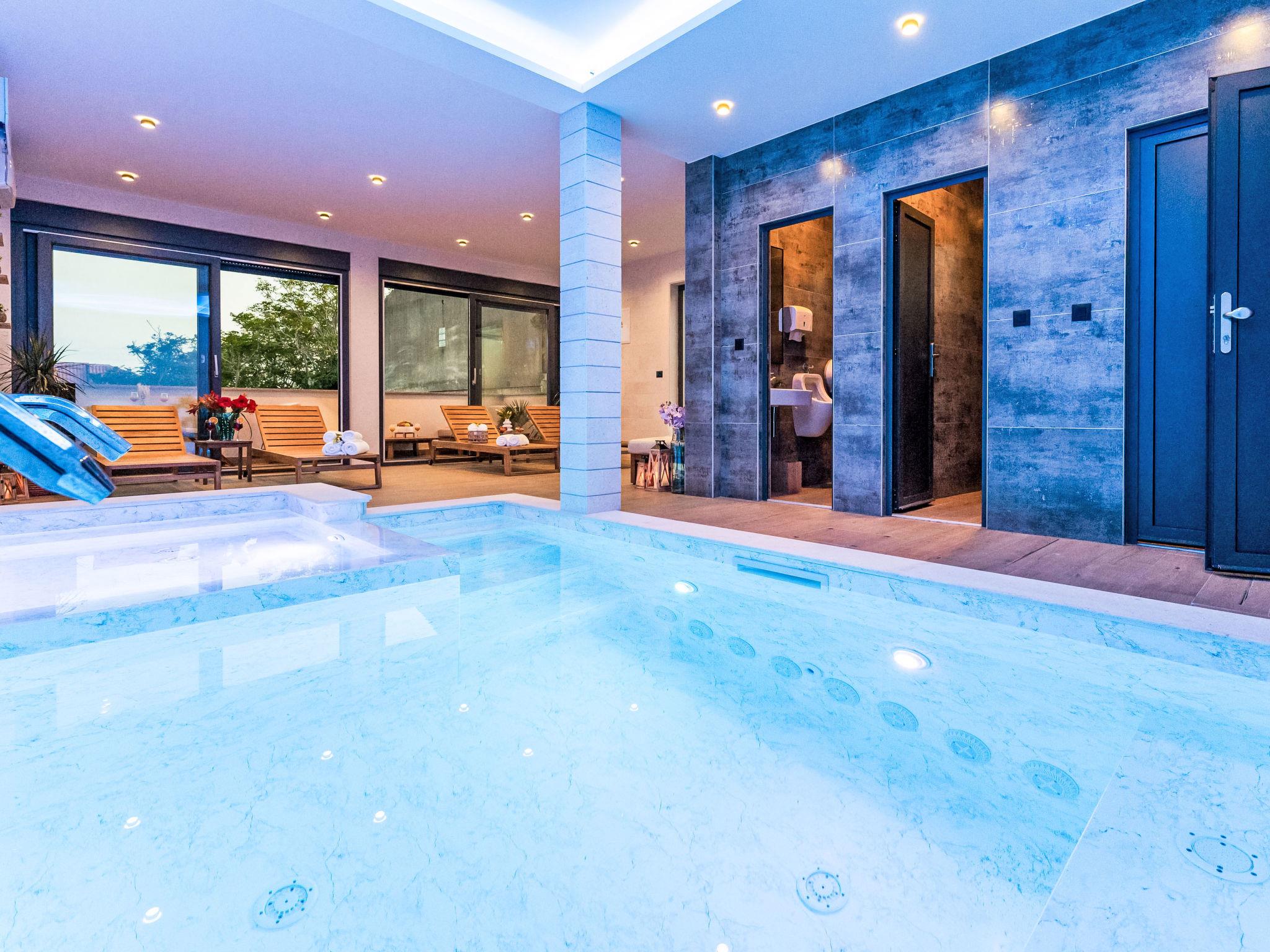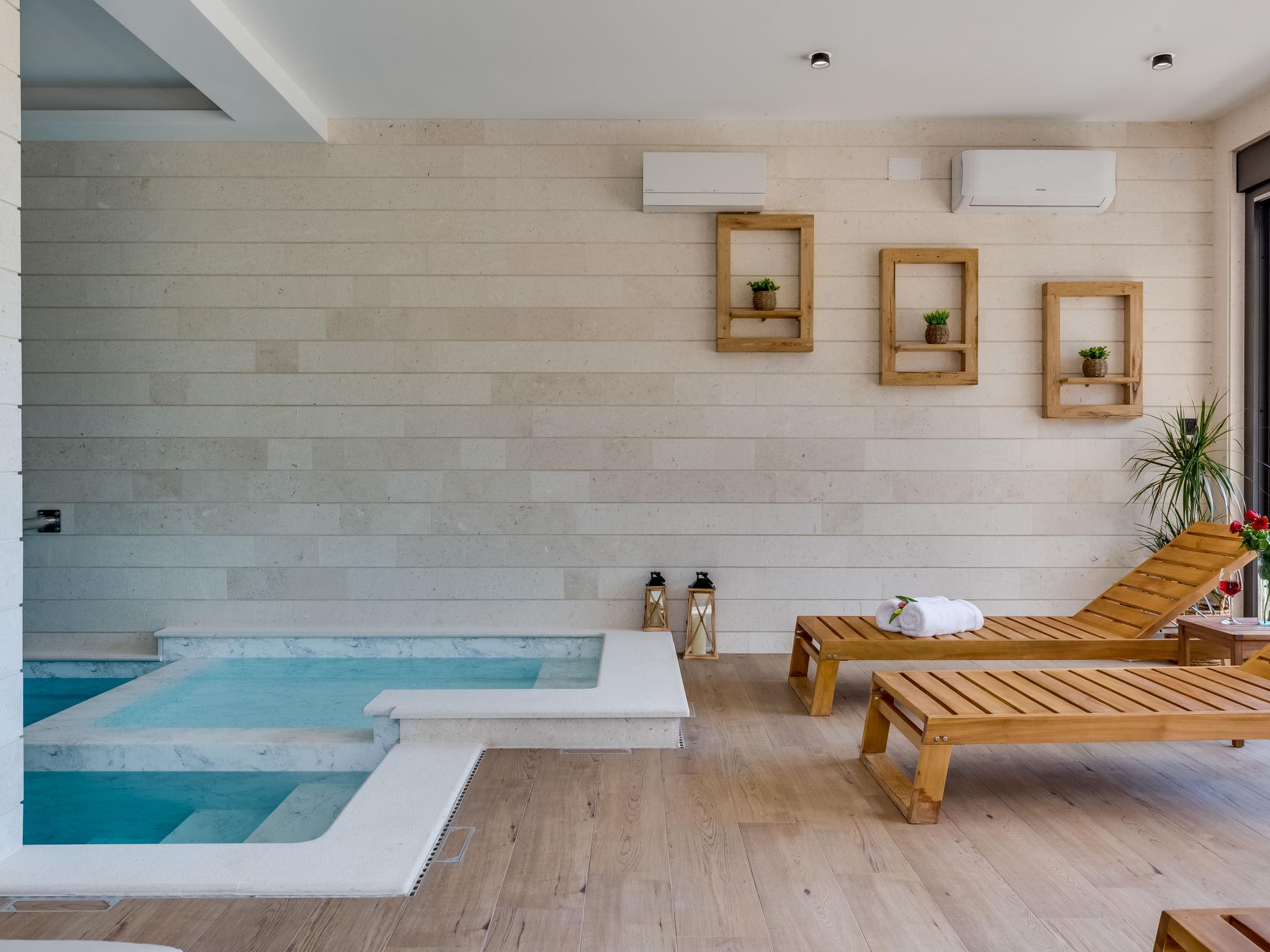 Apartment house "Luxury Villa Terra Maiorum", built in 2024. 100 m from the centre of Povljana, 13 km from the centre of Pag, in a sunny position, 1 km from the sea, 1 km from the beach. For shared use: property 380 m2, indoor pool heated (17 m2, depth 140 cm, seasonal availability: 01.Jan. - 31.Dec.) with internal staircase. WC in the pool area, children's pool, garden furniture, barbecue house. In the house: internet access. Motor access to the house. Parking (for 5 cars). Shop 80 m, restaurant 500 m, bakery 170 m, bus stop 14.5 km, sandy beach 1 km pebble beach 1.2 km. Please note: airfield 60 km from the property.