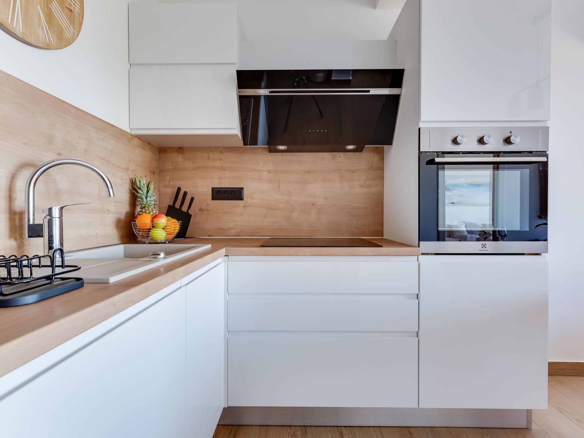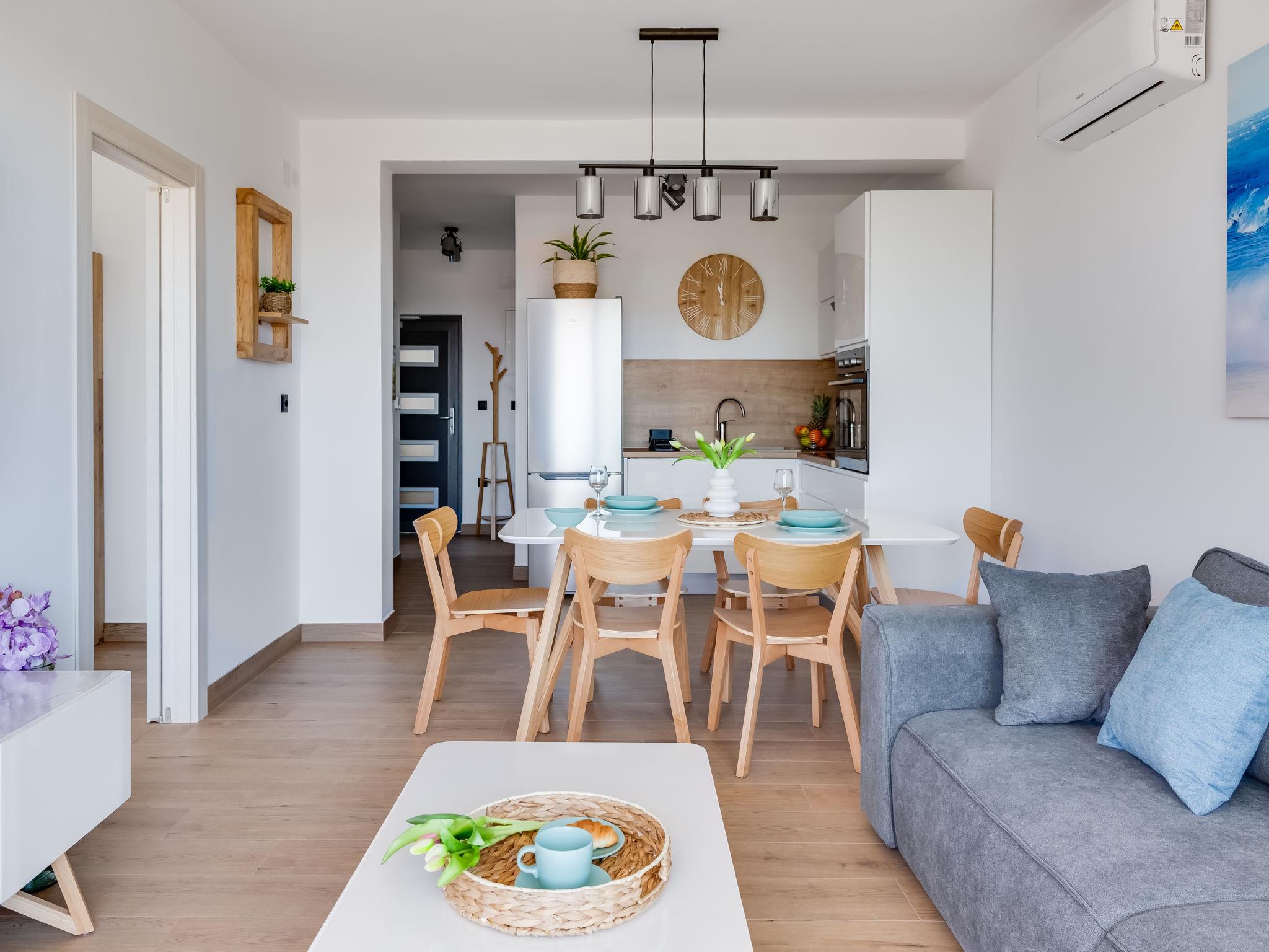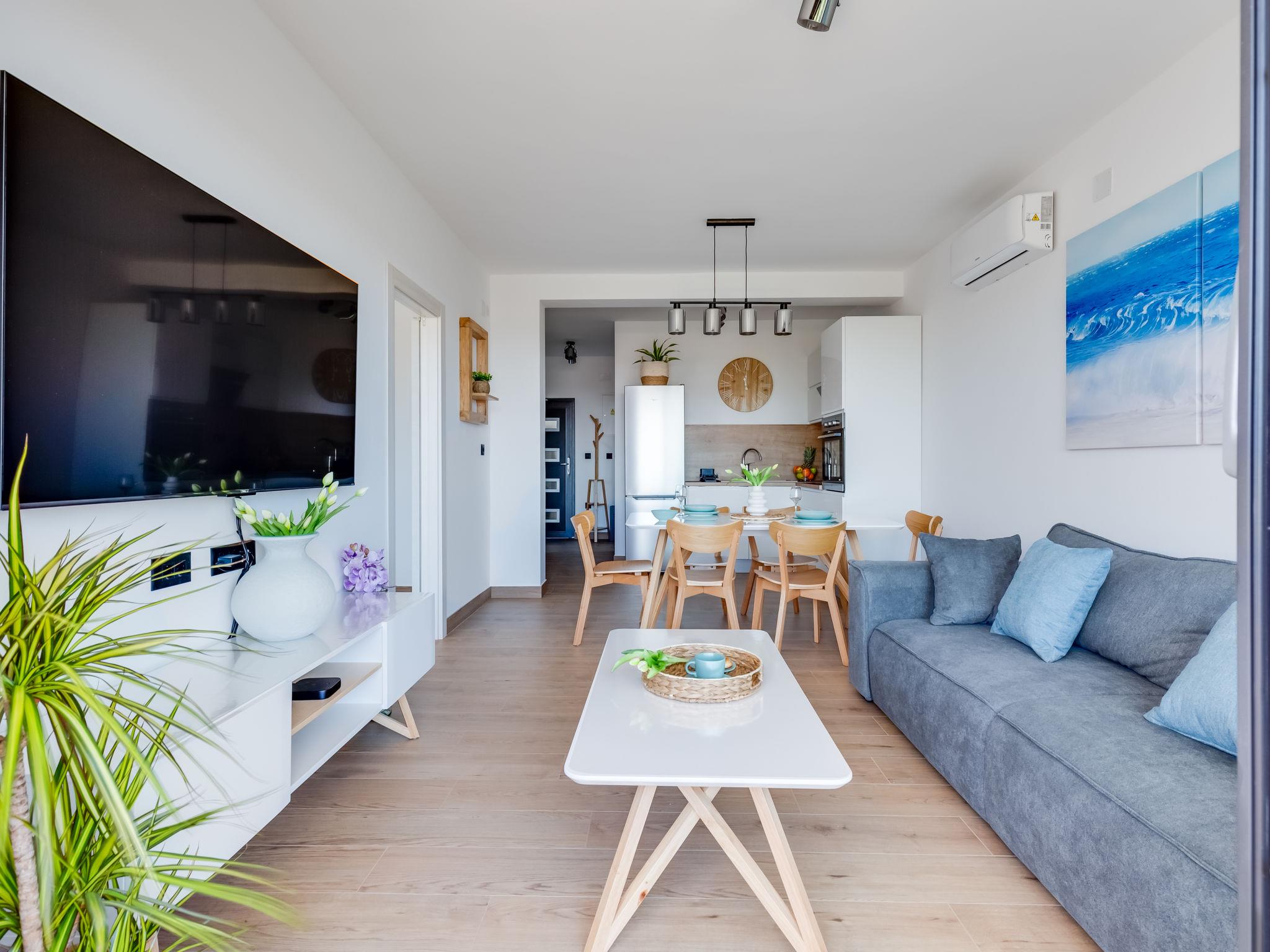 3-room apartment 65 m2 on 1st floor, south-west facing position. Living/dining room 35 m2 with cable TV and international TV channels (flat screen), air conditioning. Exit to the terrace. 1 room with 1 french bed (160 cm, length 200 cm), bath/WC and air conditioning. 1 room with 1 french bed (180 cm, length 200 cm). Open kitchen (oven, dishwasher, 4 induction hot plates, freezer, electric coffee machine). Shower/WC. Floor heating. Terrace 12 m2, roofed. Terrace furniture. Panoramic view of the sea. Facilities: washing machine, safe, hair dryer. Internet (WiFi, free). Maximum 1 pet/ dog allowed.