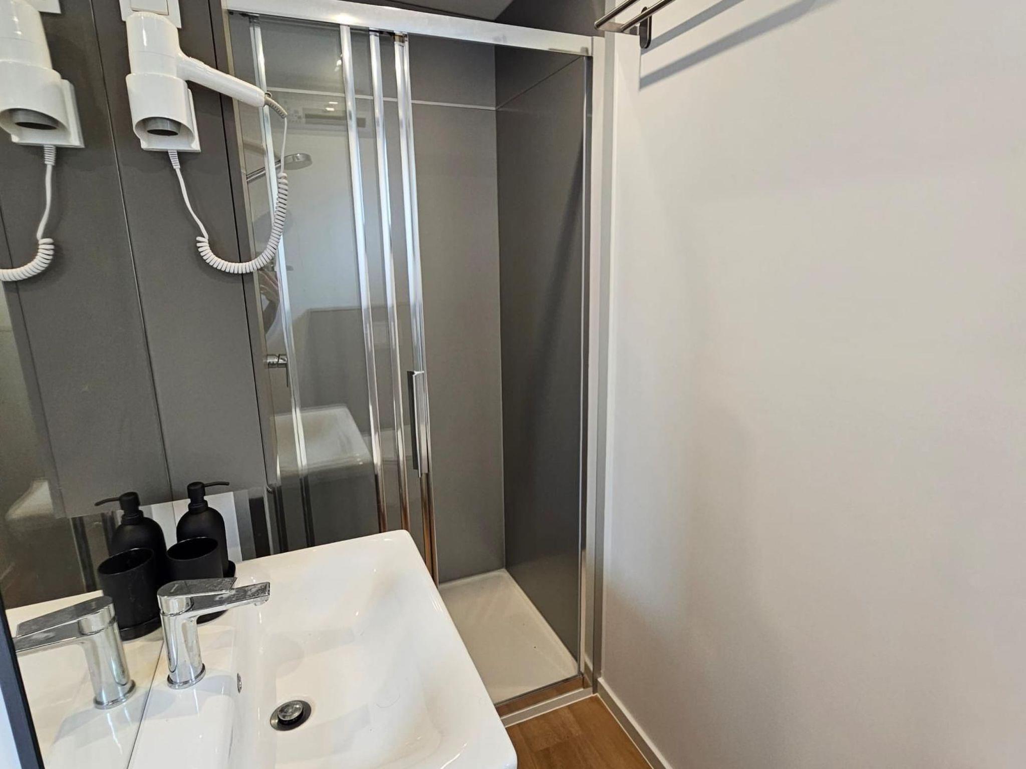 Inside, the mobile home boasts a well-appointed interior where each space is both functional and inviting. The two bedrooms offer serene havens for rest after days spent exploring the surroundings, while the two bathrooms ensure convenience for all guests. Central to the home is a spacious living area where everyone can gather, alongside a fully equipped kitchen fitted with an induction hob, capsule coffee machine, dishwasher, and electric kettle. The presence of air conditioning throughout guarantees your comfort no matter the weather outside.