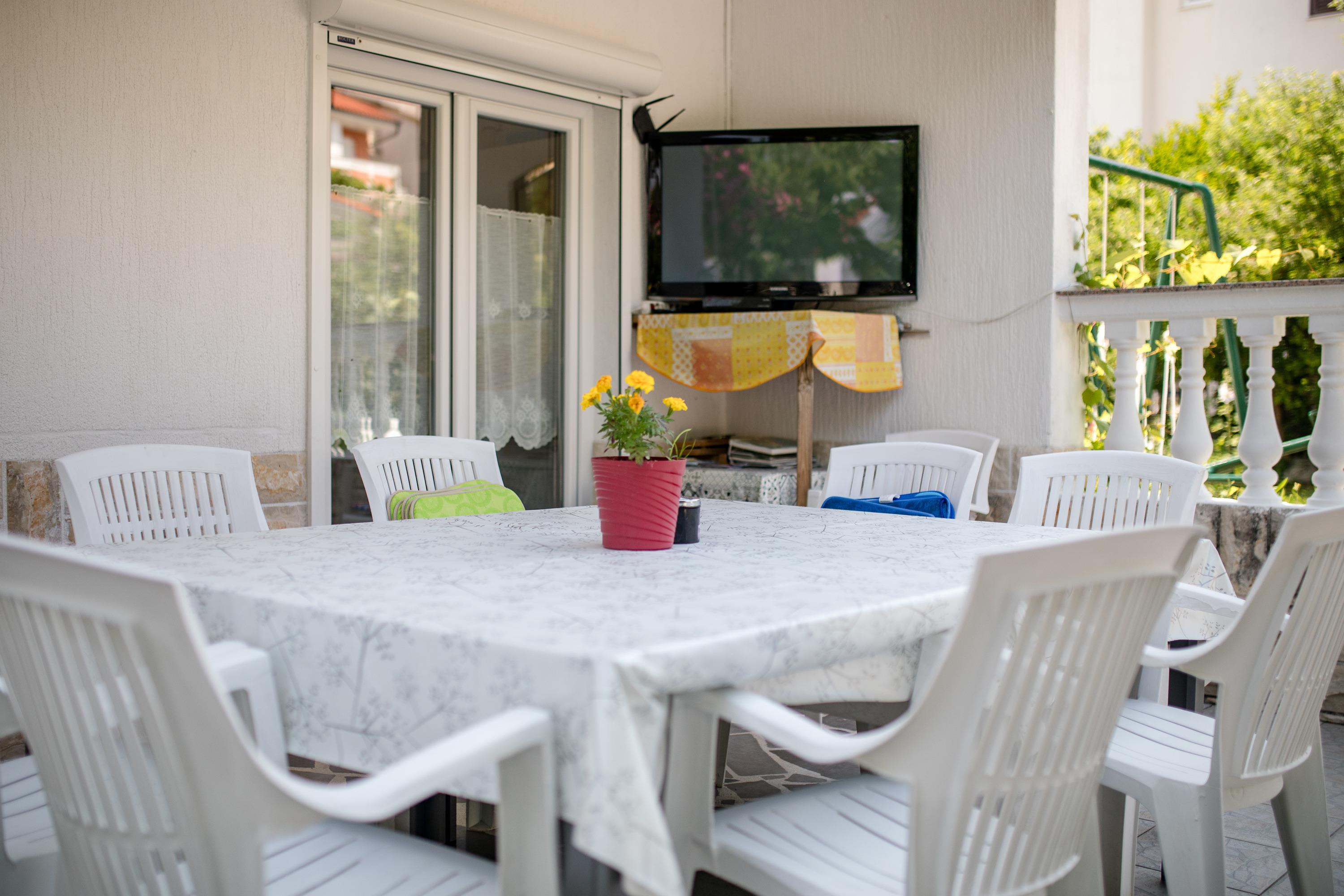 Das Wohnterrasse bietet einen Große Esstisch , sowie einen Flachbilderenseher- LCD Sat-TV .
