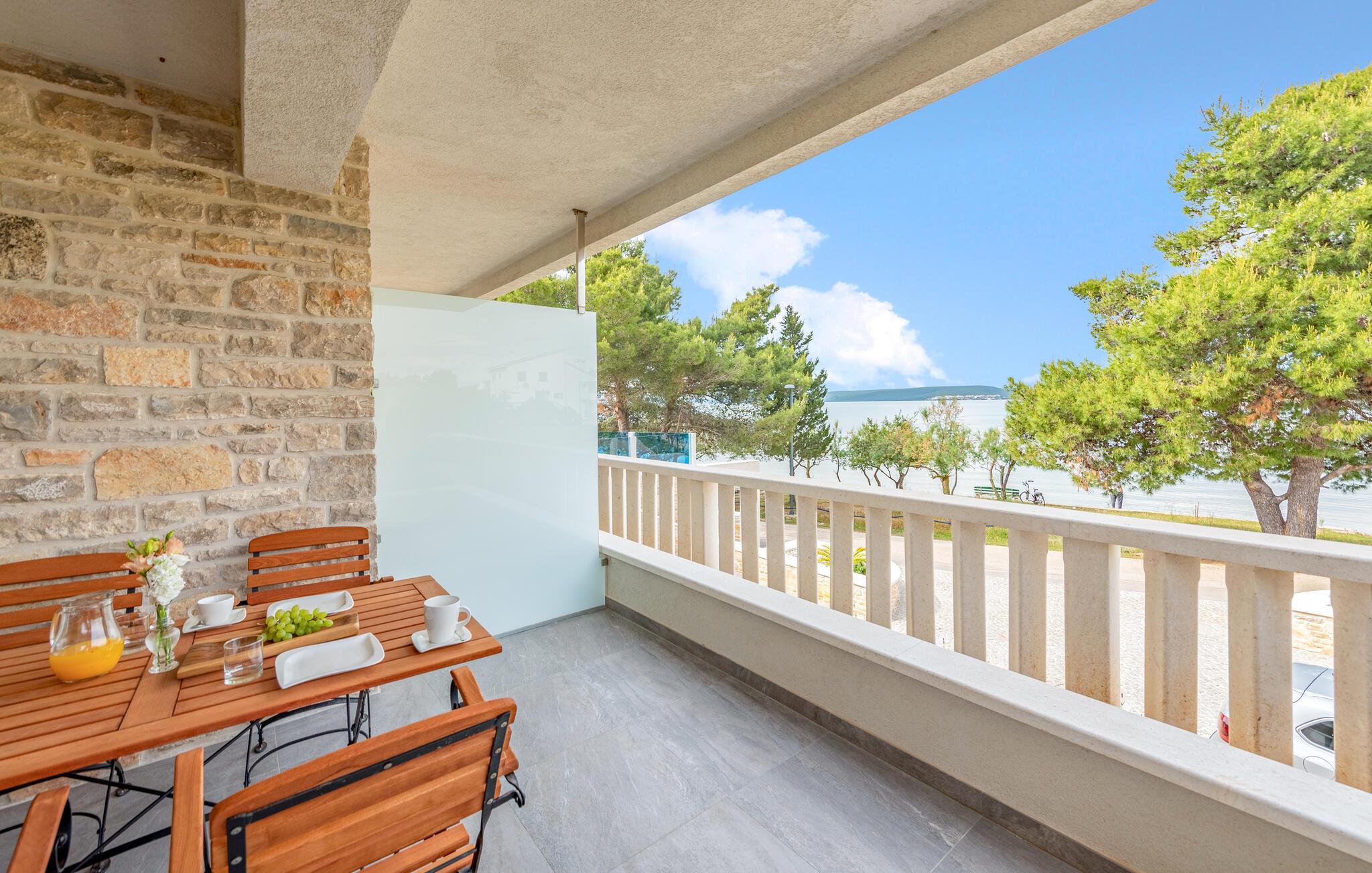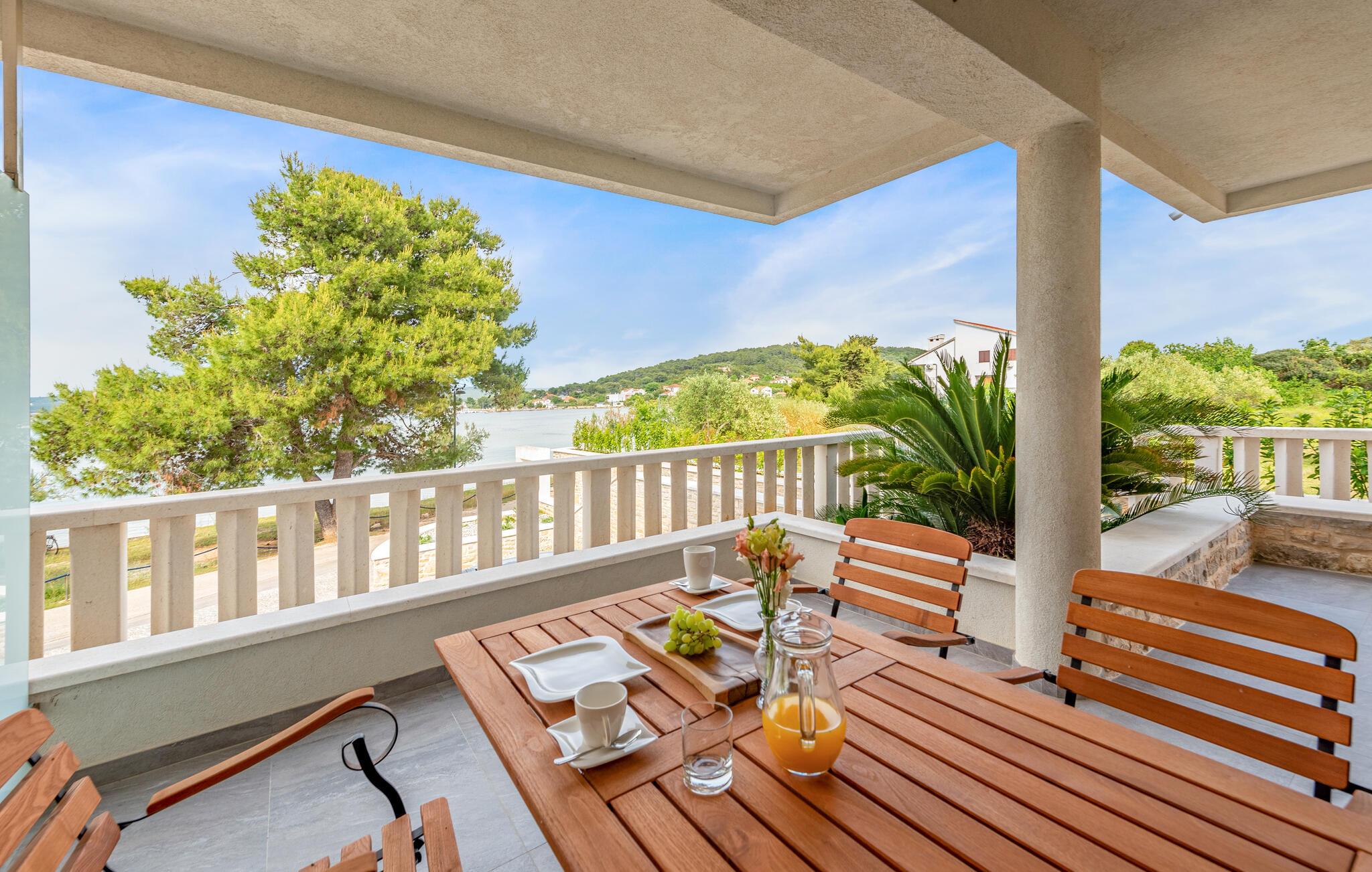 Glæd jer til et komfortabelt ophold i denne moderne lejlighed med adgang til fælles pool i første række til vandet.