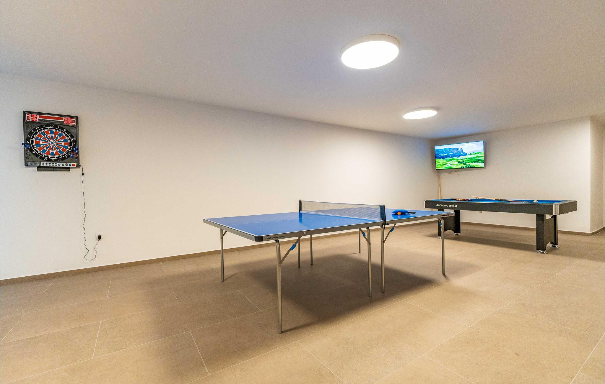 Træd ind i dette rummelige feriehus med familien og føl jer hjemme. Det skønne hus strækker sig over flere etager, hvor I kan slappe af og have det godt. Nyd det tiltalende design, et samspil mellem træ og fine materialer, og oplev, hvad huset har at byde på. Mens nogle laver lækre måltider i det åbne og moderne køkken, kan andre spille spil eller hygge sig i aktivitetsrummet. Bordtennis, billard og dart venter på jer her.
