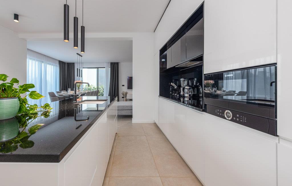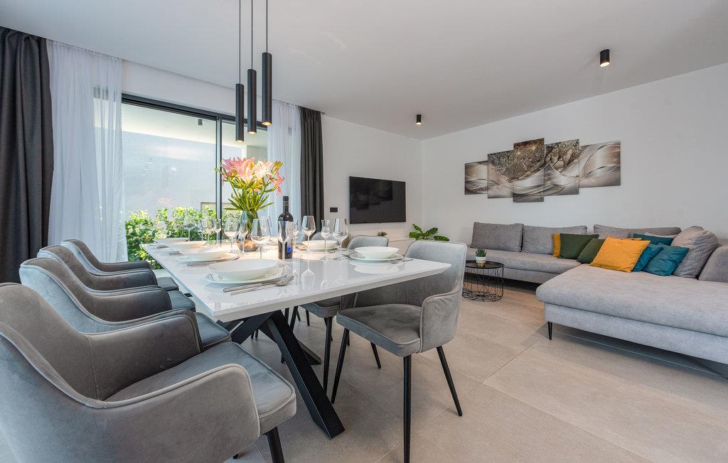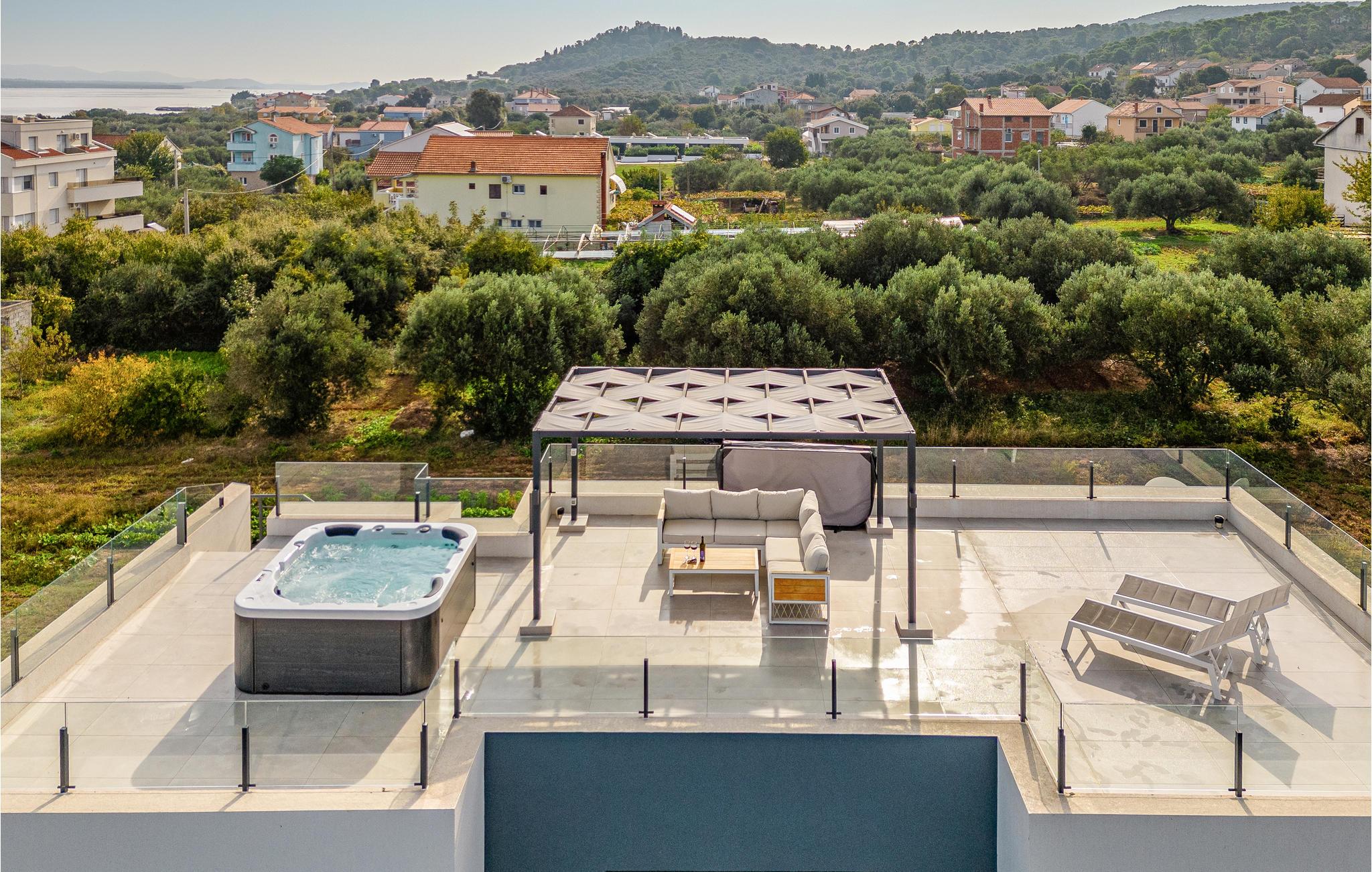 Dette moderne og rummelige feriehus med pool og jacuzzi ligger på øen Pasman, ikke langt fra stranden. Tilbring en uforglemmelig ferie i dette store og komfortable feriehus sammen med din udvidede familie eller par, du er venner med. Drømme går i opfyldelse her, for du kan fuldt ud nyde den højkvalitets indretning, den indbydende atmosfære og mange værelser og nyde socialt samvær og privatliv. Ikke alene har du det store opholdsrum til din rådighed, men hvis du træder udenfor, har du en smuk swimmingpool til din rådighed. Om aftenen kan I tilberede jeres yndlingsretter i udekøkkenet og spise dem sammen. Der er endnu et højdepunkt på taget, da en skøn tagterrasse strækker sig over hele gulvets areal, hvor I kan slappe af sammen i jacuzzien og havemøblerne og se ud over havet. Om natten kan du beundre den magiske himmel med dens stjerner. Rejser du med en stor familie eller med flere familier, der er venner, kan nabohuset også lejes. Grib din strandtaske og gå de få meter til stranden, som er en blanding af sand, beton og småsten. Dyk ned i det krystalklare vand og spil derefter beachvolley på stranden eller se dine børn lege på legepladsen. Pašman er synonymt med landskabets vilde skønhed, bugter og undervandsverden. Vandretur til Veliki Bokolj, et udsigtspunkt i sten, der giver et glimt af de fortryllende Kornati-øer. Du kan udforske offshore-øerne med båd og besøge den livlige havneby Biograd na Moru eller Zadar. Udforsk den historiske gamle bydel, mens du går gennem de små gader, er der mange smukke steder og attraktioner at opdage. Glæd dig til en afslappende ferie ved havet!