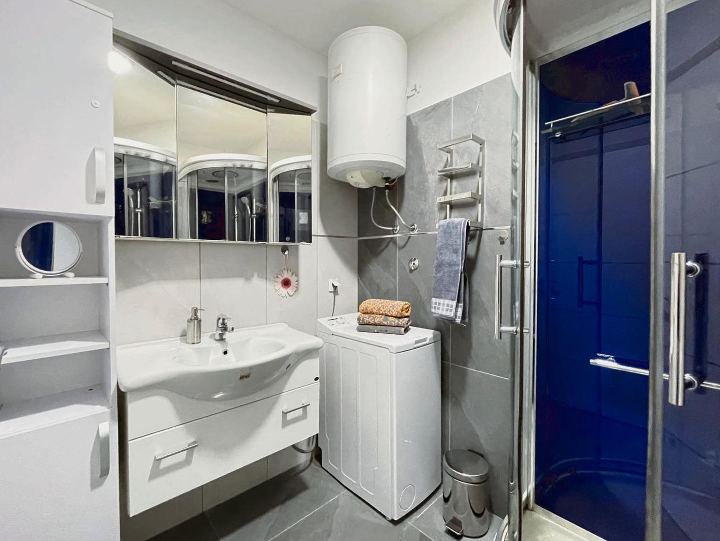 Das Badezimmer ist mit Wohlfühl-Regendusche und Massagefunktion ausgestattet. Das integrierte Radio ergänzt Ihr Duscherlebnis mit wohligen Klängen. :-)