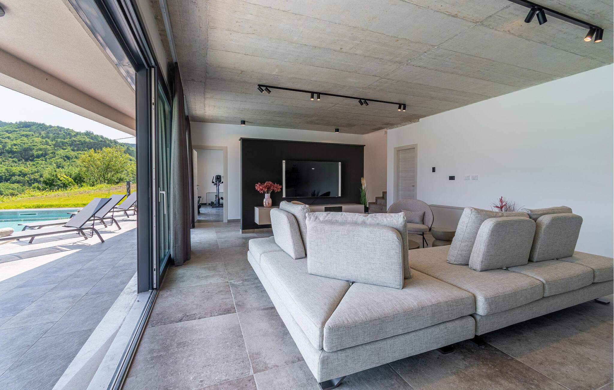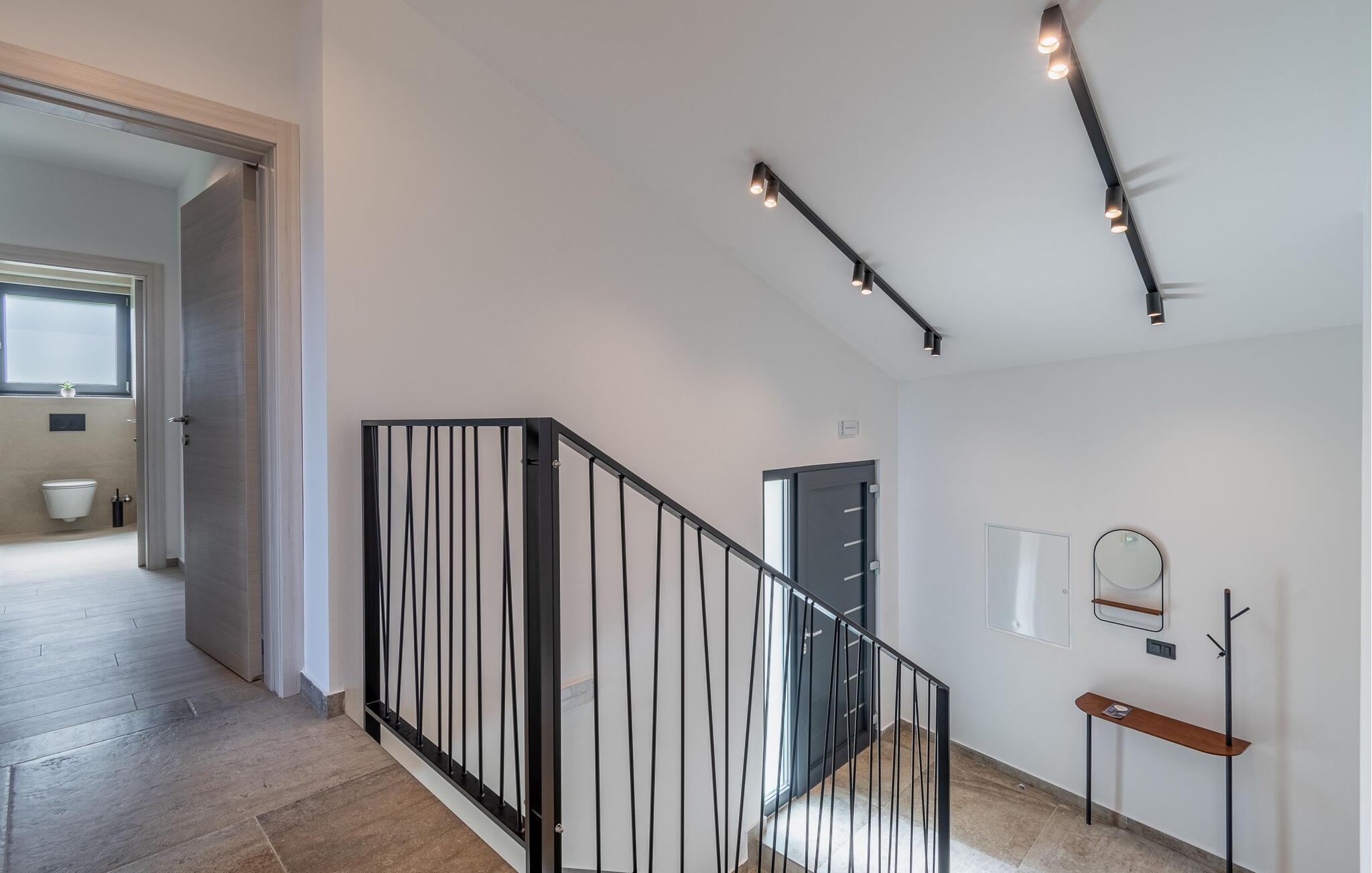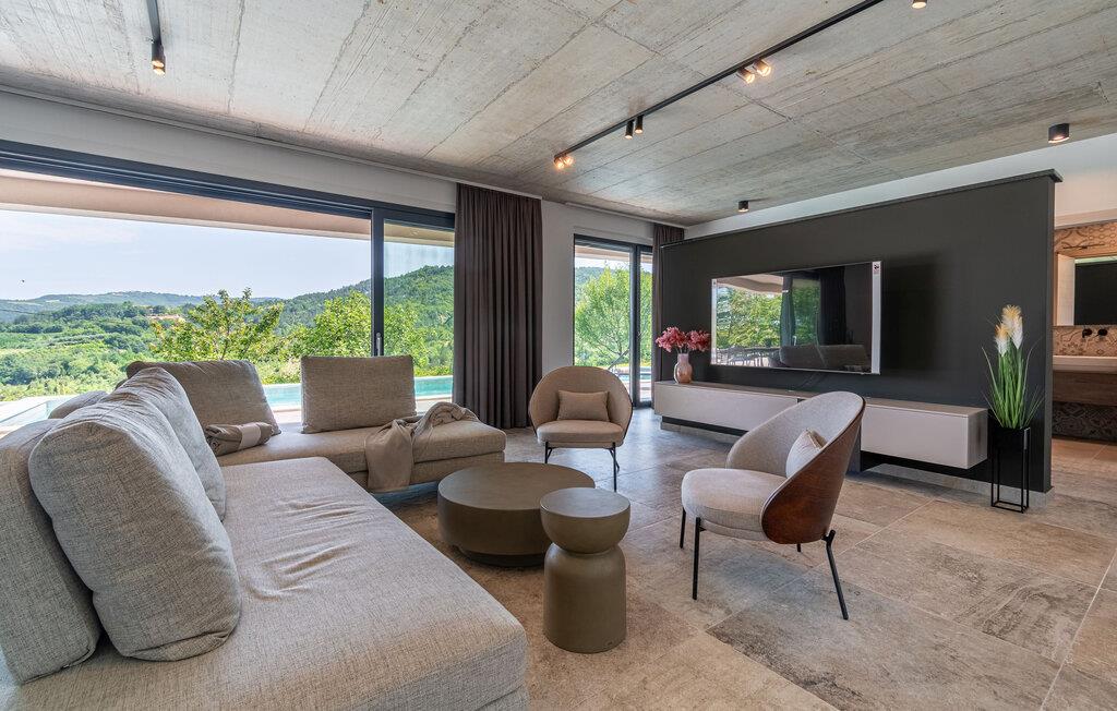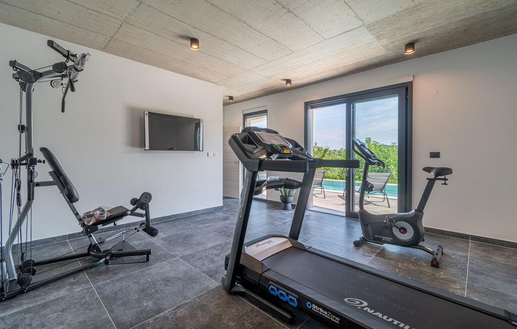 Dette stilfulde feriehus nær Pazin lægger op til at nyde livet og have det rart med sit moderne design og komfortable møbler. Nyd afslappende timer på den solrige terrasse, som er udstyret med komfortable udendørsmøbler eller snup en frisk dukkert i poolen, som byder på en fantastisk udsigt over de omkringliggende grønne bakker. Begynd dagene med en afslappet morgenmad på den rummelige terrasse eller afslut aftenen med en grillmiddag. Husets åbne opholdsstue byder på masser af plads til at slappe af og et veludstyret køkken, hvor I kan lave mad sammen. Fitness kommer I heller ikke til at mangle. Brug fitnessrummet til at holde jer i form, mens I er på ferie.