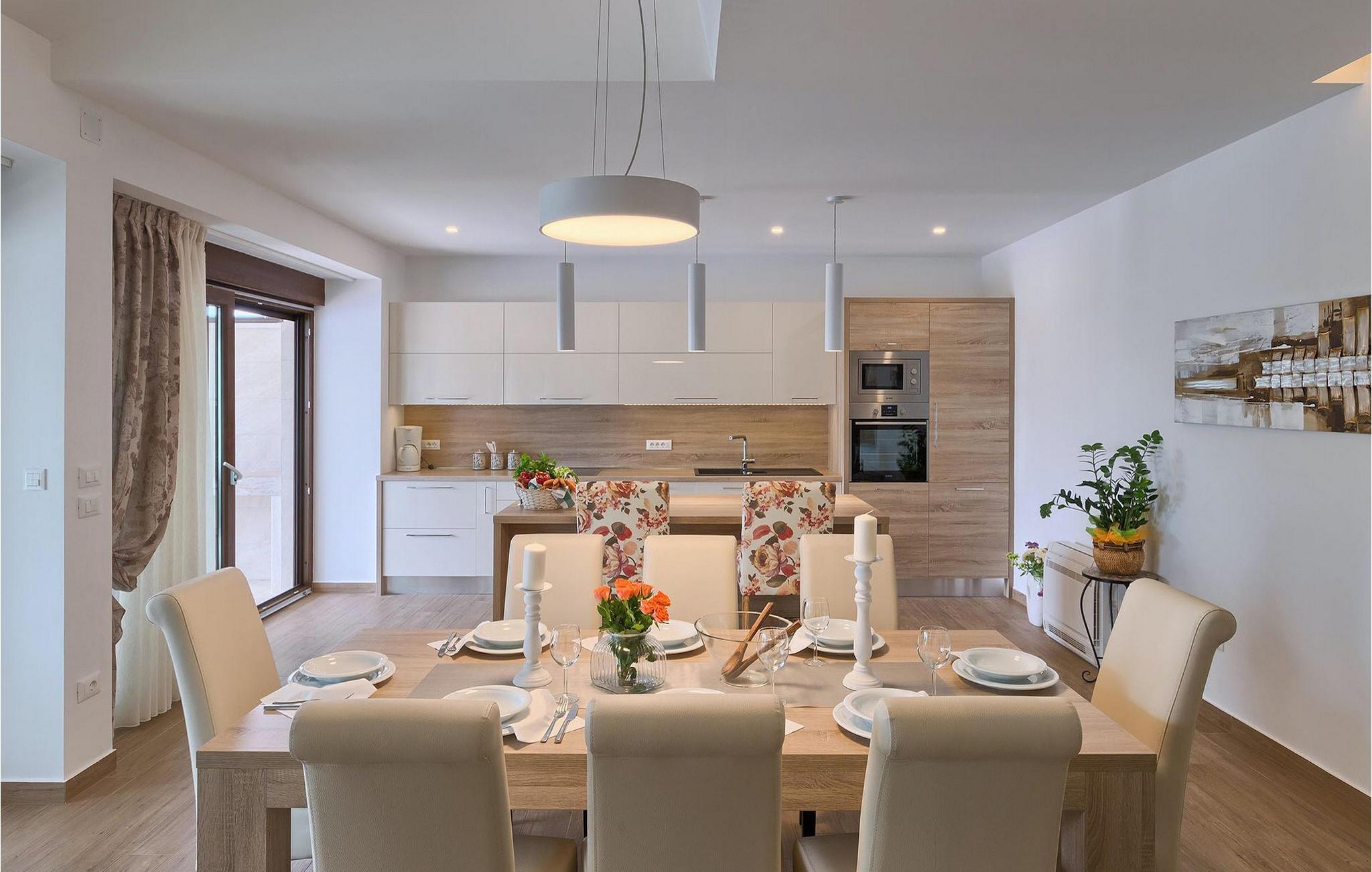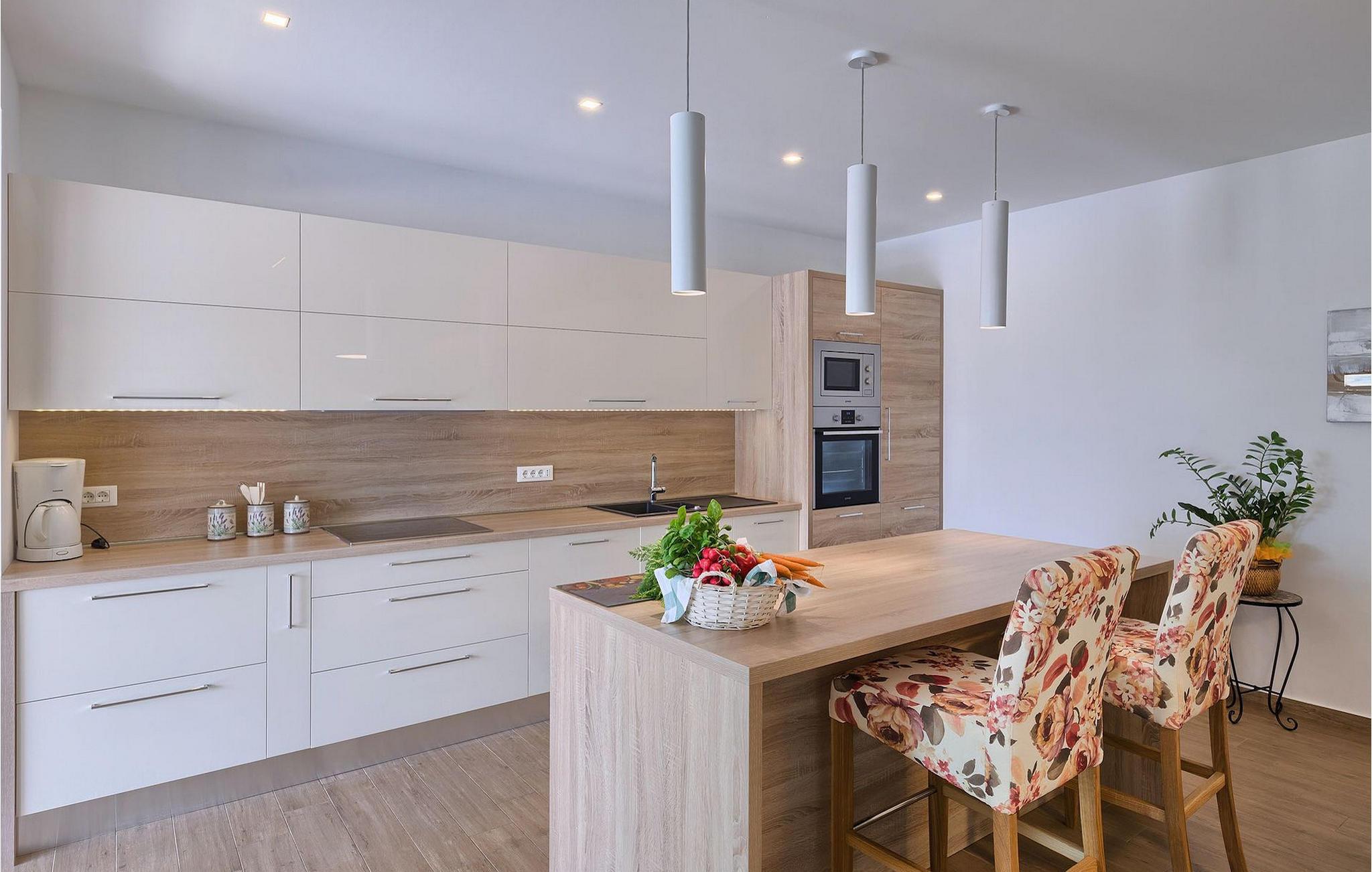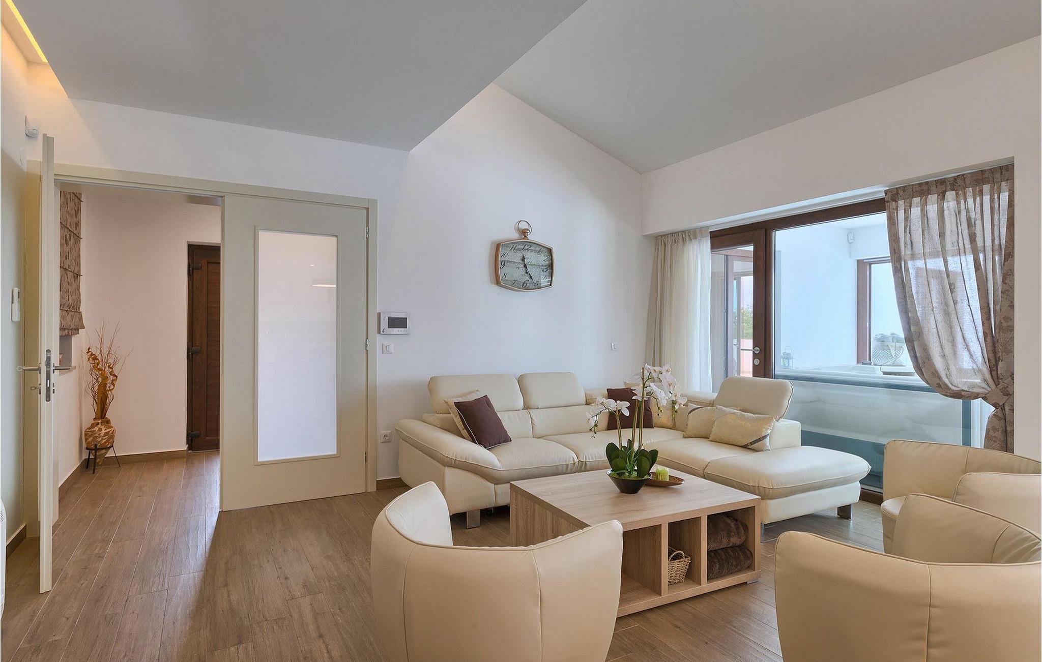 Et af soveværelserne er beliggende i stueetagen, bekvemt med direkte adgang til den udendørs terrasse og poolområdet. De resterende 2 soveværelser ligger på 1. sal langs en terrasse med smuk udsigt over det omkringliggende landskab. Stueetagen rummer også et åbent lys stue-spisestue-køkkenområde, som et dejligt sted at dele et måltid med din familie og venner. Den indendørs jacuzzi, som et ekstra afslapningstilskud – lige ved siden af opholdsstuen, kun lukket af glasvægge, der kan åbnes ud mod det fri, hvis du ønsker det. Hvis du foretrækker det udendørs, rummer den dejlige terrasse med smuk udsigt et fælles område med mulighed for udendørs spisning og grill til din brug. Lige ved siden af kan du slappe af ved den skønne pool, uanset om du foretrækker at svømme eller solbade. For dem, der er interesserede i andre former for underholdning i deres ferietid, tilbyder Villa Mala Halu et poolbord og bordfodbold. Hvis du kan lide at være mere aktiv i det fri, har villaen 4 cykler (2 store, 2 små), så du kan udforske de dejlige omgivelser.