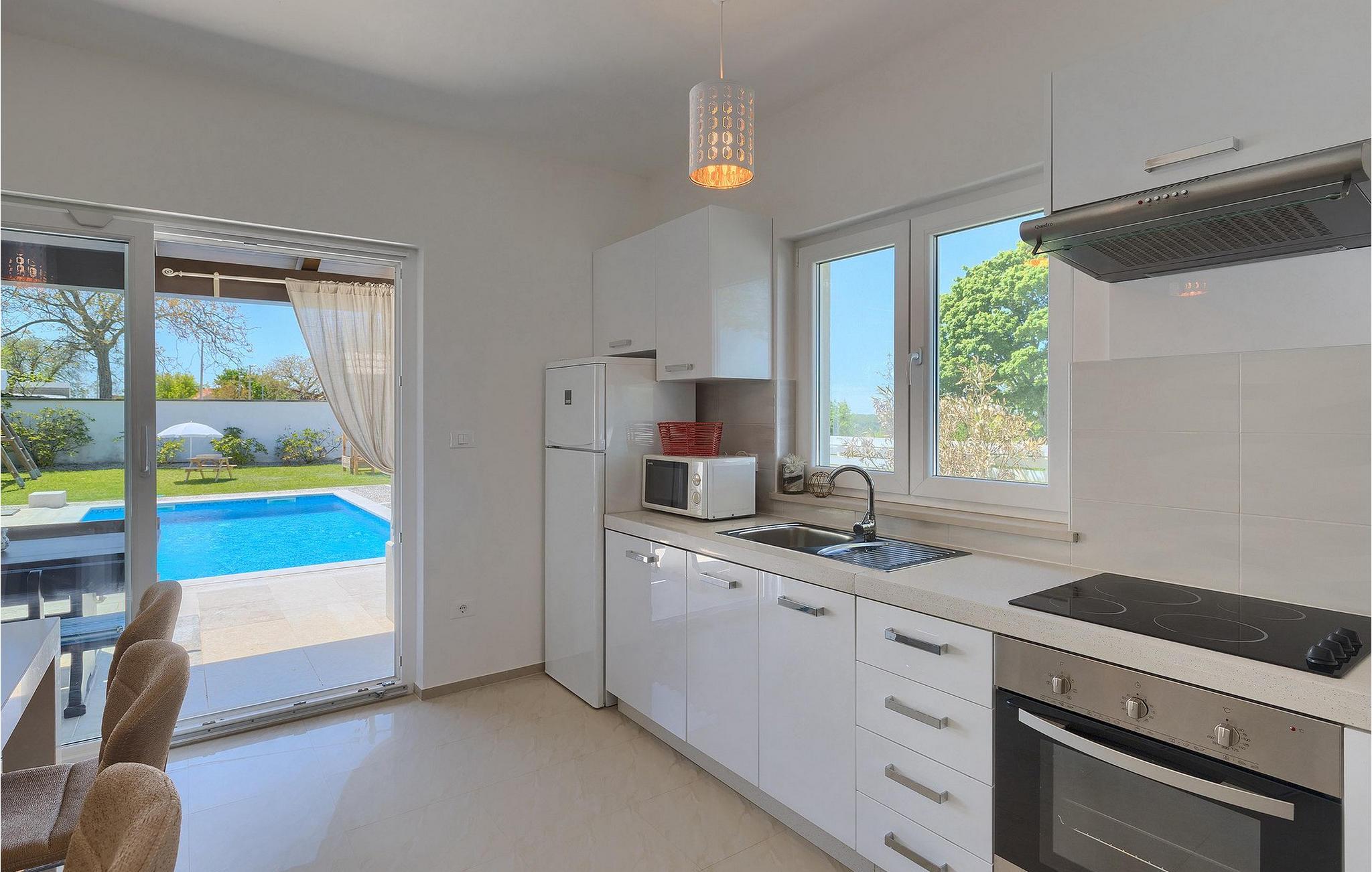Das offen konzipierte und lichtdurchflutete Erdgeschoss verfügt über ein Wohnzimmer, eine Küche, ein Esszimmer und ein Badezimmer. Vom Wohnzimmer/Küche aus haben Sie direkten Zugang zum schönen privaten Pool mit Sonnenliegen.
