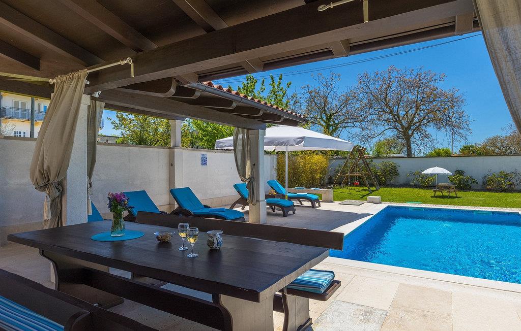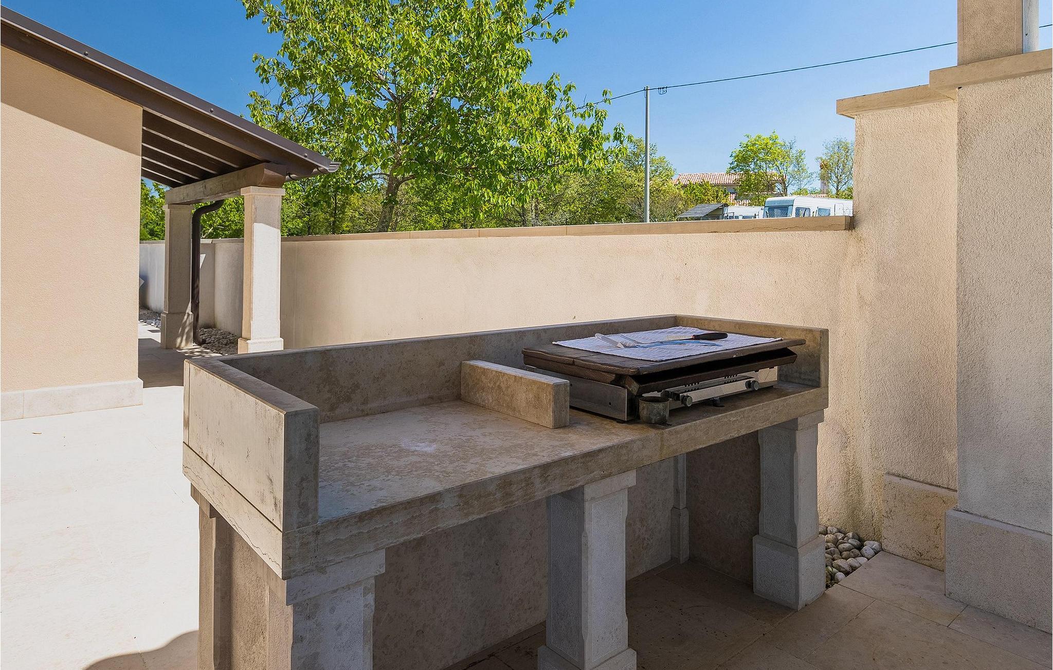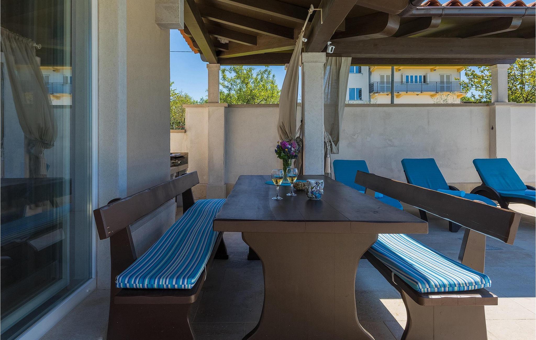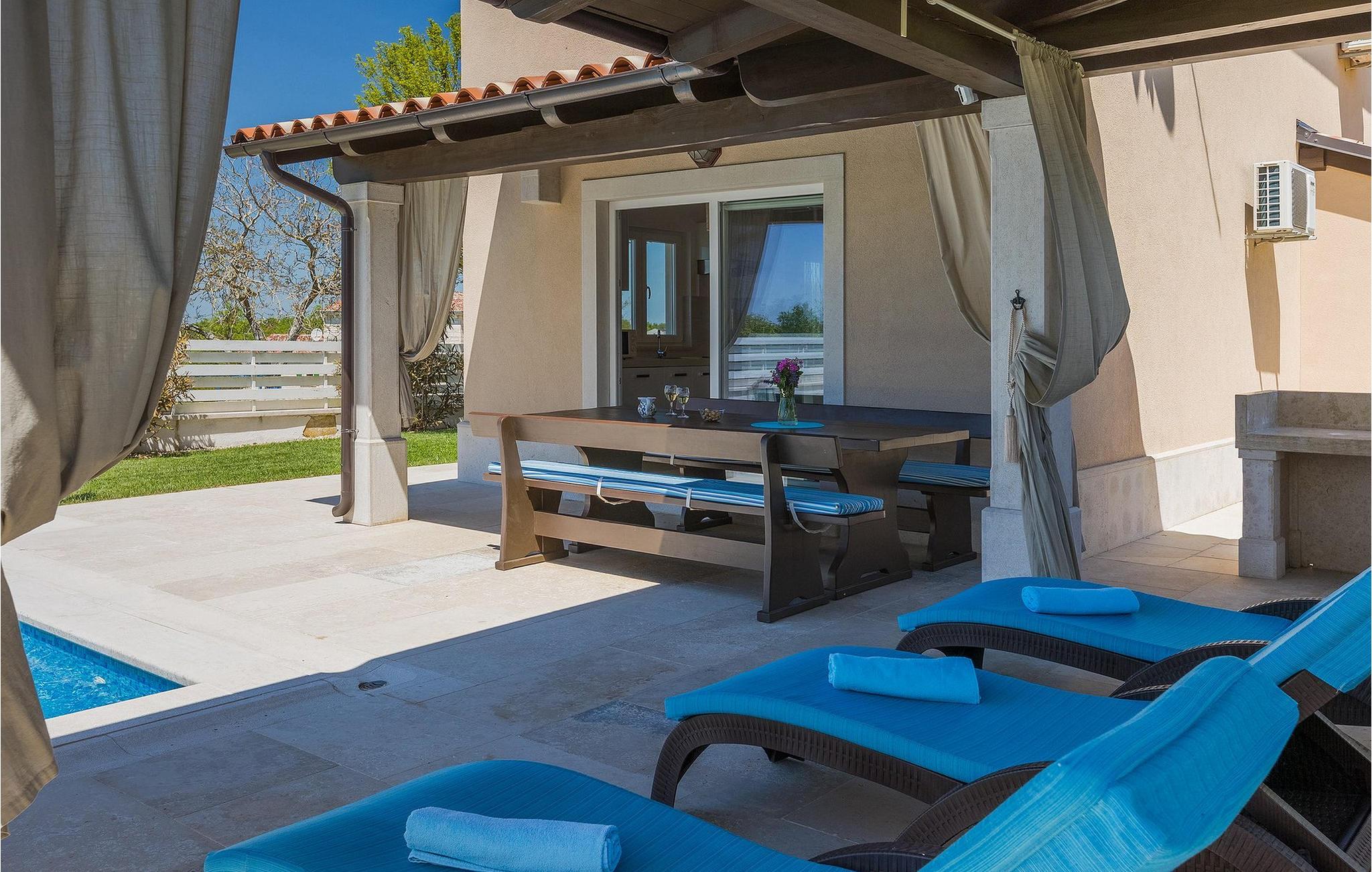Neben dem Pool befindet sich eine überdachte Terrasse mit Esstisch und Grill, wo Sie köstliche Mahlzeiten zubereiten können.