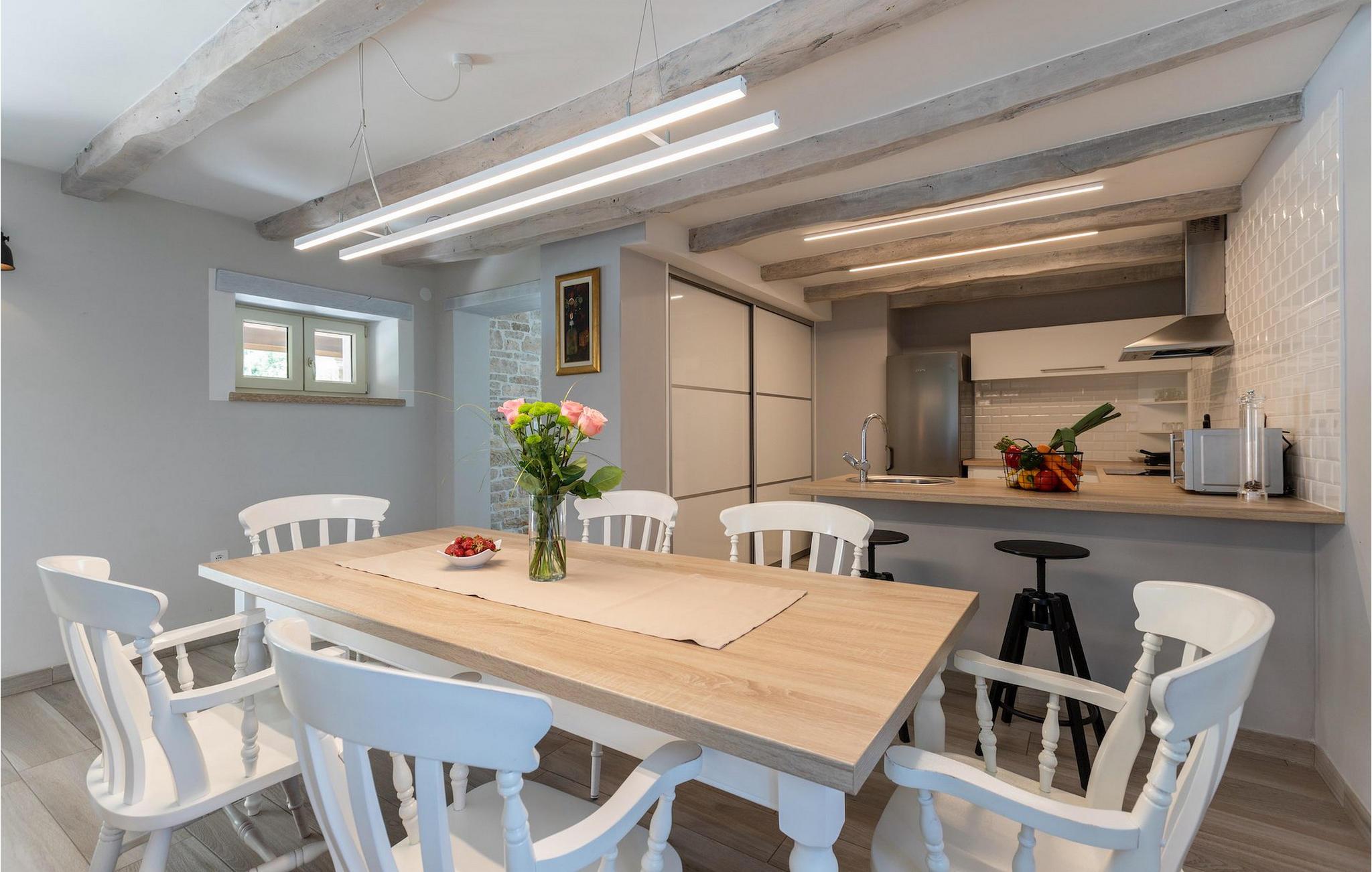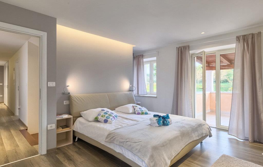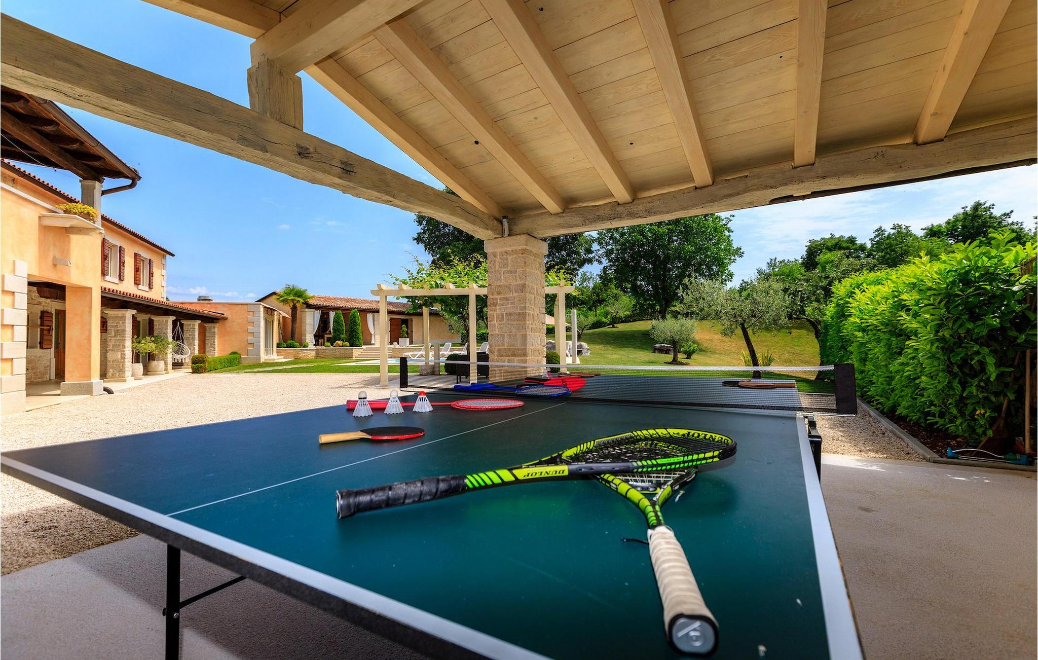 Kan du forestille dig noget mere behageligt end at slappe af på en terrasse under den blå himmel, med en betagende udsigt, der strækker sig over det maleriske istriske landskab, kendt for sine endeløse grønne marker og vinmarker? Er det lige præcis den slags ferie, du ønsker, så er Villa Viscum det perfekte hus for dig. Der blev lagt en masse omtanke og omhu i at holde denne villa i harmoni med den omgivende natur, men alligevel gøre den både komfortabel og funktionel. Villaen består af 3 soveværelser og 2 badeværelser, hvoraf det ene er ensuite. Tilbring din ferie i Istrien med at svømme eller dyppe i poolen, mens den varme kroatiske sol fylder batterierne op. Vil du holde en mere aktiv ferie, står villaens private idrætsplads til rådighed, hvor du kan tilbringe tid med venner og familie til volleyball, fodbold eller badminton. Efter en aktiv dag er den perfekte ting at gøre at gøre brug af grillen og den udendørs terrasse, hvor du kan nyde nogle af de bedste kroatiske kulinariske specialiteter. Villa Viscum ligger i et fredeligt og roligt område med udsigt over vinmarker, landsbyer og bondegårde spredt ud over de maleriske bølgende bakker med den smukke sø Butoniga som baggrund. Den stolte middelalderby Pazin ligger dog kun 4 km væk. Bygget på stejle klipper med udsigt over den mægtige dybe kløft, har det altid været genstand for historier, legender og interesser. Sådanne bemærkelsesværdige landskaber har inspireret den berømte franske forfatter Jules Verne, såvel som mange andre kroatiske forfattere, så du vil bestemt ikke lade dig uinspireret. Det kan prale af det bedst bevarede slot i Istrien, en massiv bygning, hvorfra hele Istrien engang blev styret. Slottet er nu et museum, som blandt andet opbevarer gamle istriske klokker. Neden for slottet falder floden Pazincica, mens den velkendte Pazin Chasm stadig holder på sine hemmeligheder. Grotten med sine imponerende søer er stadig en udfordring for speleologer, mens hele området bugner af smukke naturlige mesterværker af vandfald, vandløb og fordybninger. Udover masser af historiske og kulturelle seværdigheder, exceptionelt traditionelt køkken, fremragende Malvasia og hjemmelavet grappa, tilbyder Pazin og dens omgivelser varierede steder for en aktiv ferie. Sports- og eventyrentusiaster vil finde masser af aktiviteter: ziplining, bjerg- og rekreationscykling, et stort antal vandre- og vandrestier omgivet af smukke naturfænomener og næsten glemte gamle kirker og paladser. Der er også berømte steder for fri klatring, imponerende speleologiske ture, fiskeri i ferskvand, mens hele dette attraktive område kan besøges ved at ride på hesteryg og lære skattene i det tidligere Pazin-amt tæt at kende. Den attraktive Adriaterhavskyst er let tilgængelig ad fremragende veje.