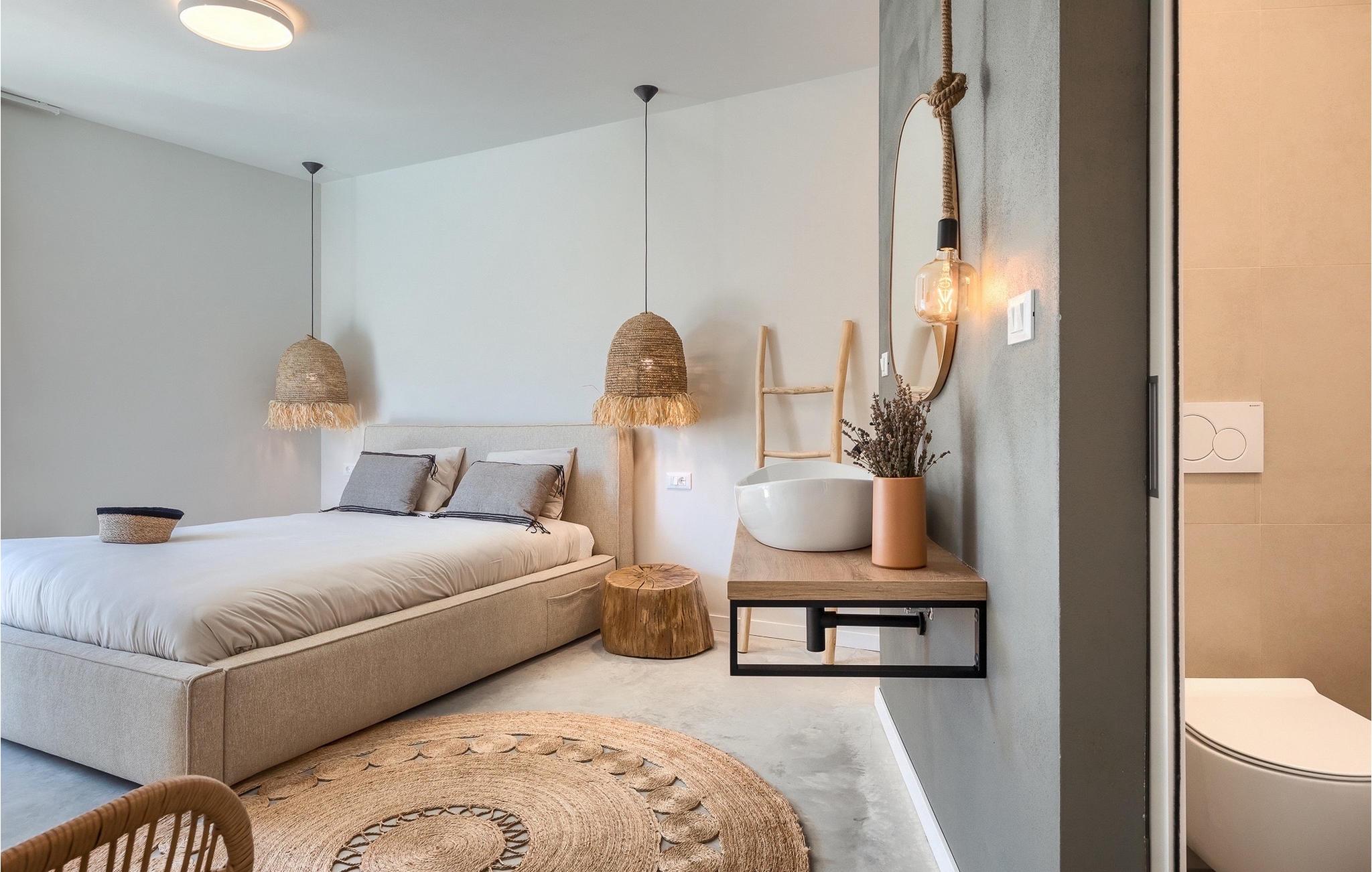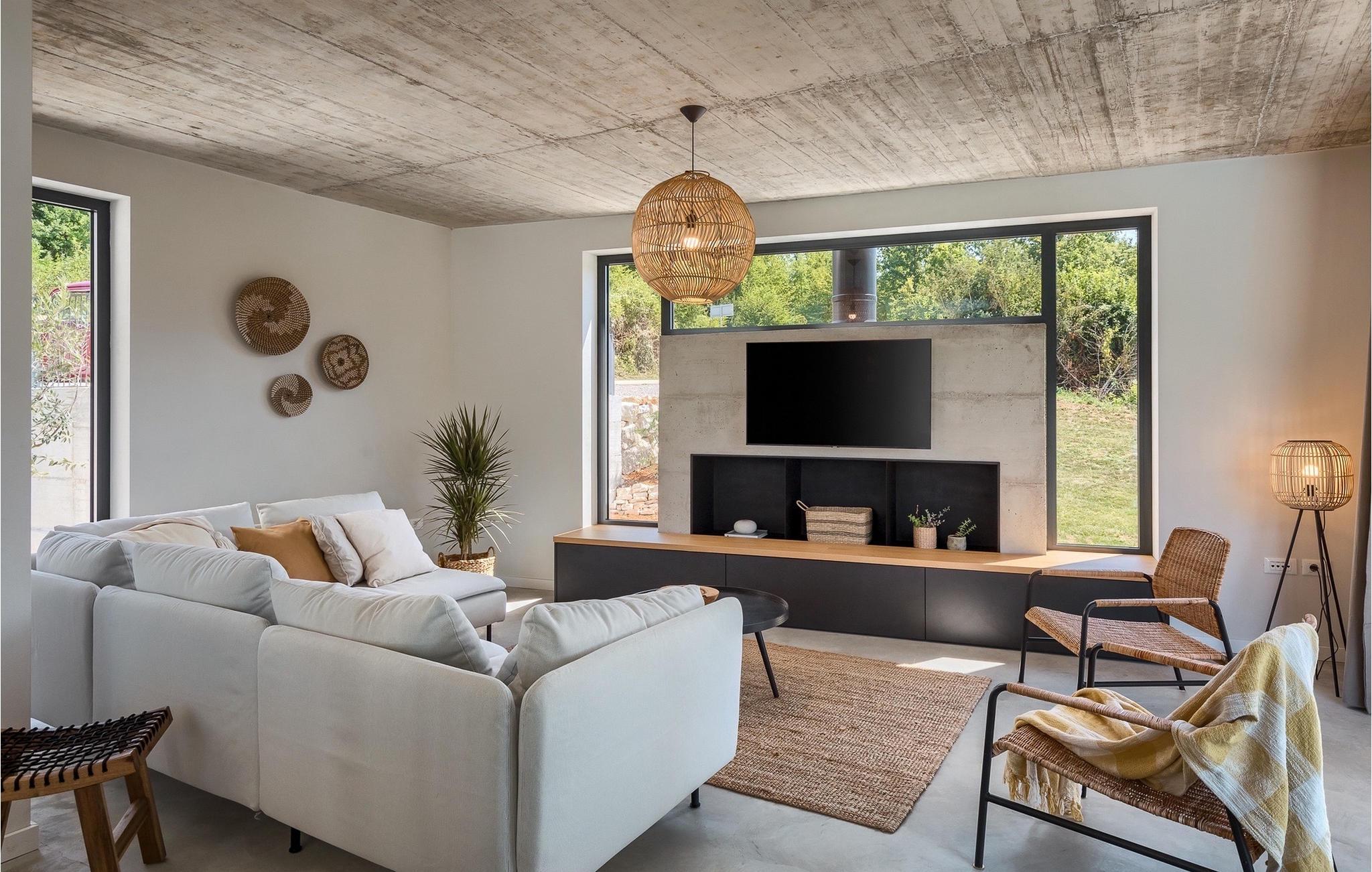 Det moderne interiør i Villa ZEL udstråler en beroligende atmosfære, med bløde farver og elegante møbler, der skaber en behagelig stemning. Store vinduespartier med udsigt til terrassen forbinder indendørs og udendørs arealer harmonisk. Den elegant indrettede stue strækker sig over stueetagen, hvor du også finder en hyggelig spisestue og et moderne fuldt udstyret køkken. På samme etage er der tre smukt møblerede soveværelser med badeværelser, hvor du finder den perfekte harmoni af mørke farver og naturlige materialer.
