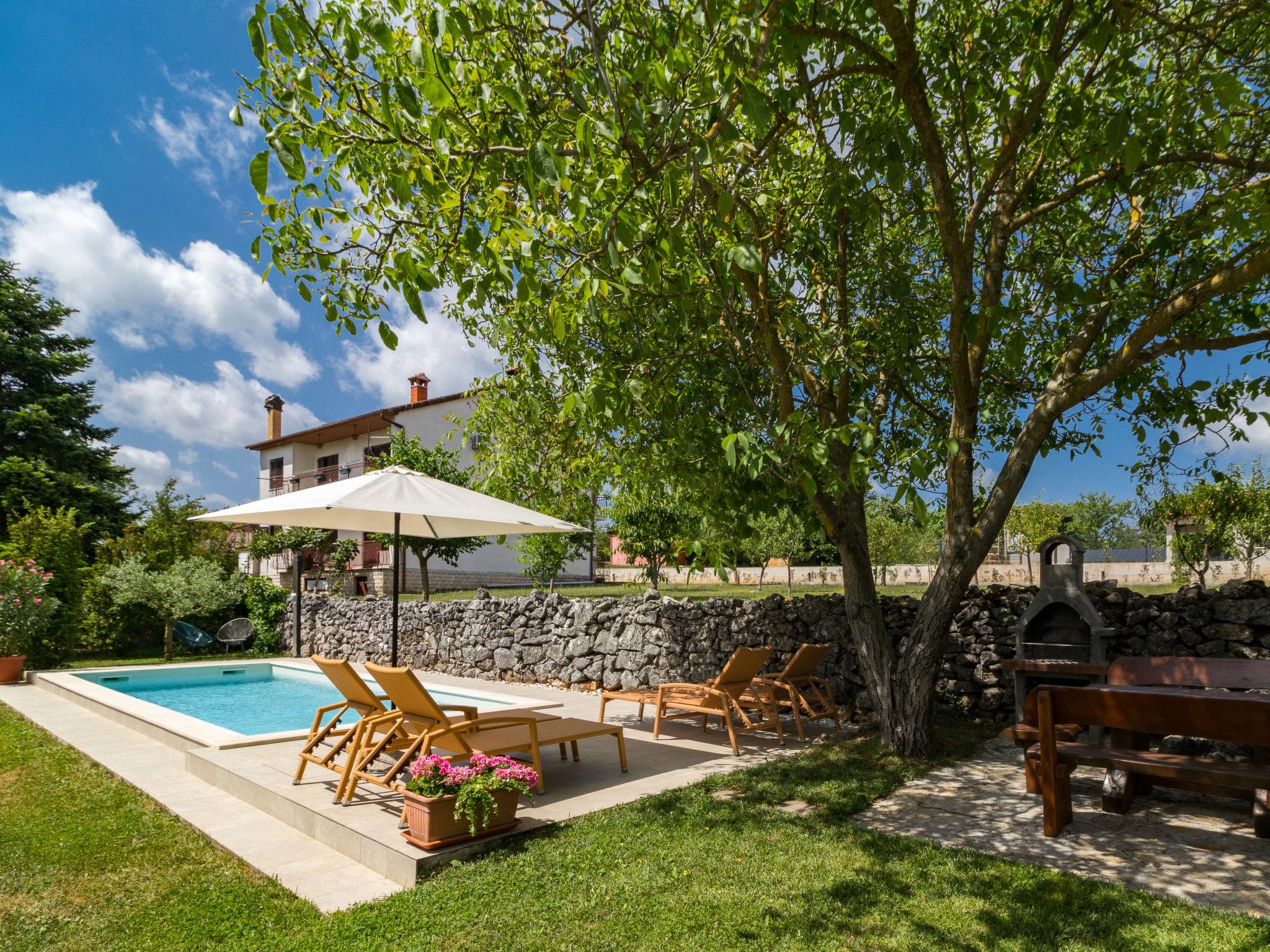 Single-family house "Tomazin". In the hamlet Vela Traba 7 km from the centre of Pazin, 25 km from the sea, in the countryside. Private: property 2'000 m2, trees, meadow, swimming pool angular (8 x 3 m, depth 135 cm, seasonal availability: 15.May. - 17.Sep.) with internal staircase. Outdoor shower, terrace, garden furniture, barbecue. In the house: internet access, washing machine. Motor access to the house (100 m via unmade road). Parking on the premises. Shop 3 km, bus stop 8 km, railway station 8 km, pebble beach 25 km.