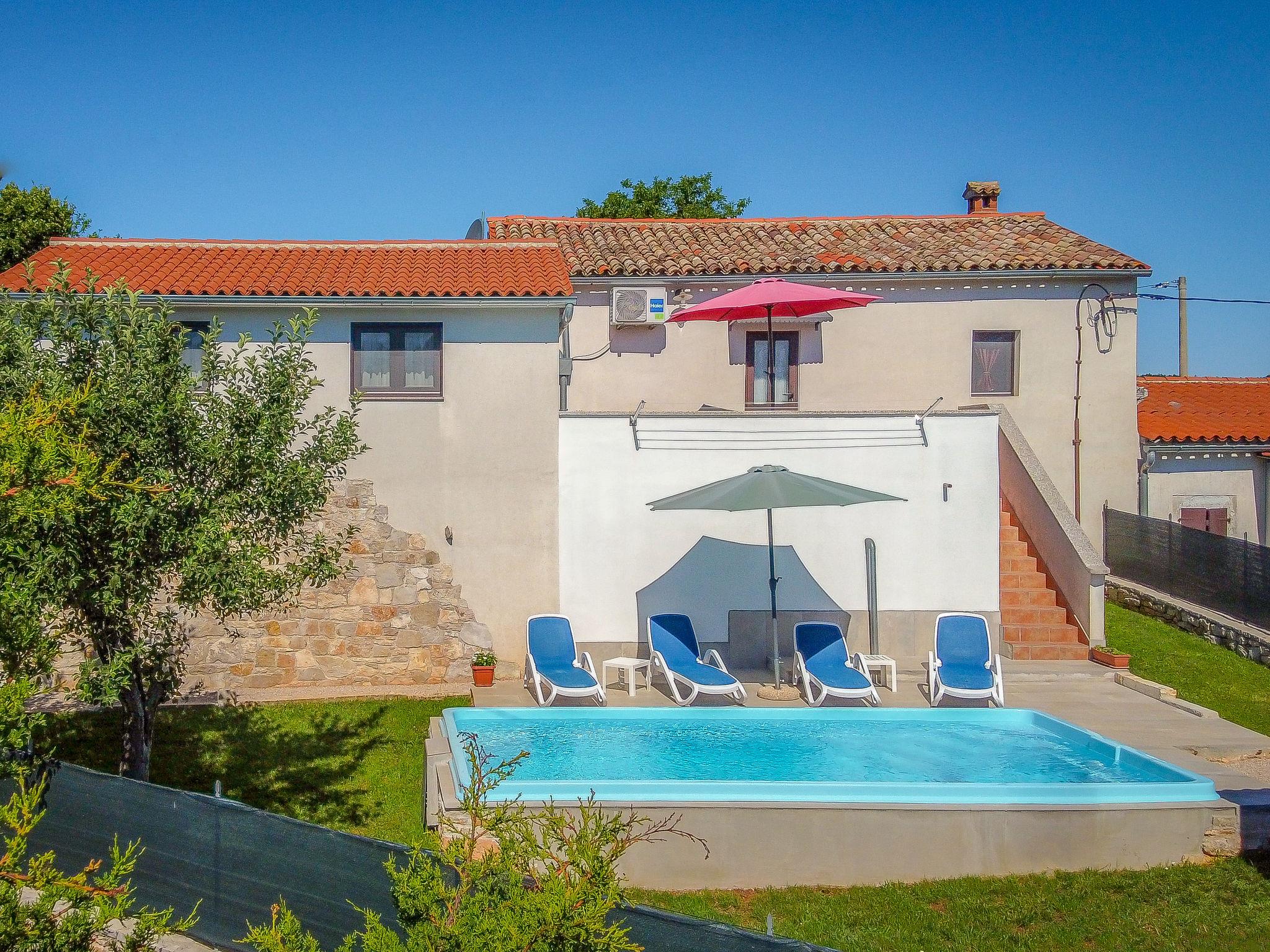 Single-family house "Danica", 2 storeys. 1 km from the centre of Jakacici, 10 km from the centre of Pazin, 35 km from the sea. Private: property 400 m2 (fenced) with lawn and trees, swimming pool angular (6 x 3 m, depth 150 cm, seasonal availability: 01.May. - 01.Oct.) with internal staircase. Outdoor shower, terrace, garden furniture, barbecue. In the house: internet access, washing machine. Parking (for 2 cars) at the house on the premises. Shop 1 km, supermarket 10 km, bus stop 10 km, rocky beach 35 km. Part of the house is closed and unoccupied.