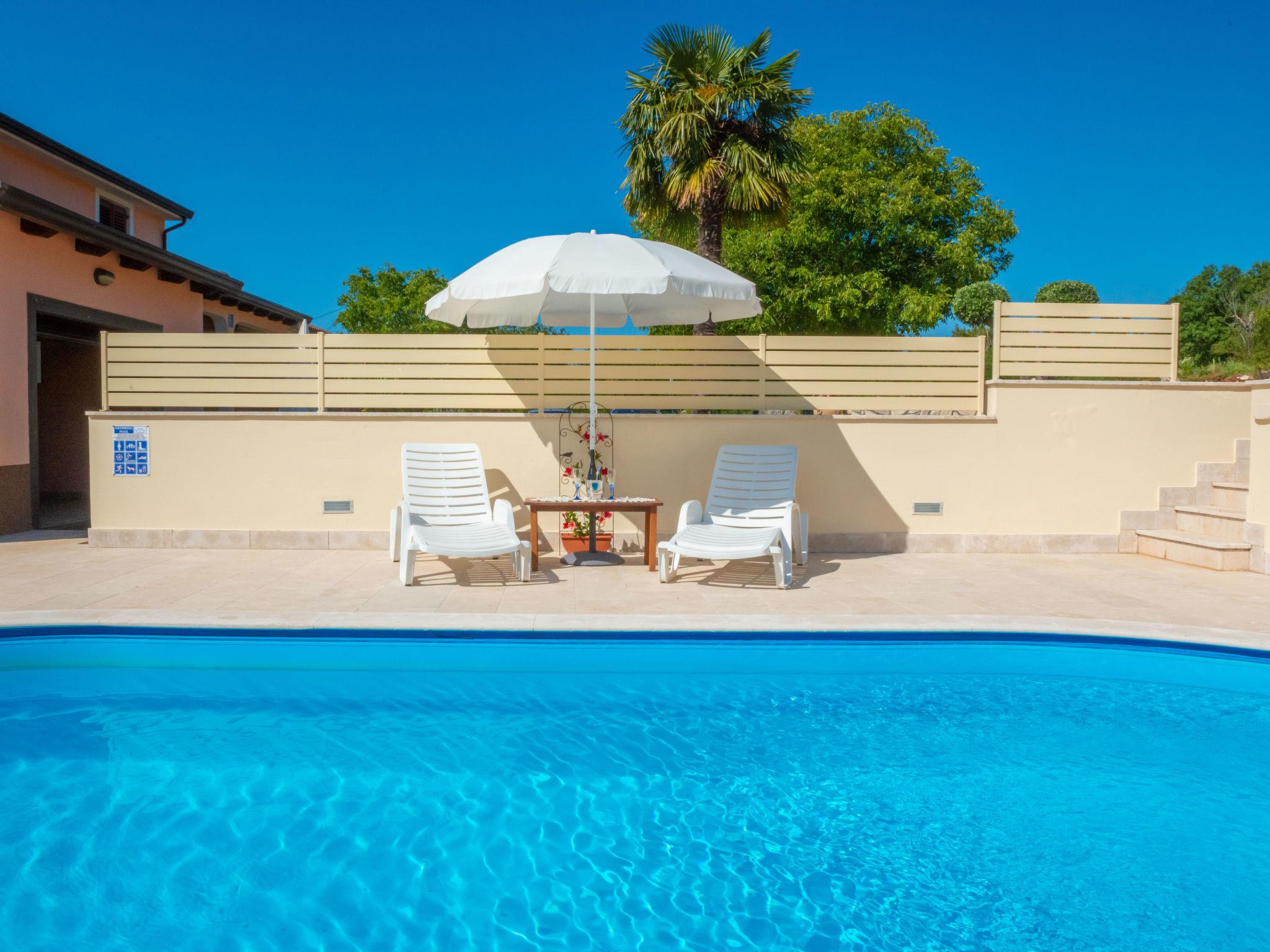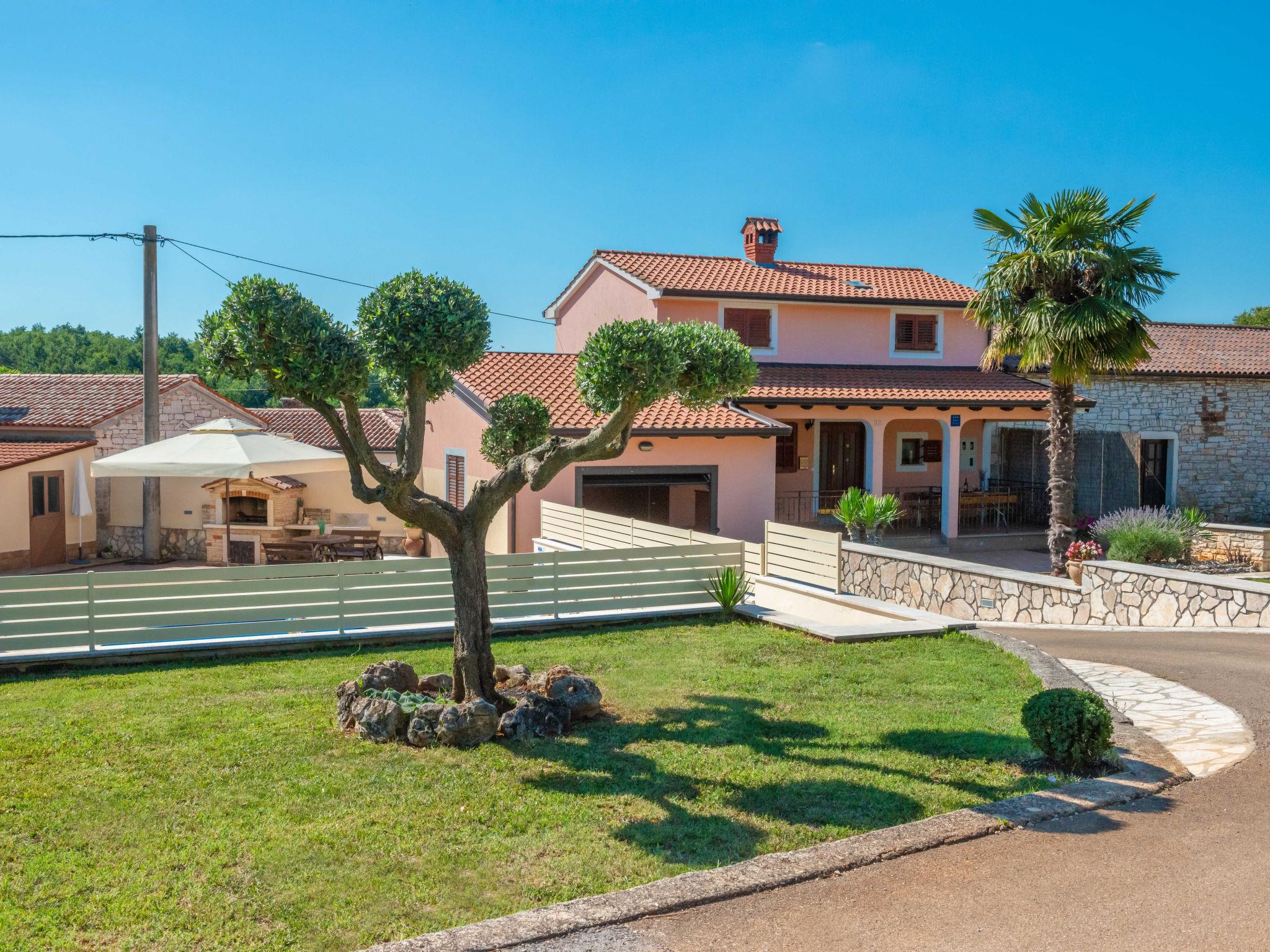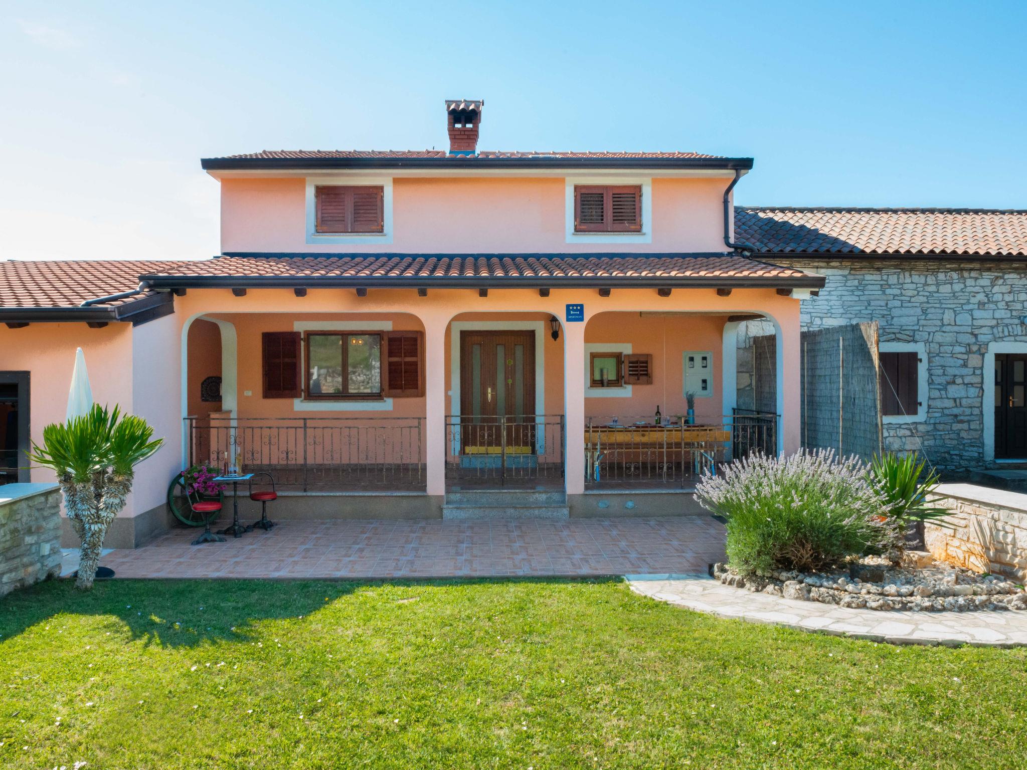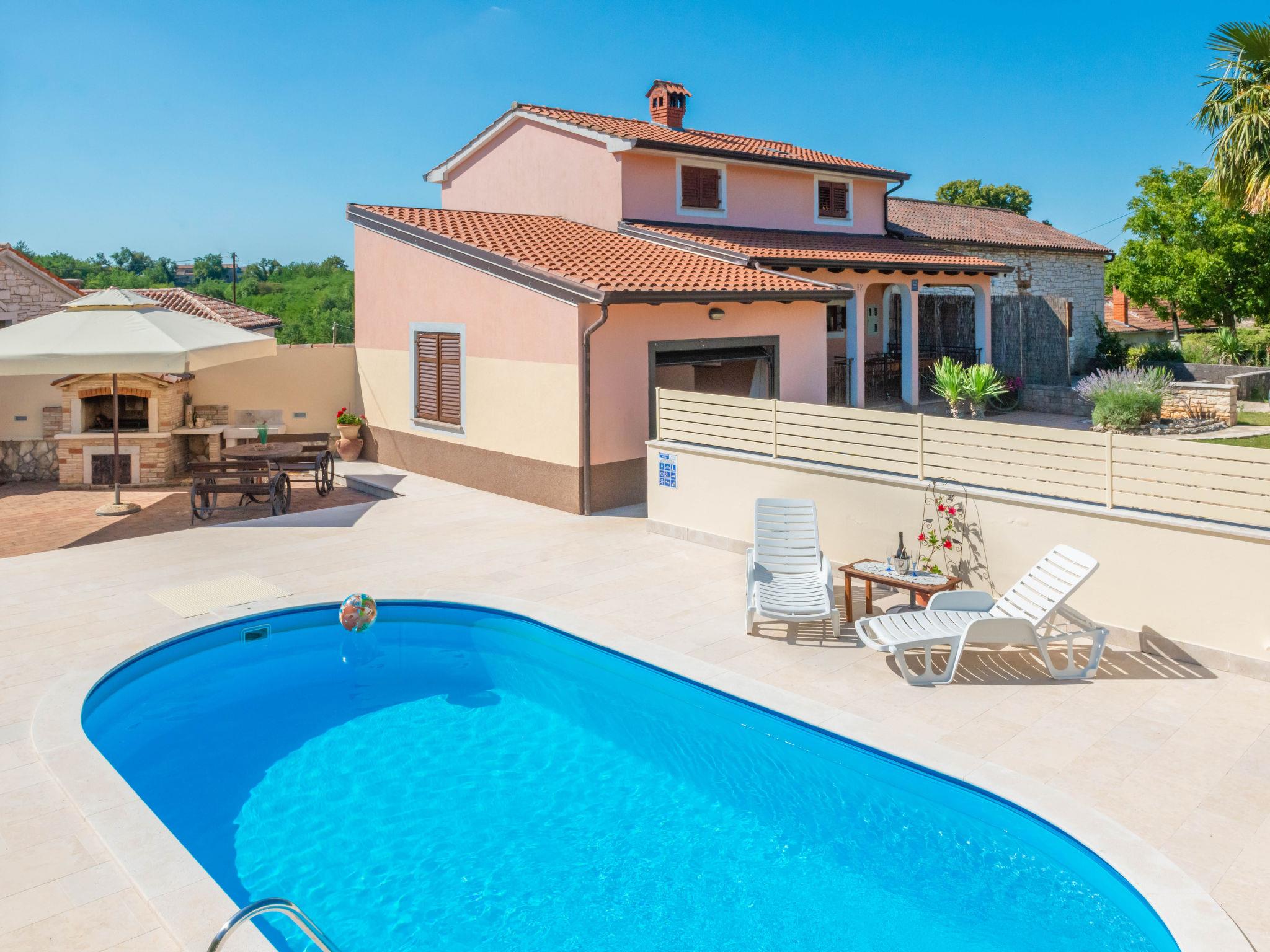 Semi-detached house "Medica", 2 storeys. In the hamlet Milotici 1 km from the centre of Tinjan, 12 km from the centre of Pazin, 20 km from the sea. Private: property 200 m2 with lawn and trees, swimming pool (24 m2, depth 135 cm, seasonal availability: 15.May. - 20.Sep.). Outdoor shower, table tennis, terrace, garden furniture, barbecue, pool maintenance by the owner/gardener. In the house: internet access. Parking on the premises, single garage. Shop 1 km, restaurant 1 km, bus stop 950 m, rocky beach 20 km.