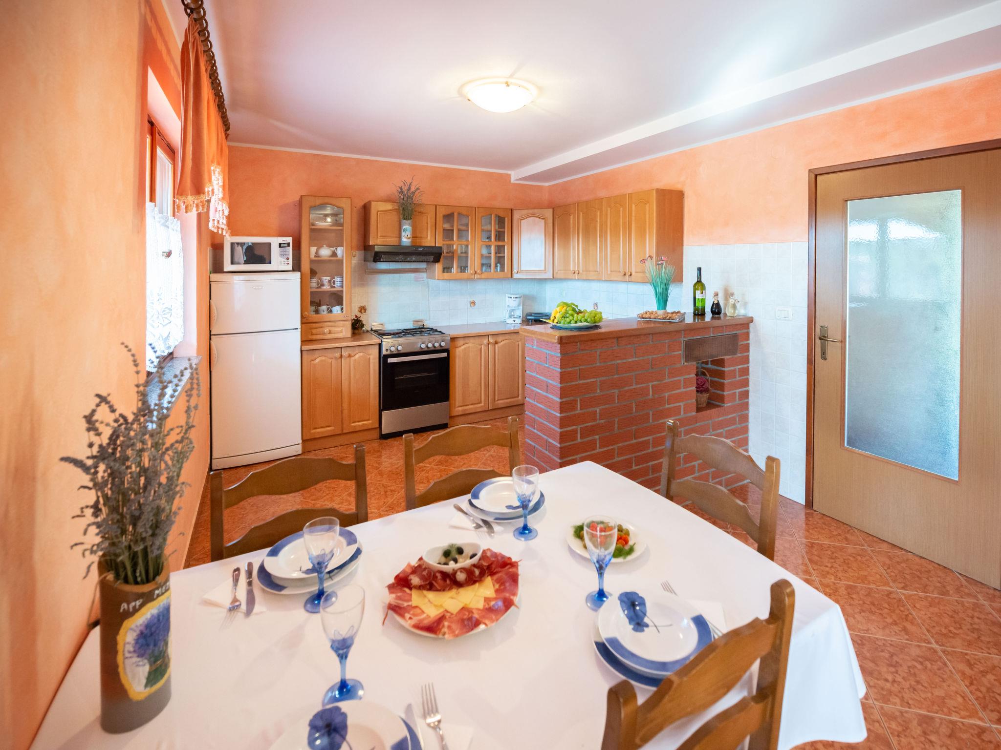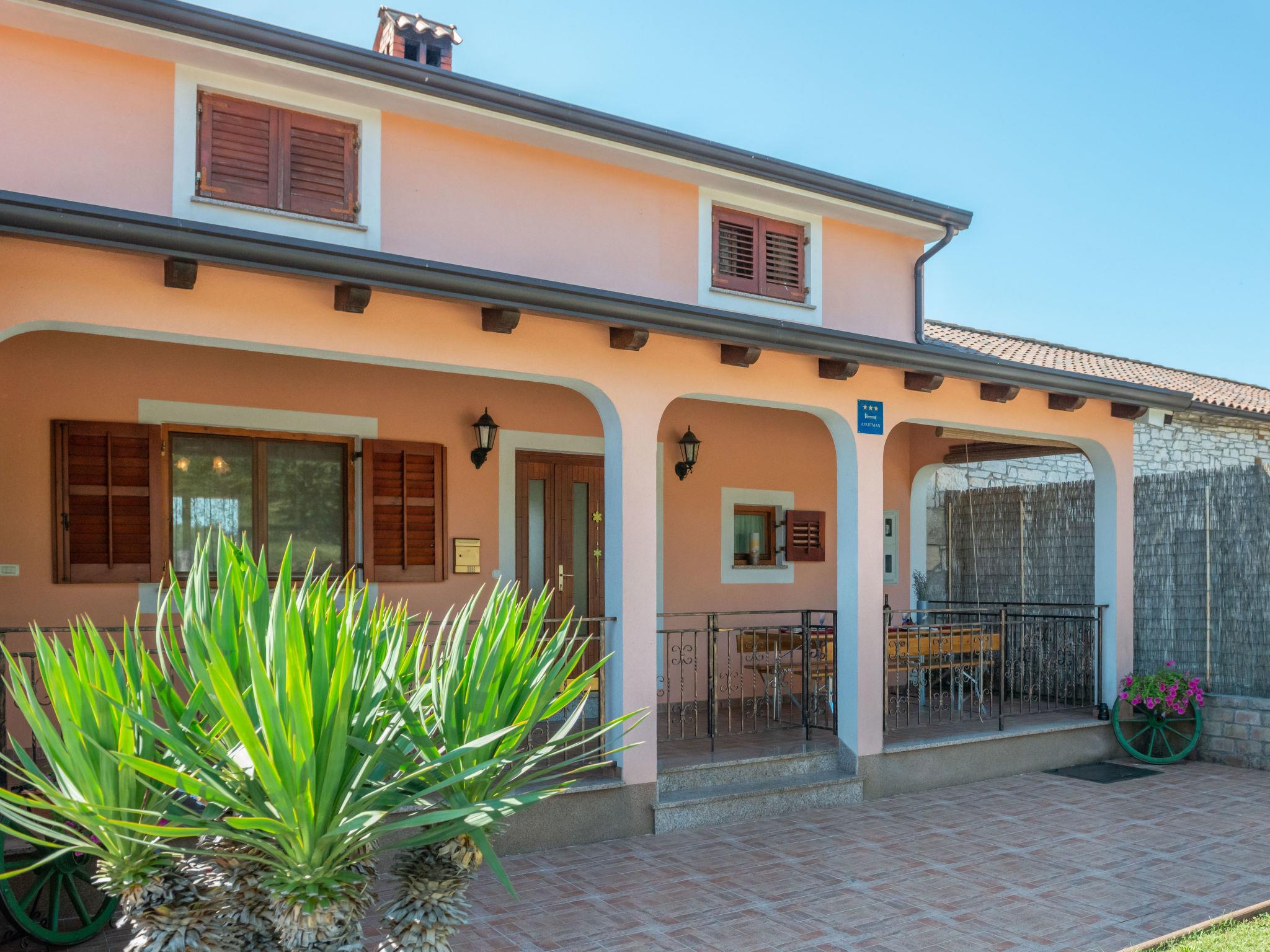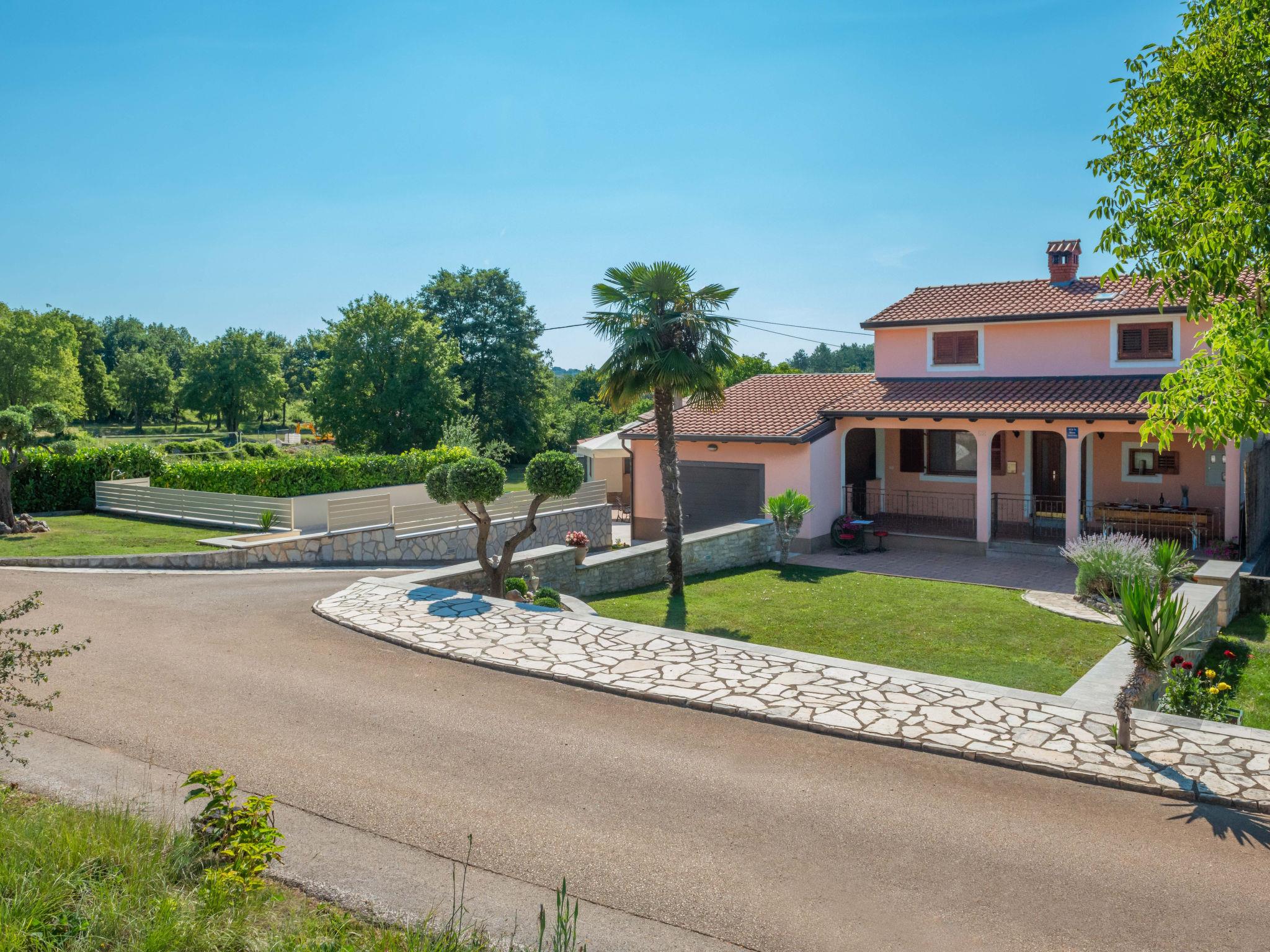 Semi-detached house "Medica", 2 storeys. In the hamlet Milotici 1 km from the centre of Tinjan, 12 km from the centre of Pazin, 20 km from the sea. Private: property 200 m2 with lawn and trees, swimming pool (24 m2, depth 135 cm, seasonal availability: 15.May. - 20.Sep.). Outdoor shower, table tennis, terrace, garden furniture, barbecue, pool maintenance by the owner/gardener. In the house: internet access. Parking on the premises, single garage. Shop 1 km, restaurant 1 km, bus stop 950 m, rocky beach 20 km.