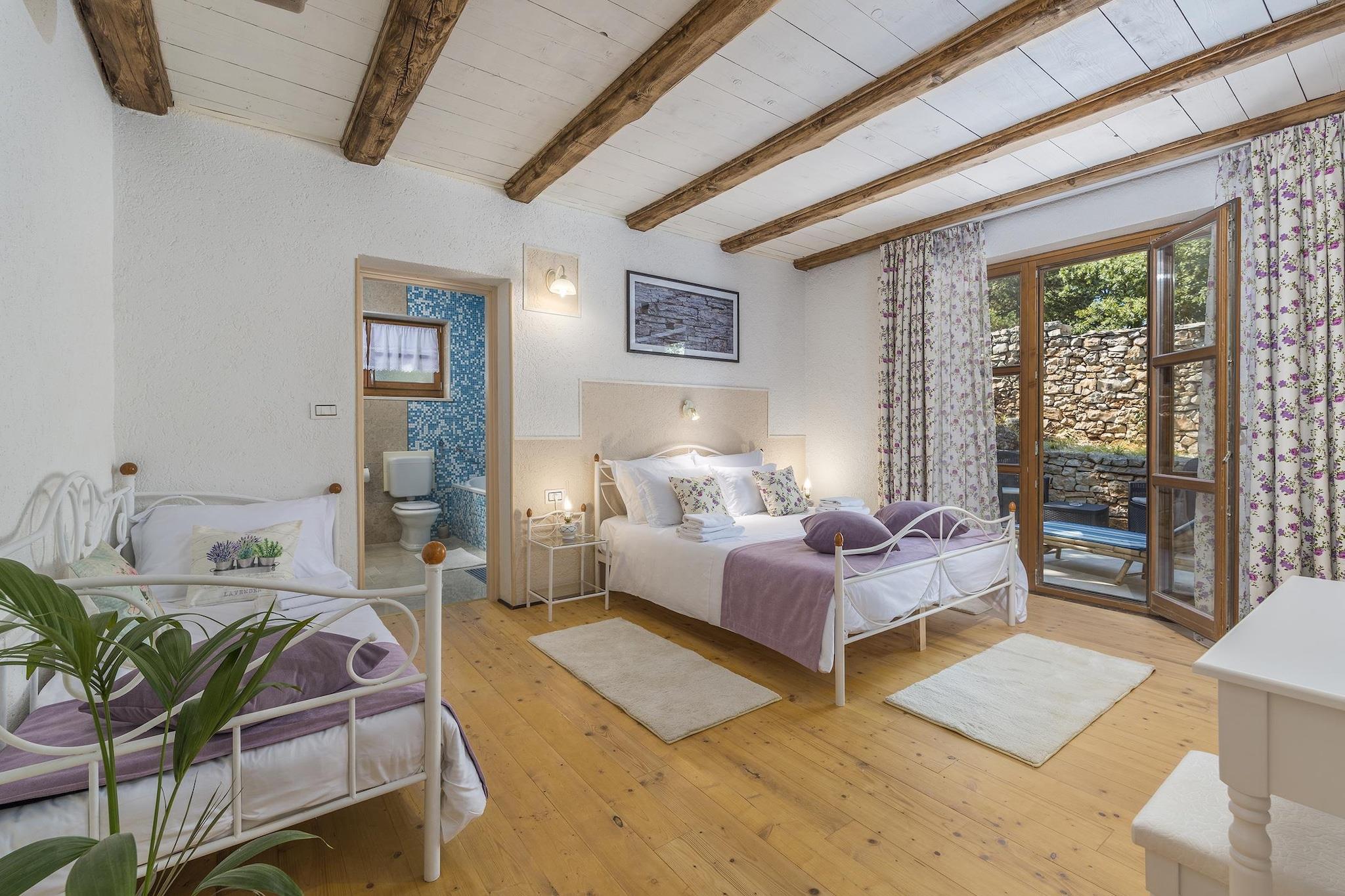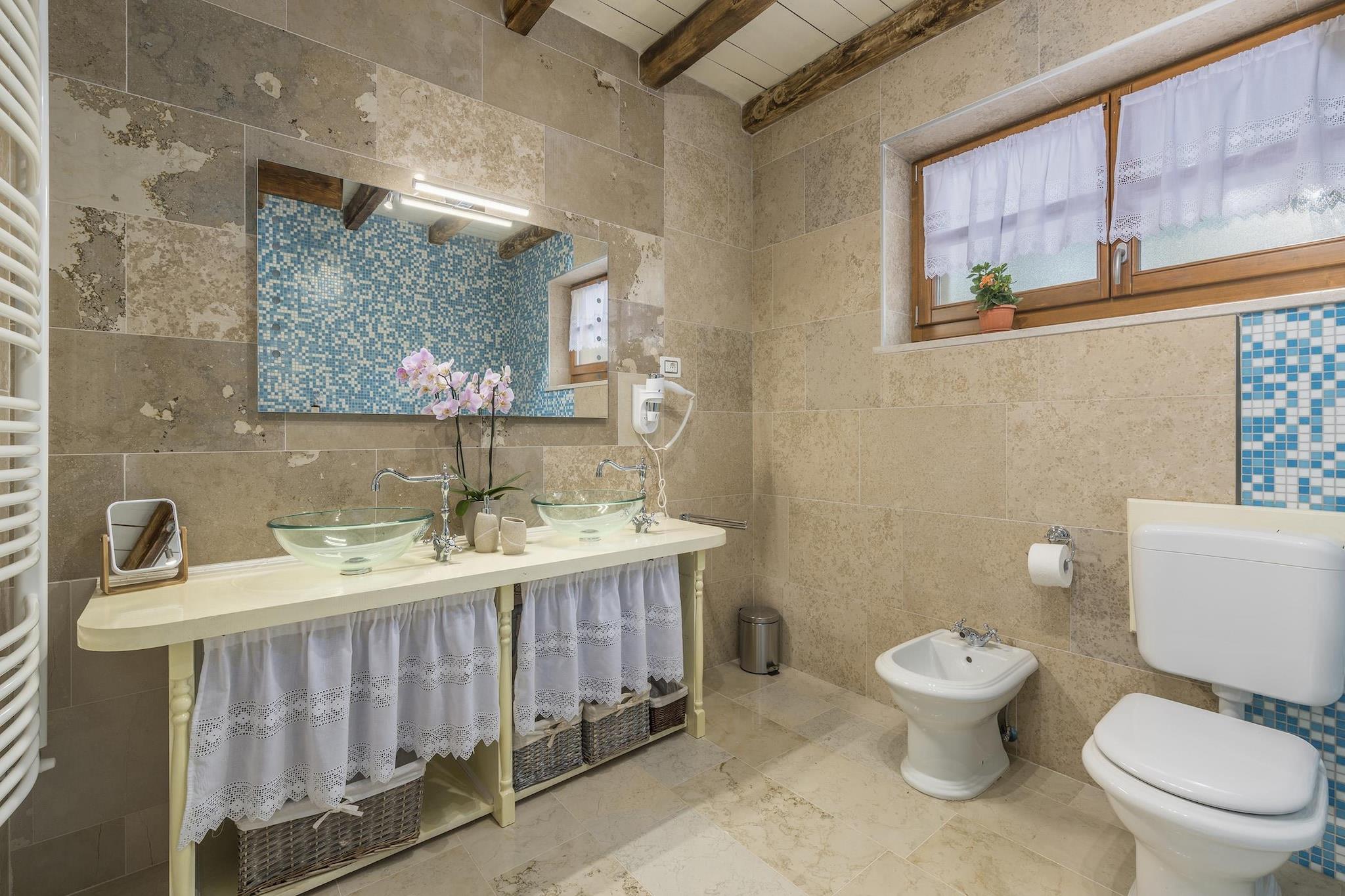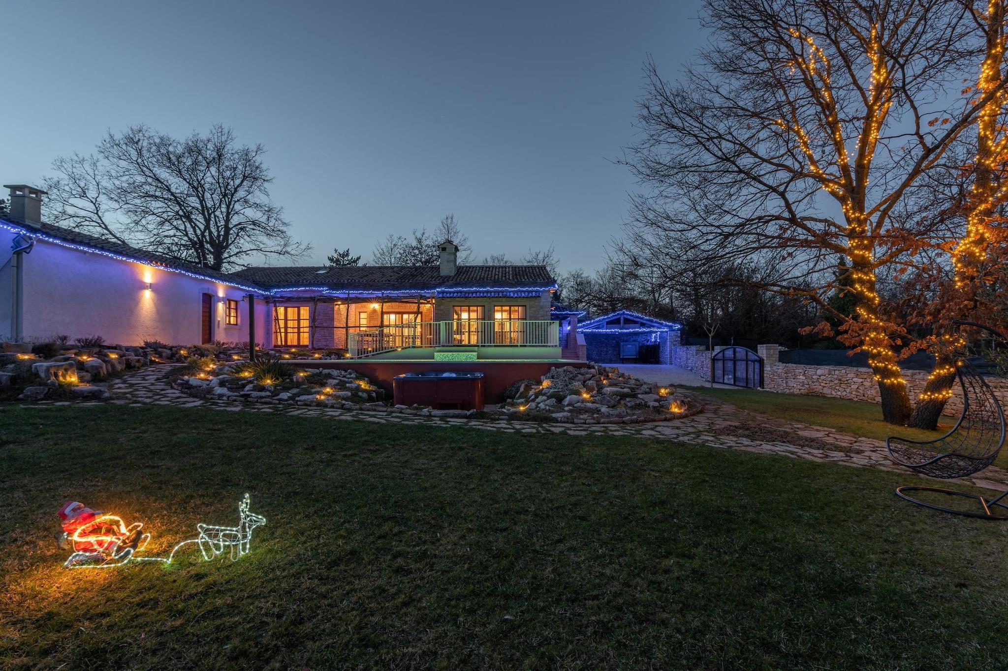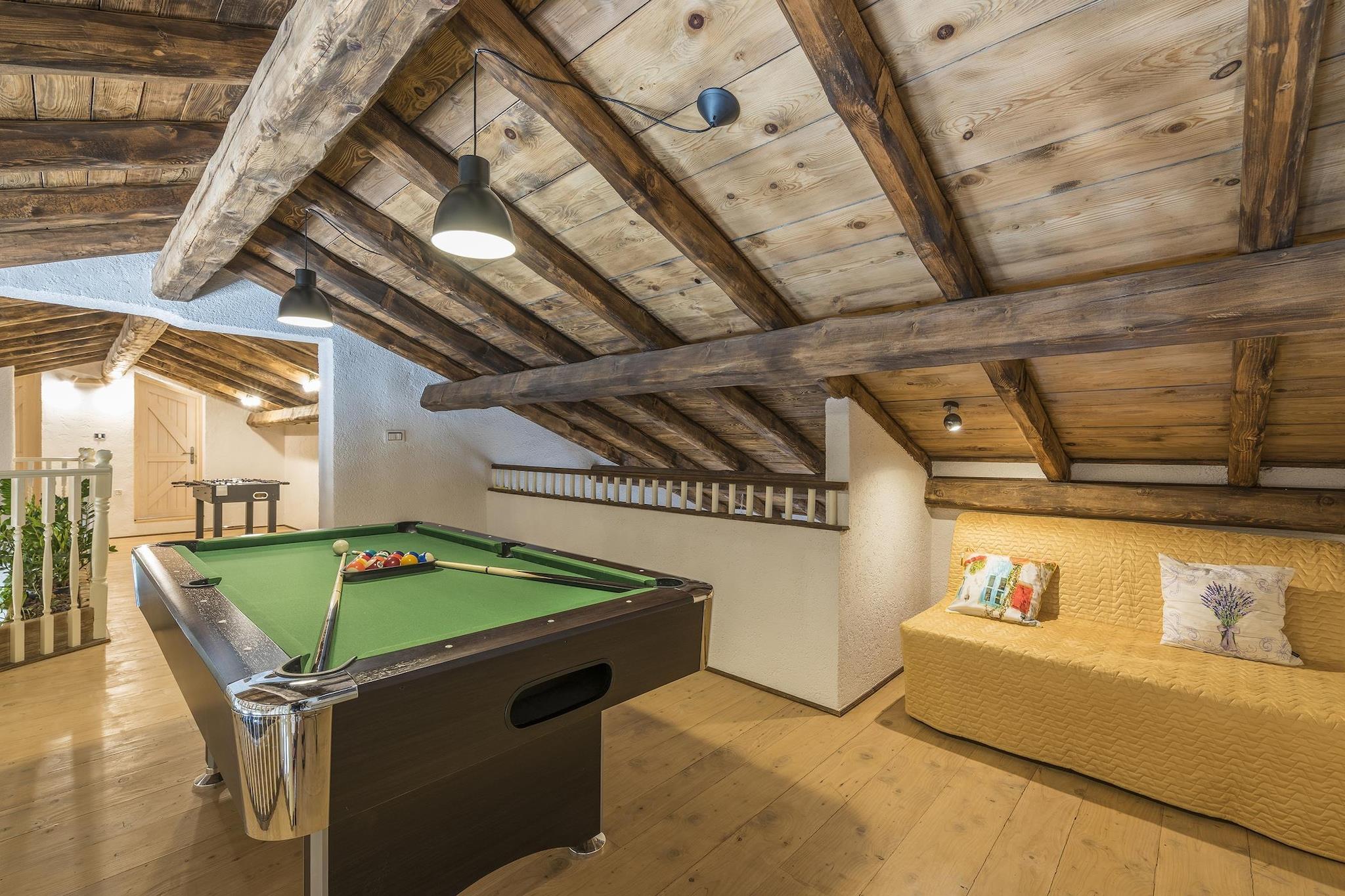 Beliggende i det grønne hjerte af det centrale Istrien tilbyder denne smukt restaurerede traditionelle villa et fredeligt landligt tilflugtssted designet til store familier og grupper, der søger privatliv, plads og fuldstændig afslapning. Ejendommen har plads til op til 14 gæster og kombinerer autentisk lokal arkitektur med moderne komfort, hvilket skaber en ideel base for at udforske middelalderbyer, vinmarker, cykelruter, vandrestier, eventyrparker og regionens rige kulinariske scene. Hovedvillaen er fordelt på flere etager og omhyggeligt indrettet til gruppeliv. I stueetagen kan gæsterne nyde en rummelig rustik stue, et fuldt udstyret køkken og en fleksibel spiseplads. Denne etage har også tre soveværelser, hver med eget badeværelse: et soveværelse med en dobbeltseng, et med en dobbeltseng og en enkeltseng og et med to enkeltsenge, der kan laves om til en dobbeltseng. Loftet indeholder to soveværelser møbleret med tre enkeltsenge plus et spilleområde med billard, bordfodbold, skak og børnespil; de deler et badeværelse og separat toilet. Kælderen er dedikeret til fritid og wellness med pejs, fitnesscenter, sauna, massagebord og et komplet vaskerum med vaskemaskine og tørretumbler. Separat fra hovedhuset er der en selvstændig lejlighed med to enkeltsenge, en lille opholdsstue med to ekstra senge, spiseplads, køkken og privat badeværelse. Udendørs byder middelhavshaven på en stor privat swimmingpool, en udendørs jacuzzi til seks personer, liggestole, bordtennis og et grillområde, hvilket skaber en komplet privat resortoplevelse for uforglemmelige ophold i Istrien.