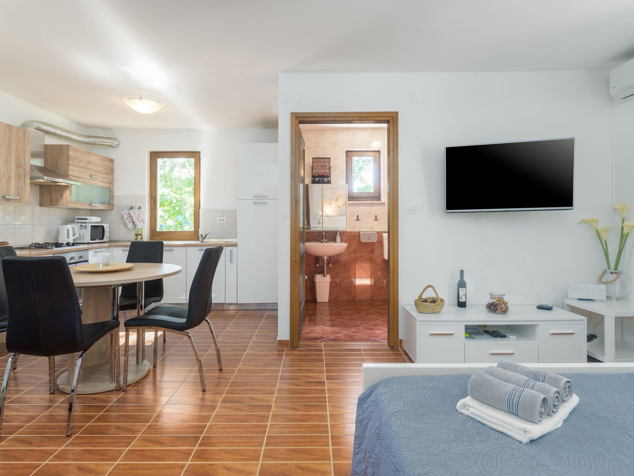 Haus bietet Platz für 4 Gäste. Die Betten sind in Schlafzimmern, die es 1 gibt, und in Wohnzimmer, innerhalb einer Gesamtfläche von 34m2, angeordnet. Die Gäste haben eine eigene Terrasse zur Verfügung, auf der sie in warmen Sommernächten genießen können. Für vollen Genuss und Entspannung gibt es einen privaten Grill für Gäste dieser Unterkunft. Während ihres Aufenthalts können sich Gäste im privaten Schwimmbad entspannen. In der Unterkunftseinheit besteht die Möglichkeit des Mitbringens von Haustieren gegen Aufpreis. IM PREIS INBEGRIFFEN: Kurtaxe, Endreinigung, Klimatisierung, Pool, Parkplatz, Internet, Bügeleisen, Bügelbrett, Föhn. UNVERBINDLICHE ZUSÄTZLICHE KOSTEN: Haustiere (20,00 € pro Nacht). Die Verfügbarkeit zusätzlicher Dienstleistungen in Ihrem reservierten Termin und die Preise derselben (falls nicht aufgeführt) müssen im Voraus überprüft werden. Zusätzliche Dienstleistungen die in der Zahlungsaufforderung nicht aufgeführt sind werden direkt beim Vermieter bezahlt, angenommen der Gast nutzt auch diese. Ermäßigung auf den Grundpreis: Gratistag 14=13 (bei einem Aufenthalt von 14 Tagen oder mehr erhalten Sie einen Gratistag für den Aufenthalt bis 31.12.26).