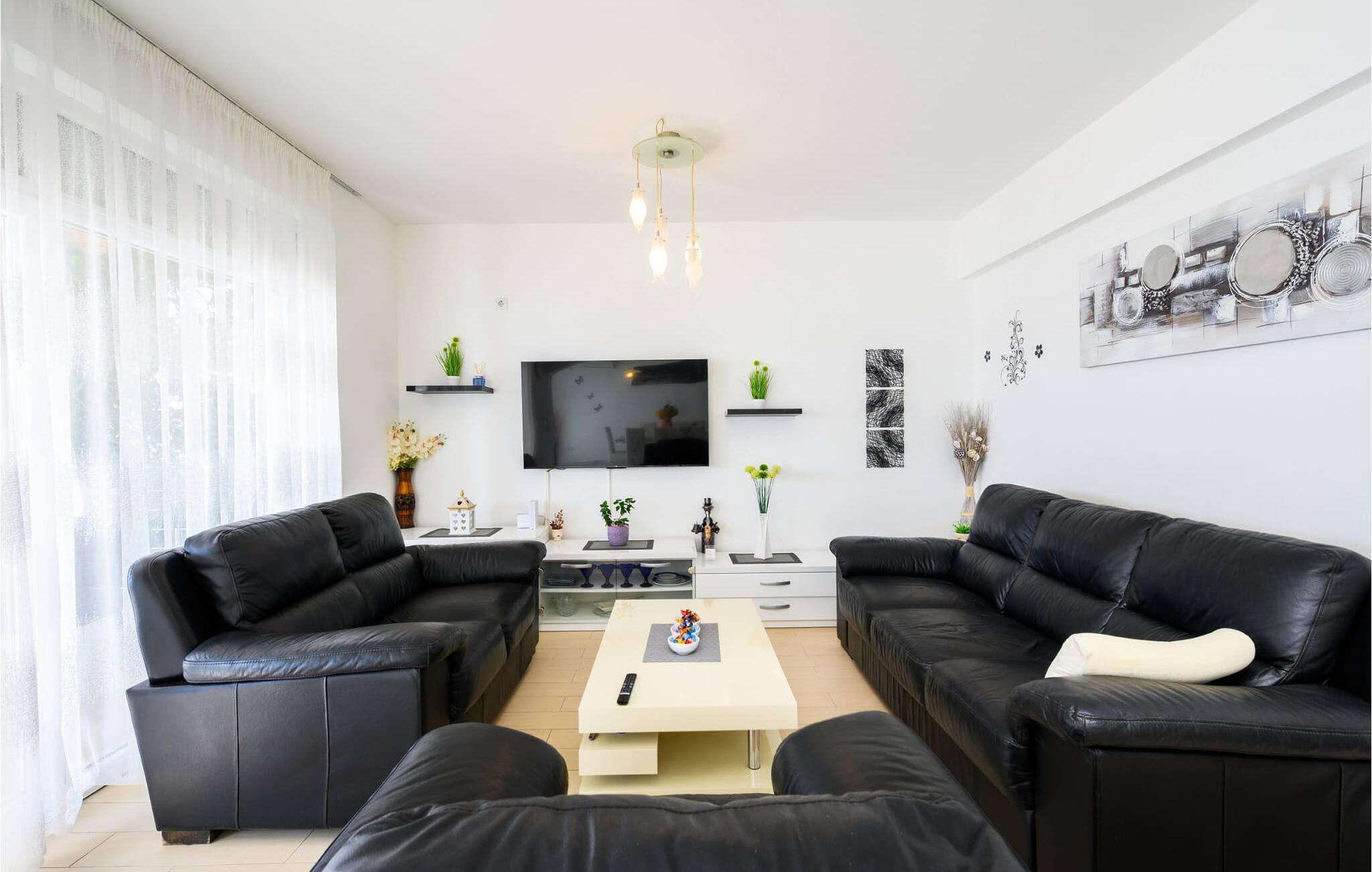 Lejligheden byder jer velkommen med en lys, moderne og elegant atmosfære, hvor komfort og stil smelter harmonisk sammen. I den rummelige opholds- og spisestue kan I lave mad og spise sammen eller blot slappe af i sofaen og nyde havudsigten. Takket være de store vinduer vil I opleve ren middelhavsliv – ideelt til at slappe af og nyde jeres ferie fuldt ud.