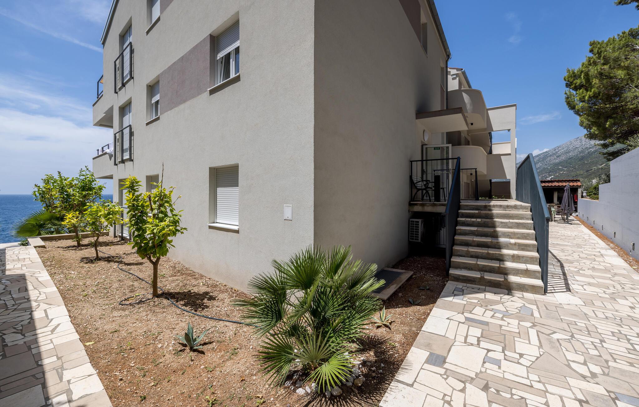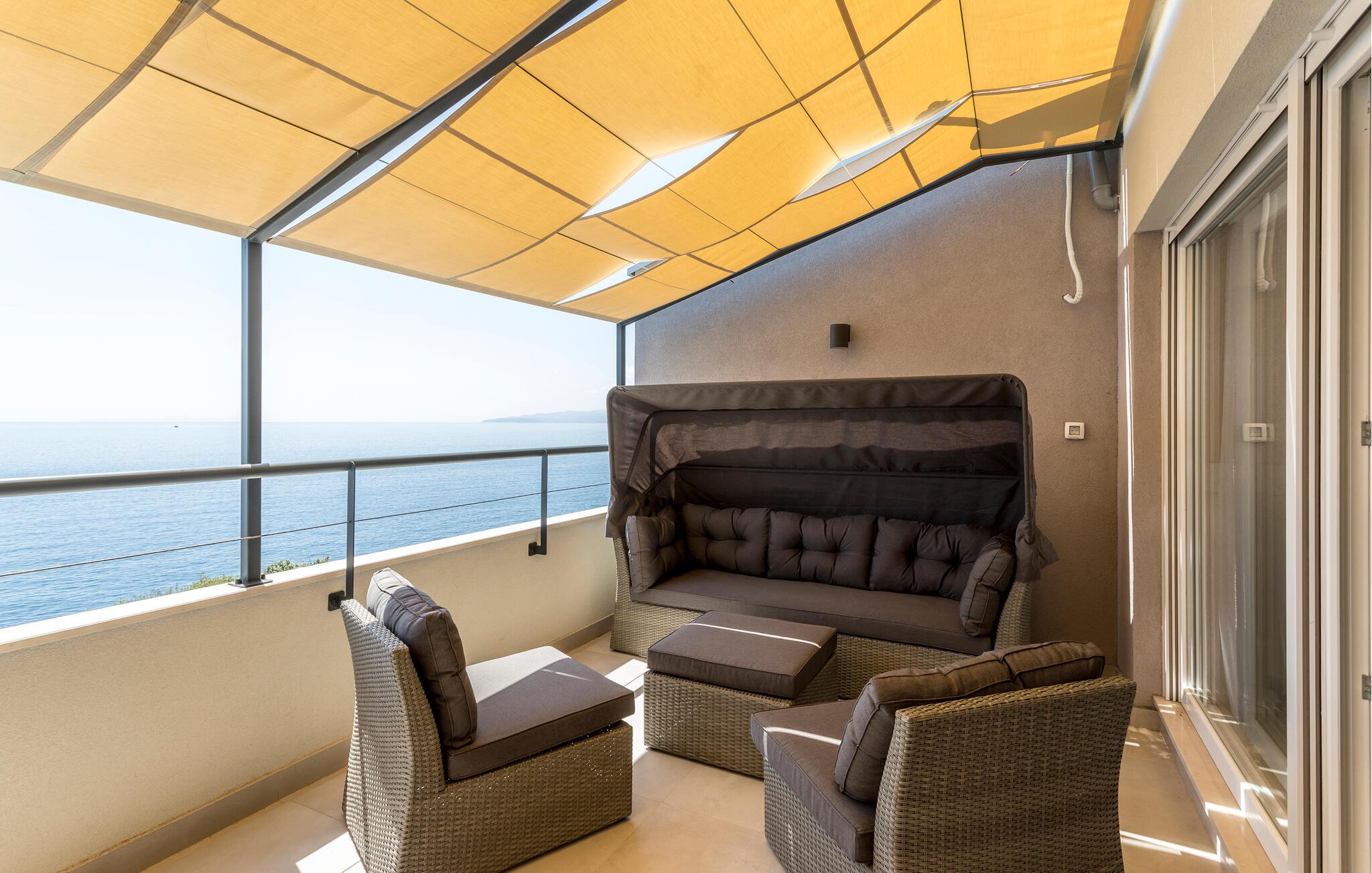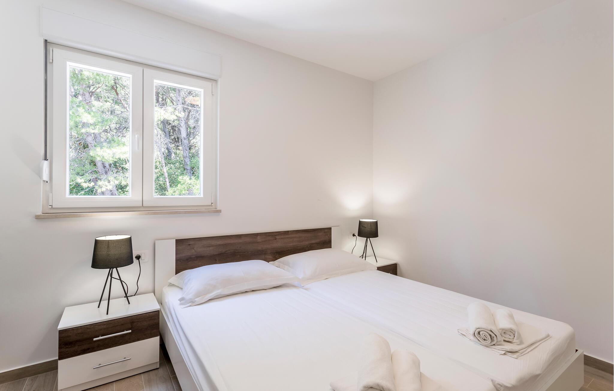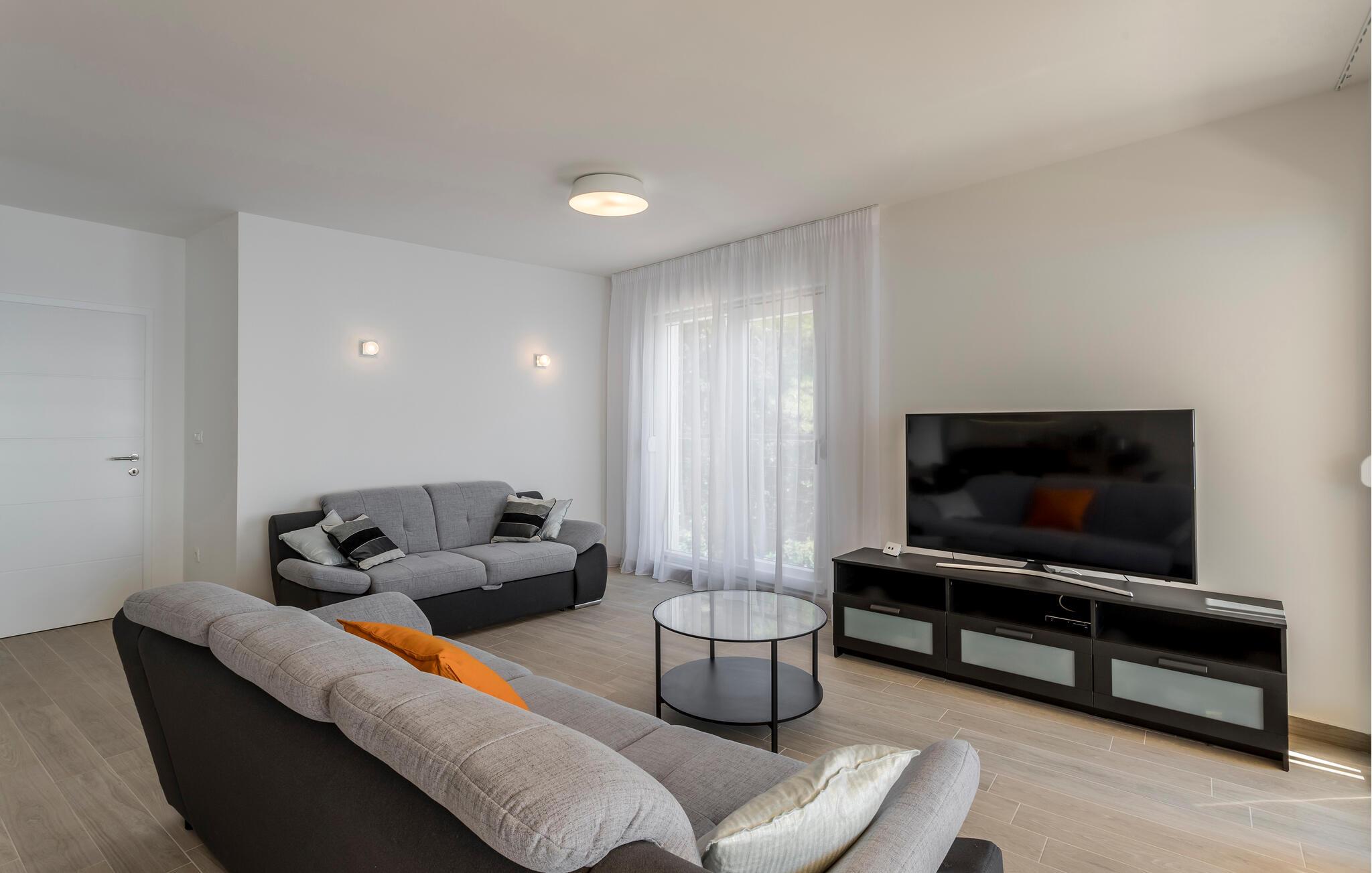 Beliggende i hjertet af idylliske vinmarker og lige ved havet, tilbyder denne lyse og komfortable lejlighed den perfekte base for at kombinere afslapning med en aktiv ferie og opleve Pelješac fuldt ud. Gulv-til-loft-vinduer giver en betagende havudsigt, så I kan nyde afslappede måltider i den åbne opholdsstue. Efter en lang dag kan I slappe af på sofaen, streame en film eller være vært for en spilleaften.