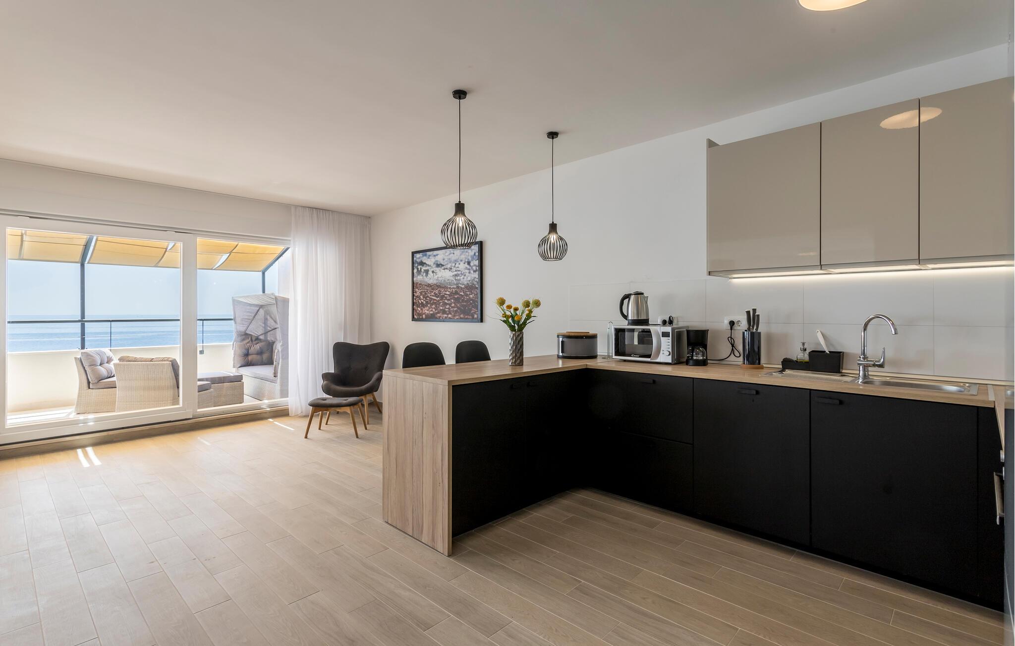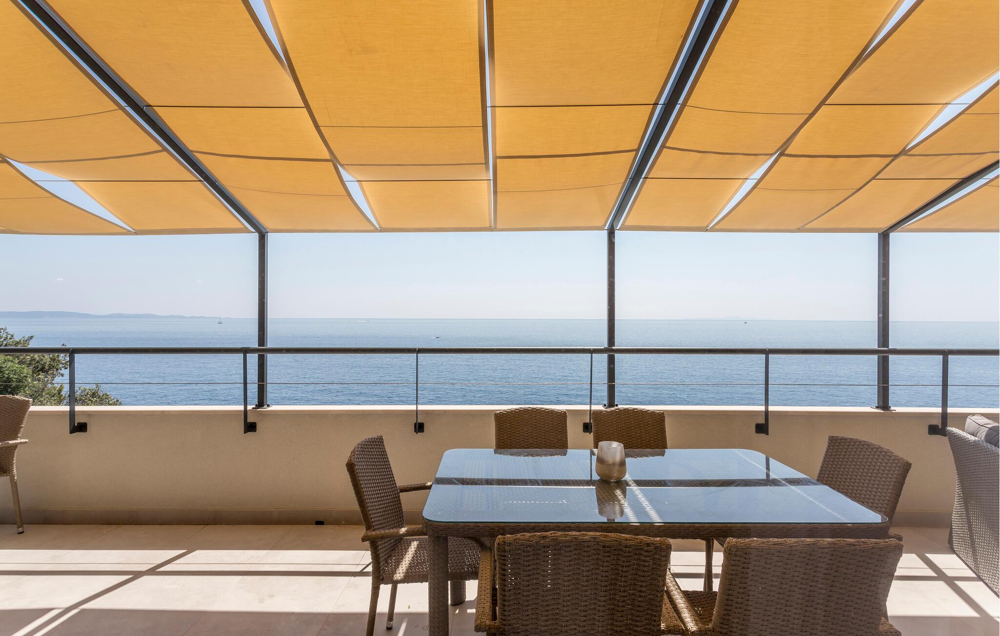 På jeres store, indbydende terrasse kan I kigge ud over det azurblå hav, mens I nyder morgenmad eller et glas vin om eftermiddagen. Snup en frisk dukkert i den fælles pool og hyg jer med grillen.