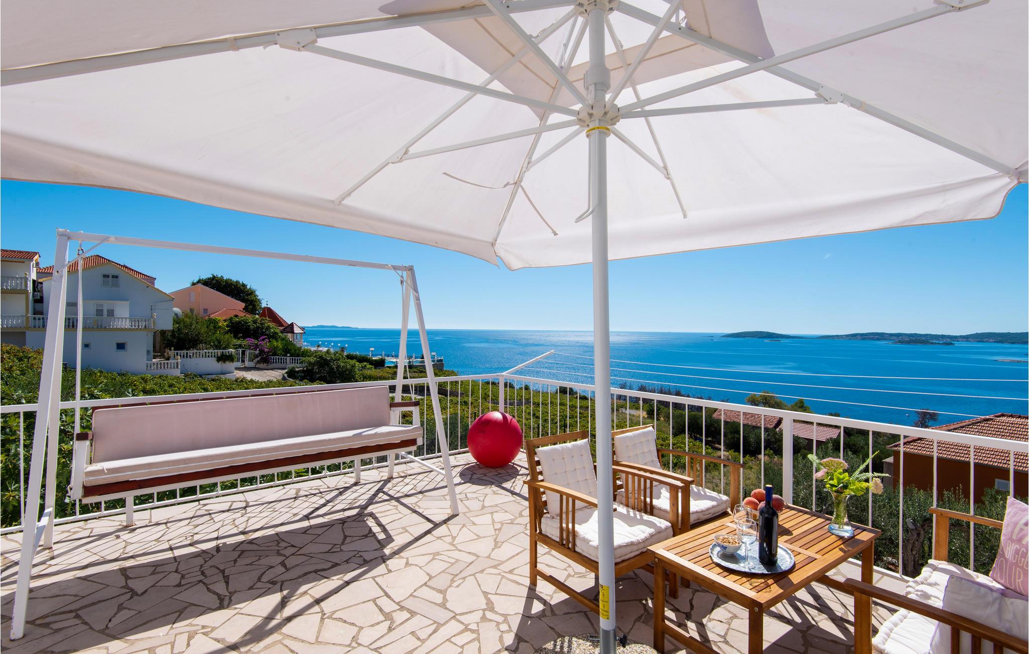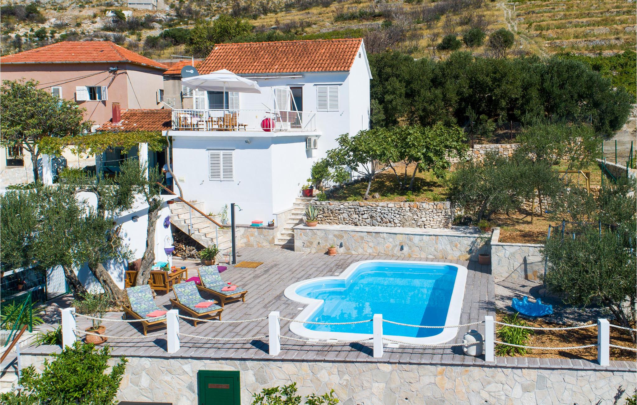 Dette enkle feriehus i to etager ligger på en lille høj. I stueetagen ligger køkkenet med en lille stue, badeværelse og soveværelse. På første sal er der et større og et mindre soveværelse. Fra gangen i overetagen kommer I til en dejlig terrasse med overvældende udsigt. Slap også af i haven med masser af grønt og skyggefulde steder, som I kan nyde jeres kaffe på. Der venter timevis af badesjov i den opvarmede pool. Eller tag en tur til Mokalo, en af de dejligste badestrande i Peljesac, lige i nærheden. Tilbered dejlige retter på grillen og nyd skønne lokale Peljesacvin.