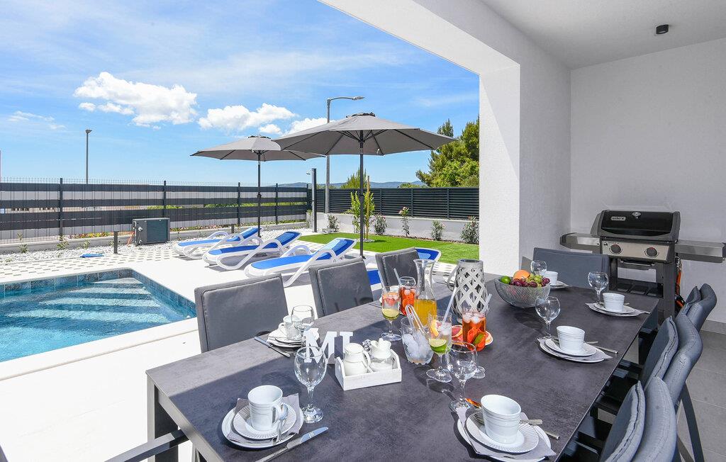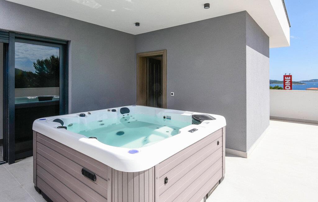 Begynd dagene veludhvilet og lad jer inspirere af den moderne indretning i det veludstyrede køkken for at tilberede en solid morgenmad til hele familien. Om I nyder det indenfor ved det elegante spisebord eller udenfor på den overdækkede terrasse med grill er op til jer. Om eftermiddagen inviterer liggestolene jer til at nyde en frisk drink. Eller sidde på balkonen og nyde den betagende udsigt over det dybe blå hav i det fjerne. Her finder I også et beroligende spabad. Den private pool byder på forfriskning, hvor I kan bade til jeres hjertes lyst. Fitnessrummet sørger for, at I holder jer i form selv på ferien, og I kan slappe helt af i hotellets sauna.