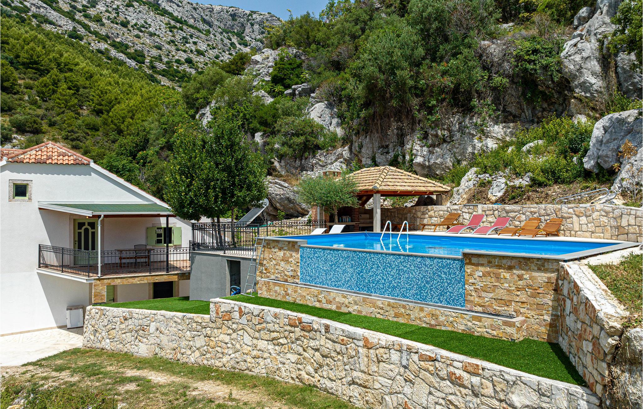 Ankom med familien i dette traditionelle feriehus og tilbring en dejlig ferie i dette hyggeligt indrettede hus. Her finder I alt, hvad I skal bruge til at have det godt og slappe af. Nyd stemningen skabt af synlige bjælker, en åben pejs og pudsede stenvægge. Men I kan også nyde udendørsområdet. En stor overdækket terrasse er til rådighed til aften og hyggelige grillaftener. I kan også nyde panoramaet over havet og det omkringliggende landskab i den smukke pool.