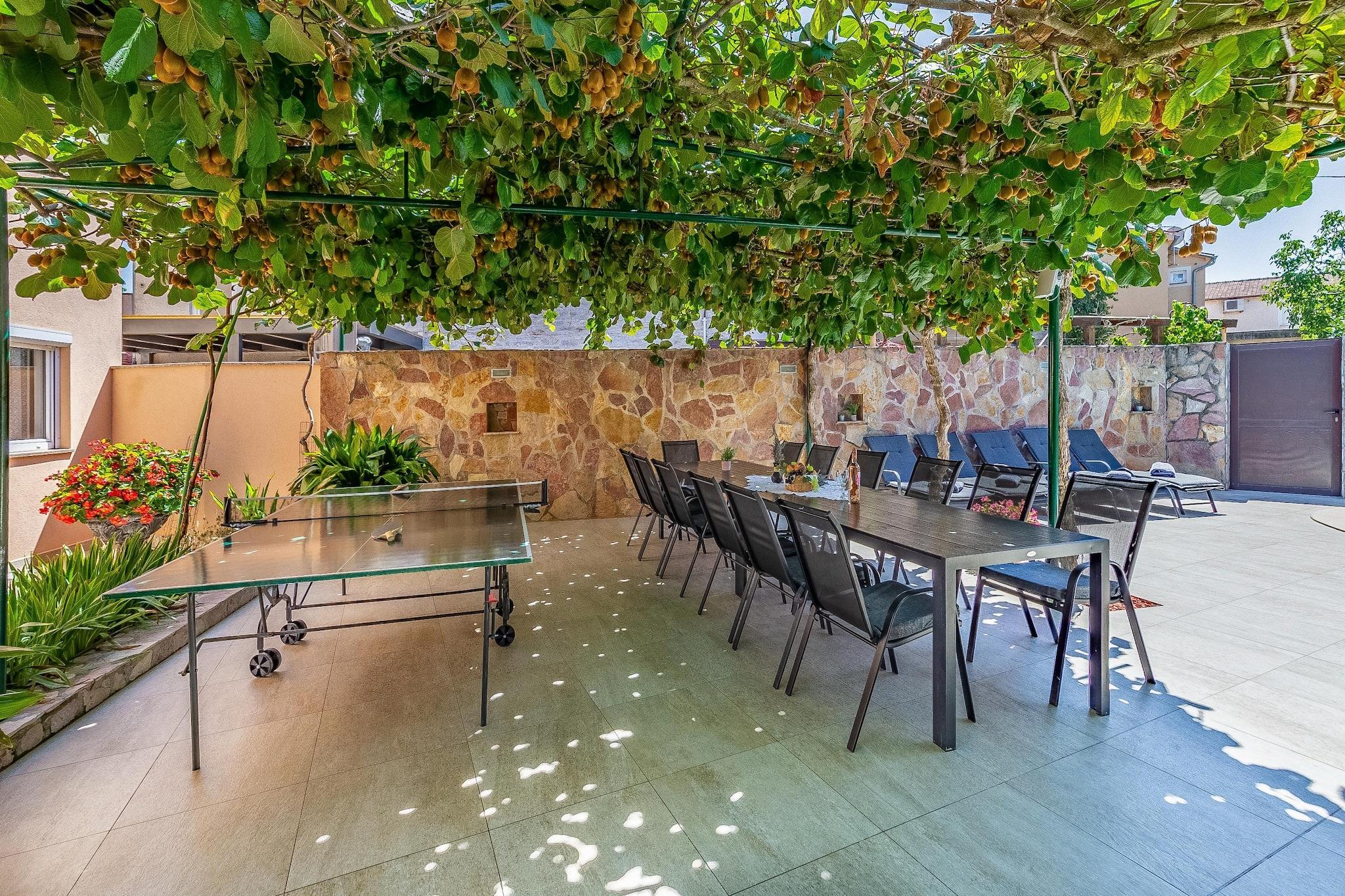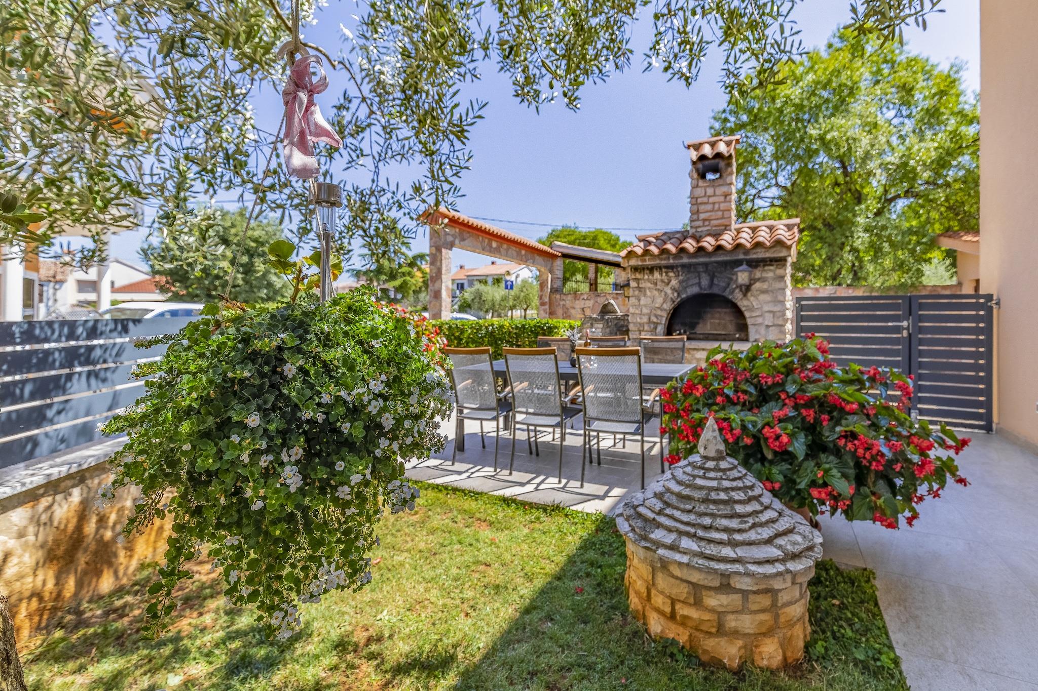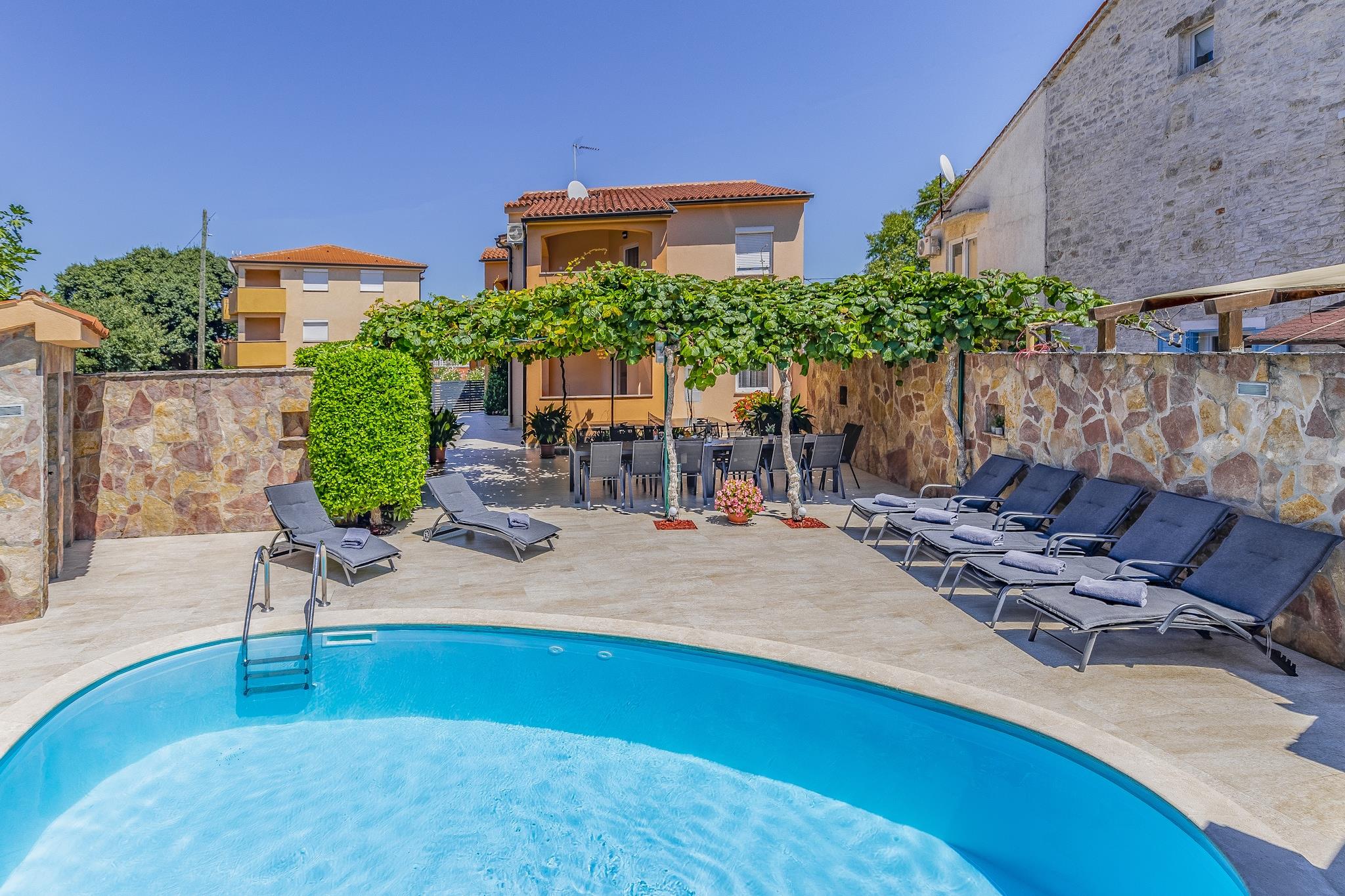 Dette feriehus til 13 gæster tilbyder et komfortabelt og kæledyrsvenligt tilflugtssted i Peroj, kun 800 meter fra stranden og 100 meter fra lokale restauranter og butikker. Denne villa er designet til store grupper og familier og tilbyder gratis WiFi, en privat indhegnet swimmingpool og flere terrasser til afslapning. Uanset om du nyder solen, spiser udendørs eller udforsker nærliggende attraktioner, garanterer dette hjem et mindeværdigt ophold. Indenfor finder du i stueetagen to fuldt udstyrede køkkener med ovn, mikrobølgeovn og opvaskemaskine, to stuer/spisestuer og to soveværelser med dobbeltsenge samt to badeværelser med brusere og toiletter. Første sal byder på to ekstra køkkener, to stuer/spisestuer, tre soveværelser, herunder et med køjeseng, og to badeværelser. Loftet indeholder yderligere to soveværelser med to enkeltsenge og et ekstra badeværelse, hvilket gør denne villa ideel til store forsamlinger. Gæsterne kan også nyde aircondition, grillplads, bordtennisbord og parkering på stedet. I nærheden finder du Augustus-templet med en fantastisk romersk arkitektur, mens Brijuni-øerne byder på betagende natur og historiske steder. Udforsk Sergii-buen, en velbevaret romersk triumfbue. Til spisning serverer Ristorante Da Nonna udsøgt italiensk køkken. Uanset om du vil udforske historie eller nyde lokale smagsoplevelser, er dette feriehus det perfekte tilflugtssted.