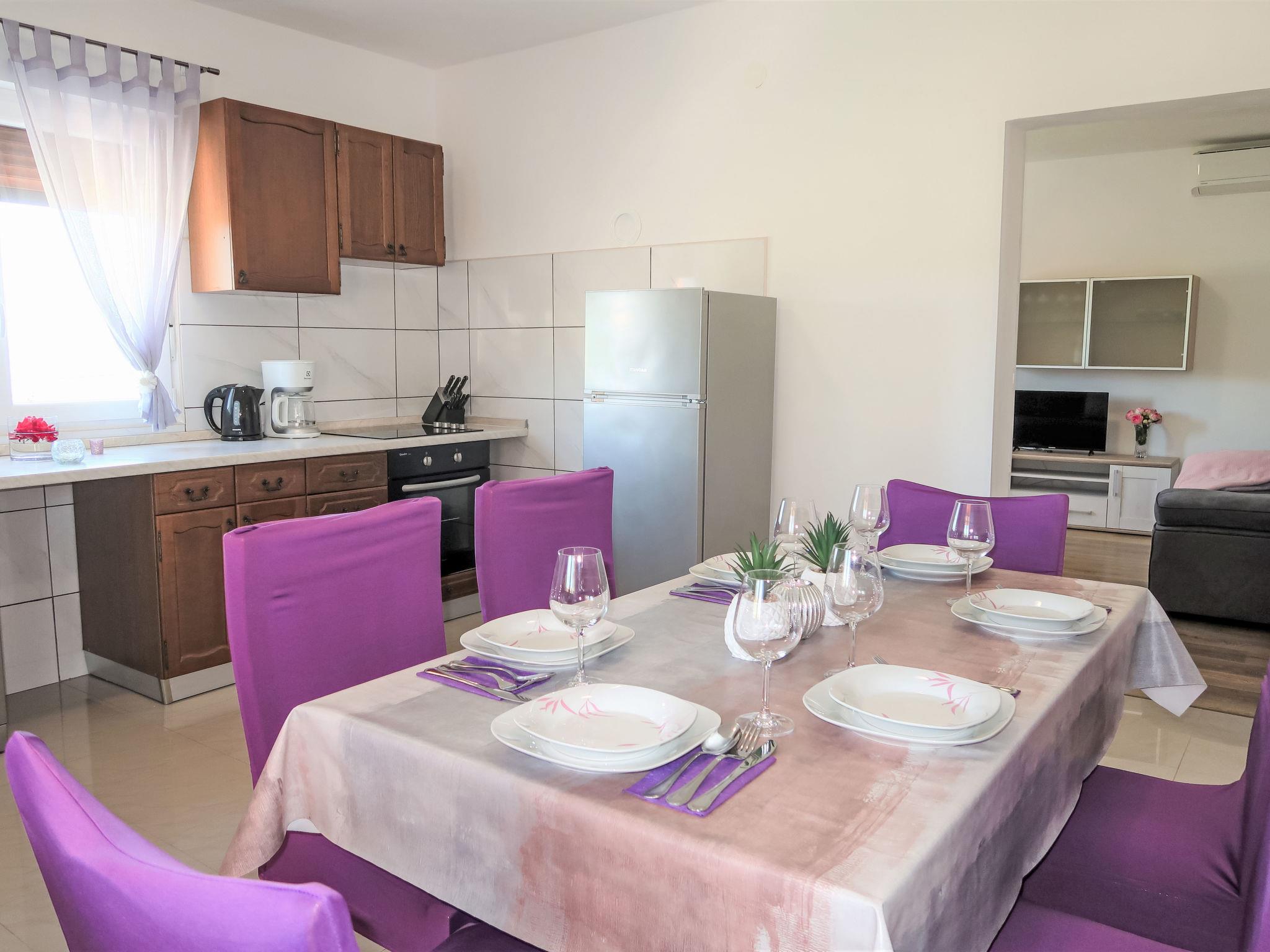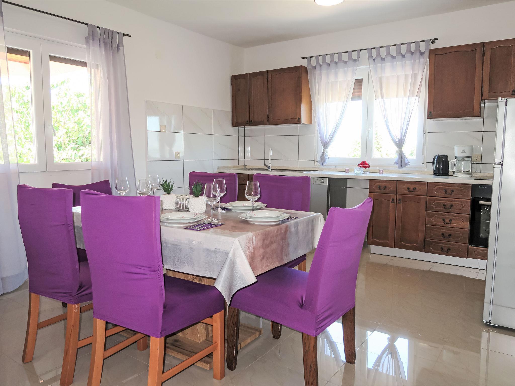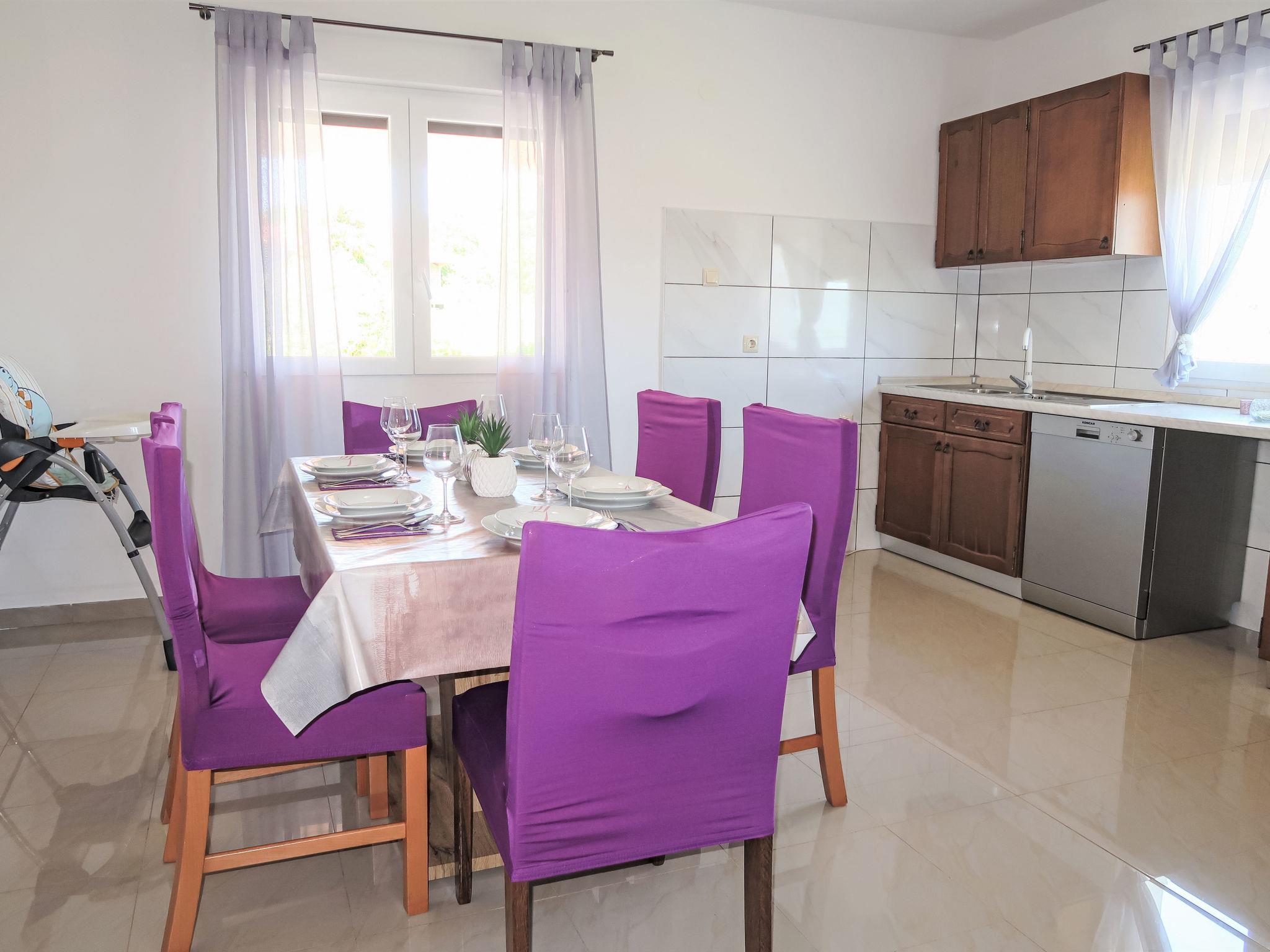 3-room house 75 m2. Living/dining room with 1 double sofabed (140 cm, length 200 cm), satellite TV and air conditioning. 2 rooms, each room with 1 double bed (2 x 80 cm, length 200 cm). Open kitchen (oven, dishwasher, 4 ceramic glass hob hotplates, toaster, kettle, microwave, freezer, electric coffee machine). Shower/WC. No heating option. Terrace 30 m2 partly roofed. Terrace furniture, deck chairs. Facilities: iron, children's high chair, baby cot. Internet (WiFi, free). Please note: non-smoking house.
